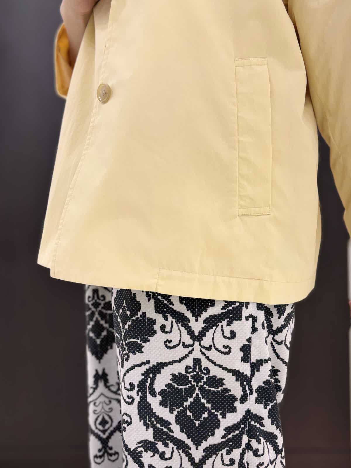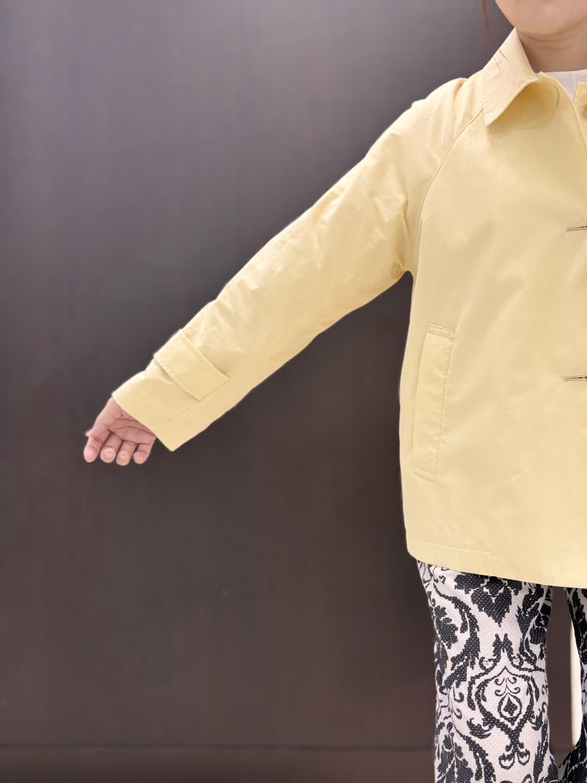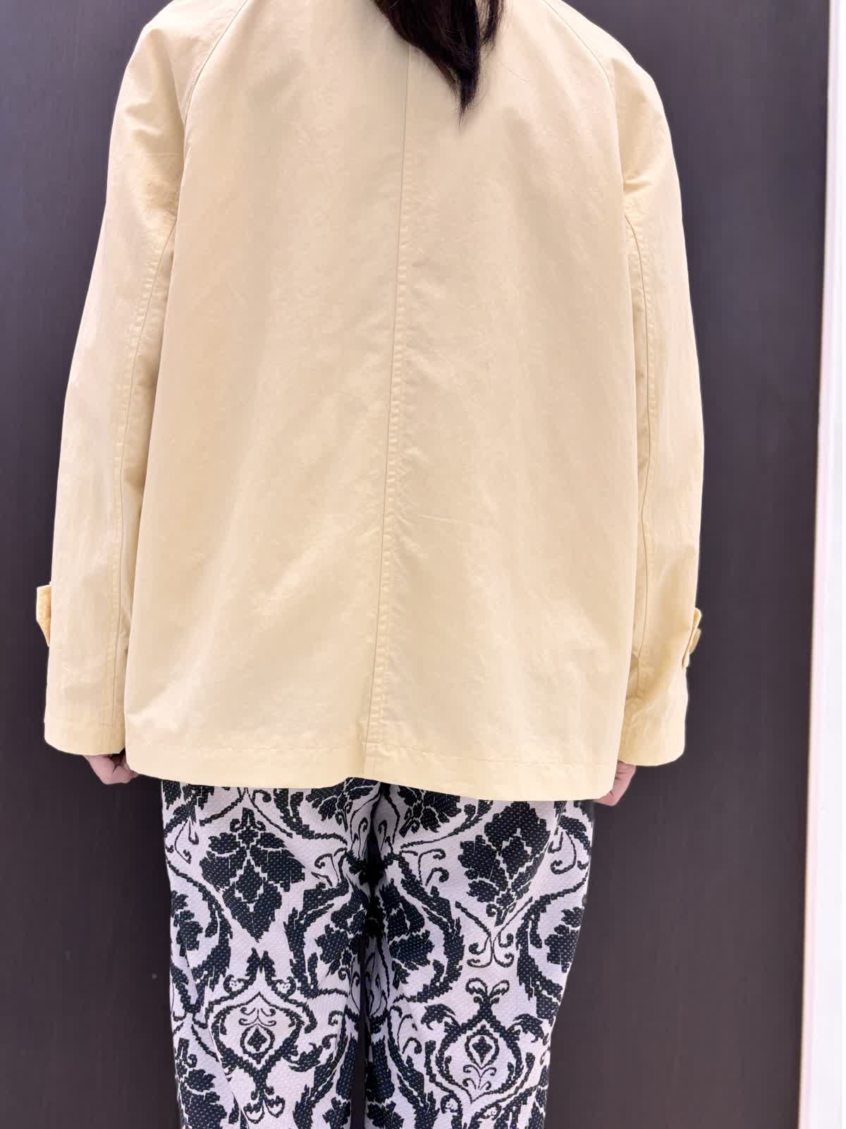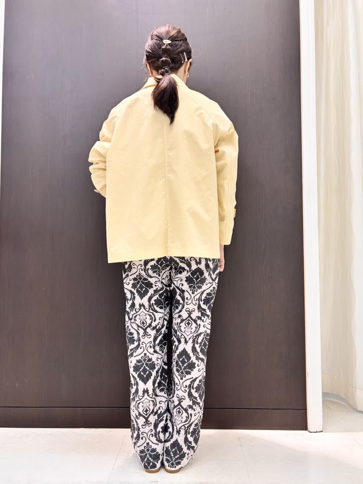 雨の日の寒暖差に持っておきたいのは撥水加工のコート。ゆとりがあるアームと身頃でフリーサイズ。ヒップにかかるくらいの着丈で雨の日も濡れにくく安心です。とても軽いので寒暖差で脱いでも手荷物になりません。ナイロン素材でシワも気せず過ごせます。裏地あり。柔らかめのイエローが気分も明るくしてくれます。インナーにはオフホワイトのカットソーを合わせて爽やかに。5分袖なので二の腕周りの気になる部分はカバーできます。インせずとも長くない着丈です。雨の日はパンツの裾が濡れてもすぐ乾くポリエステル素材がいいいです。柄物は濡れても目立ちにくいです。