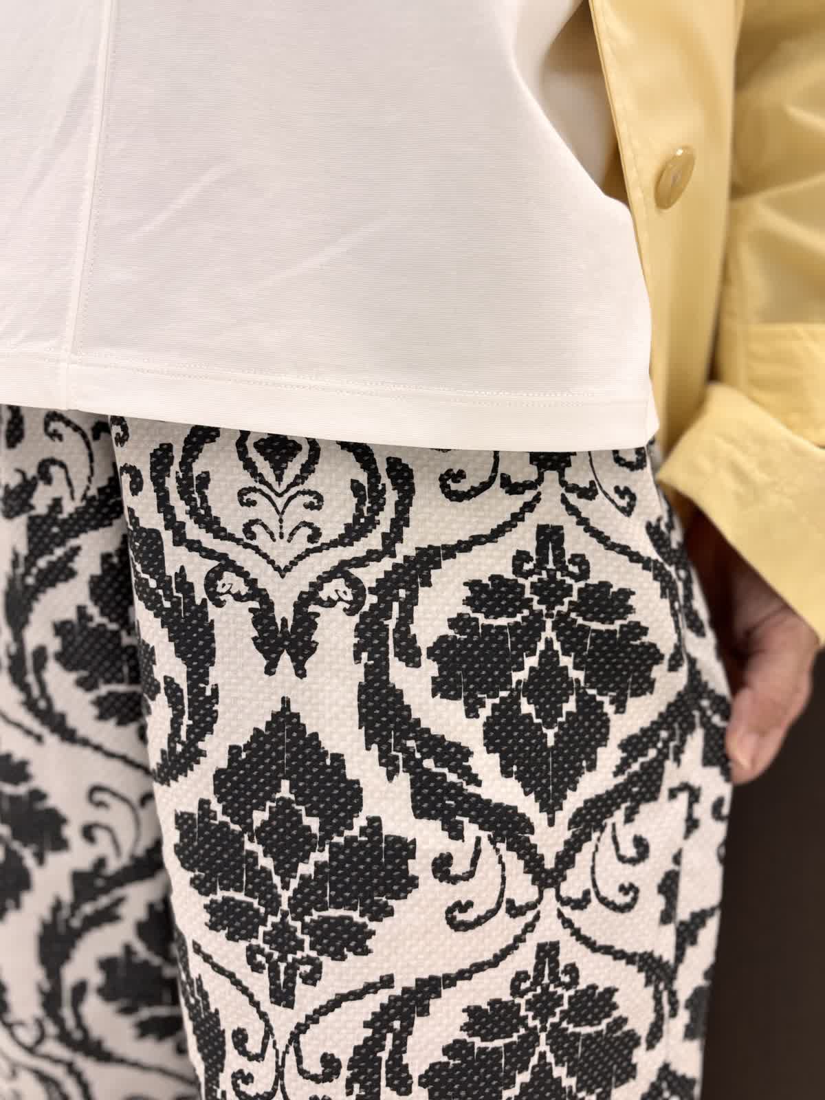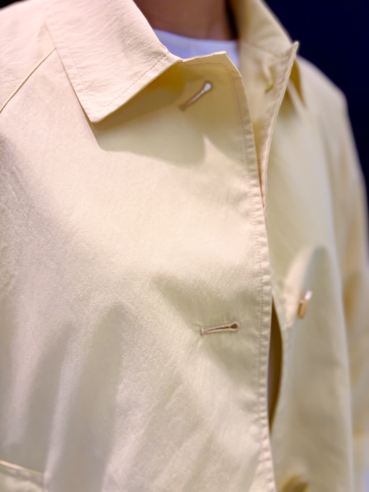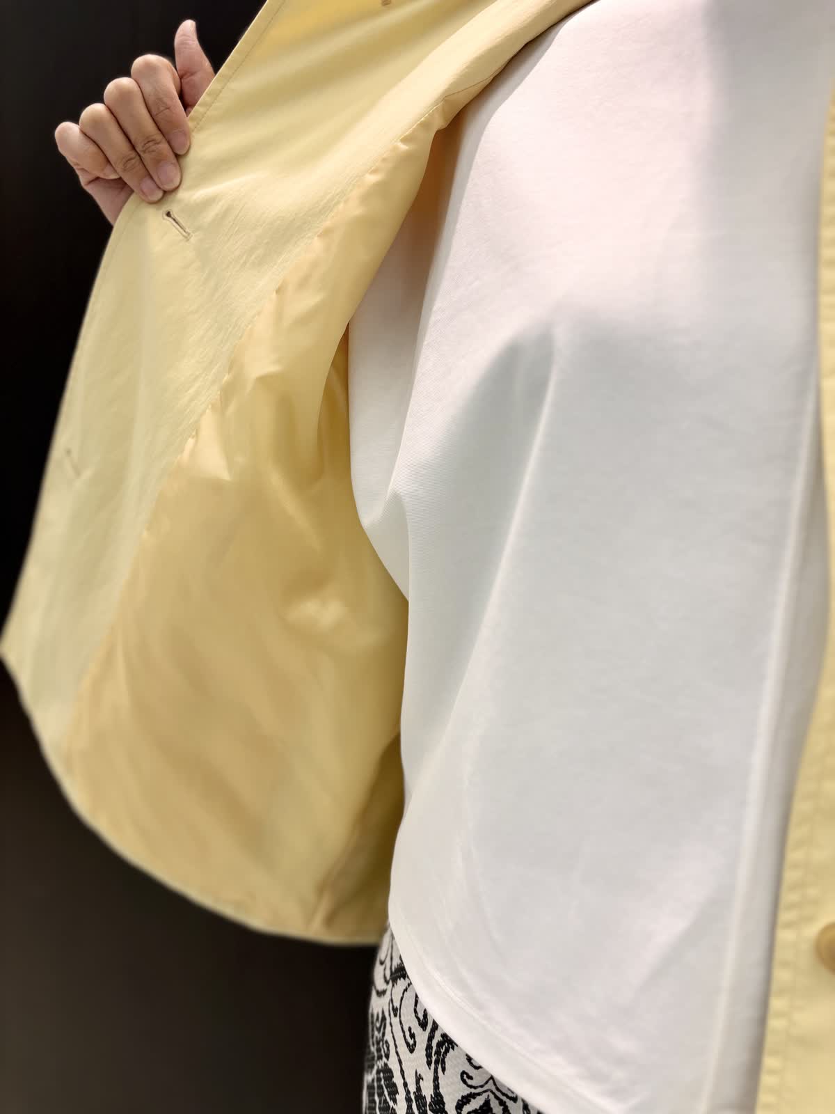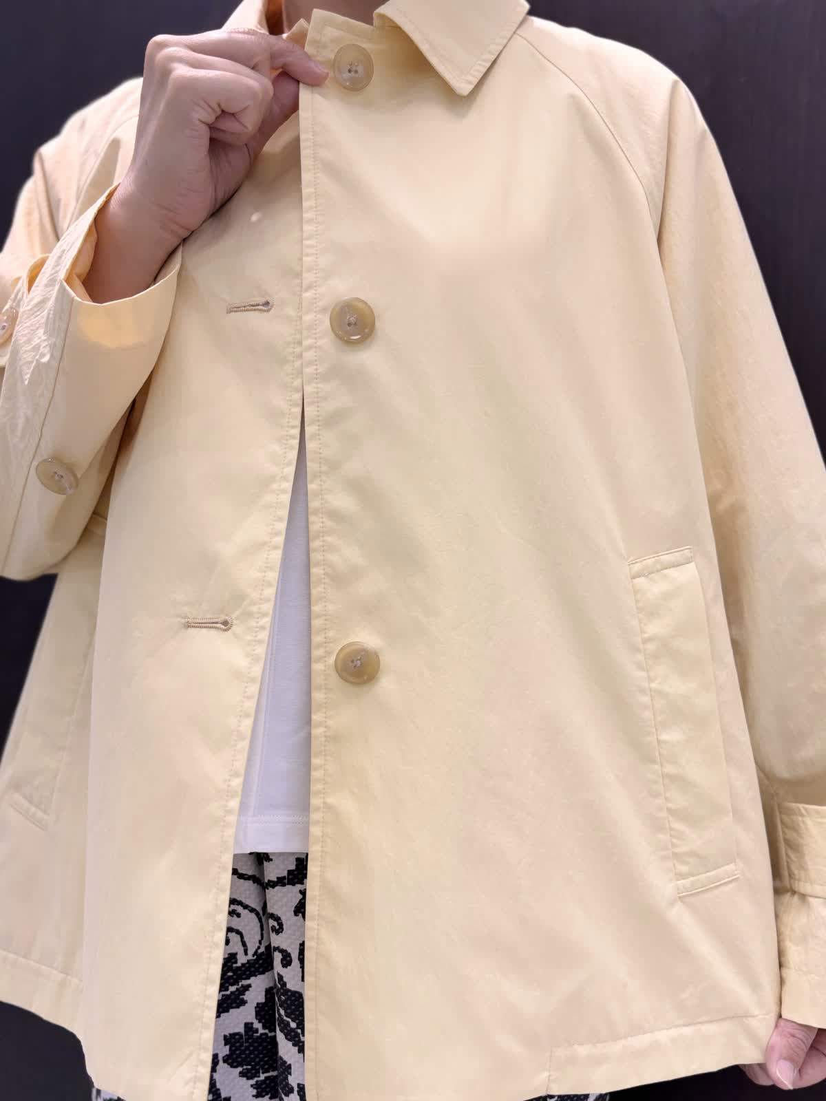 雨の日の寒暖差に持っておきたいのは撥水加工のコート。ゆとりがあるアームと身頃でフリーサイズ。ヒップにかかるくらいの着丈で雨の日も濡れにくく安心です。とても軽いので寒暖差で脱いでも手荷物になりません。ナイロン素材でシワも気せず過ごせます。裏地あり。柔らかめのイエローが気分も明るくしてくれます。インナーにはオフホワイトのカットソーを合わせて爽やかに。5分袖なので二の腕周りの気になる部分はカバーできます。インせずとも長くない着丈です。雨の日はパンツの裾が濡れてもすぐ乾くポリエステル素材がいいいです。柄物は濡れても目立ちにくいです。