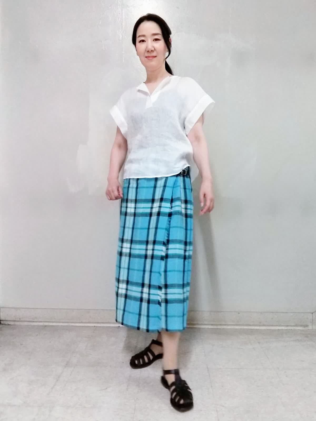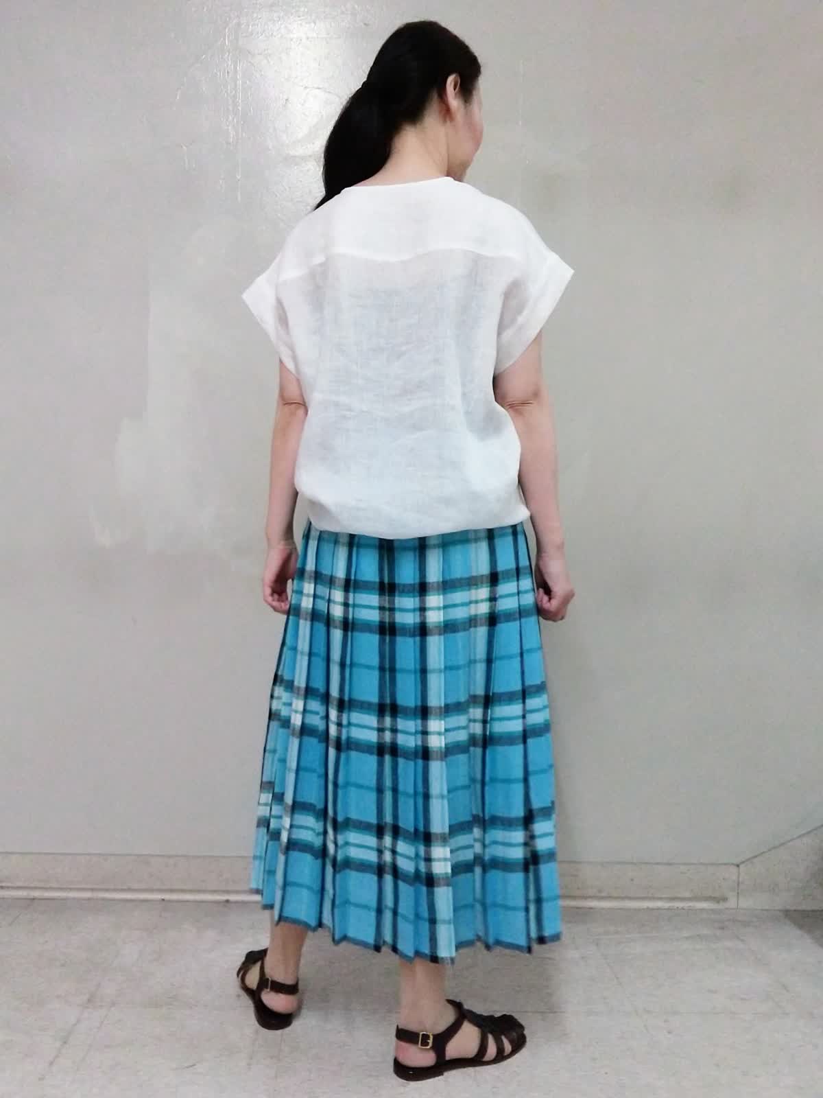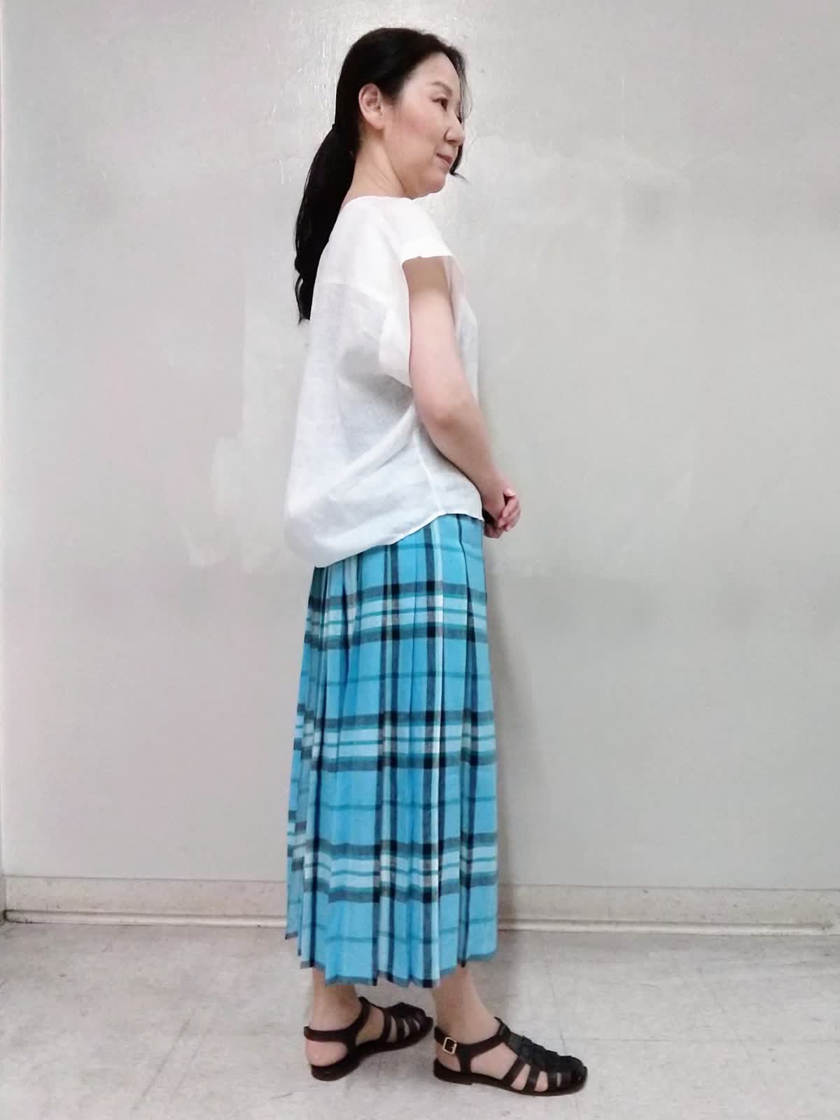 【着用サイズ】ブラウス:9号、キャミソール:9号、スカート:9号 【着用カラー】ブラウス:オフホワイト、キャミソール:スミクロ、スカート:サックス 麻素材アイテムで涼しくコーディネート。 暑い夏は、シャリ感のある涼しい素材。首もとがスッキリと開くブラウスとチェックがカワイイオニールのスカートでコーディネート。 ブラウスの裾はラウンドしているのでオーバーブラウスでゆるっとした着こなしに! スカートは後ろプリーツデザインで、脚さばききが良く動きやすいです。