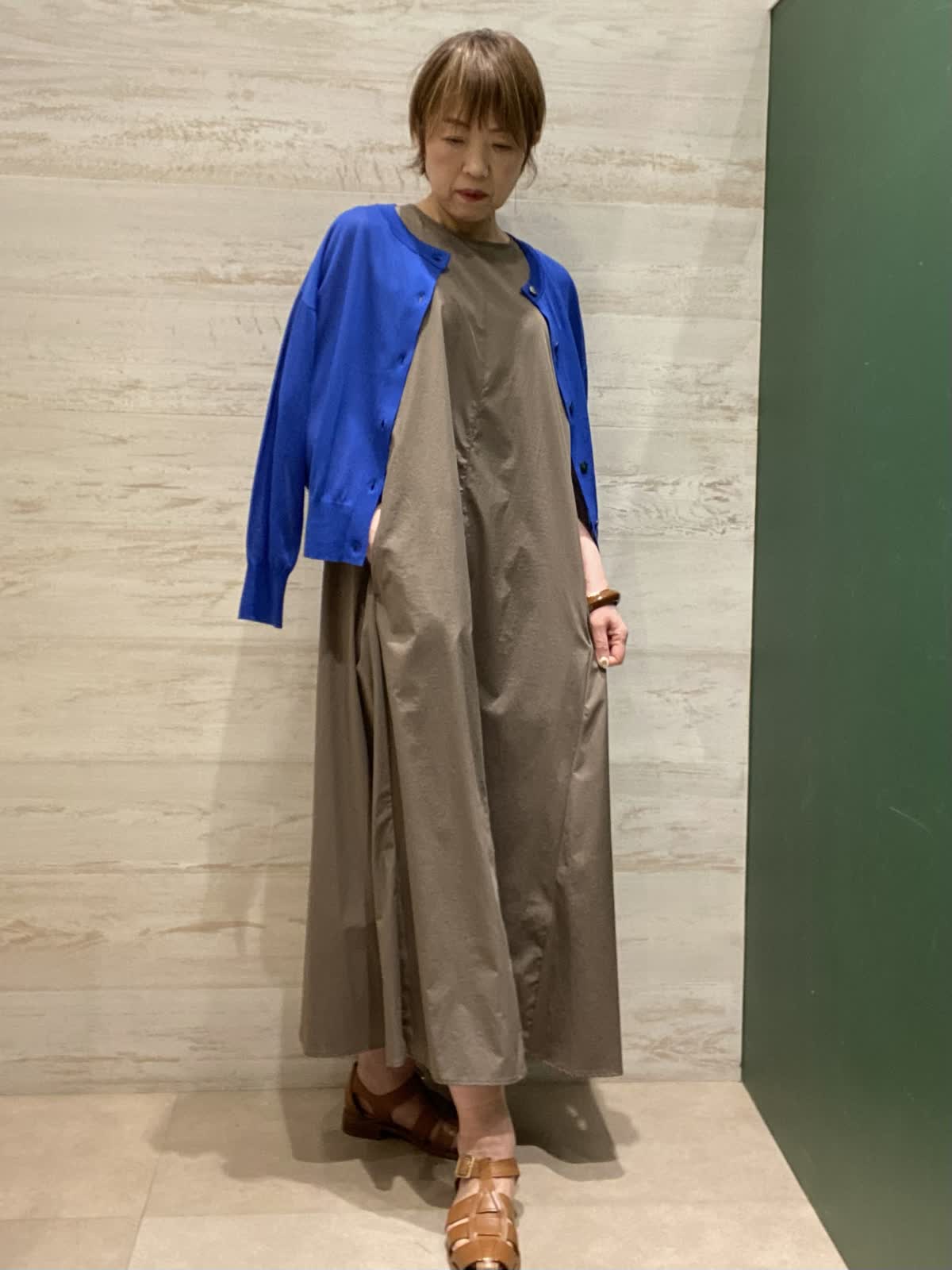 【着用カラー】ワンピース:カーキ カーディガン:ブルー 【着用サイズ】ワンピース:9号 カーディガン:フリー 夏のお出掛けにぴったりな軽くシワになりにくいワンピース。エアコンの効いた室内や腕が気になる方はシアーカーディガンが◎