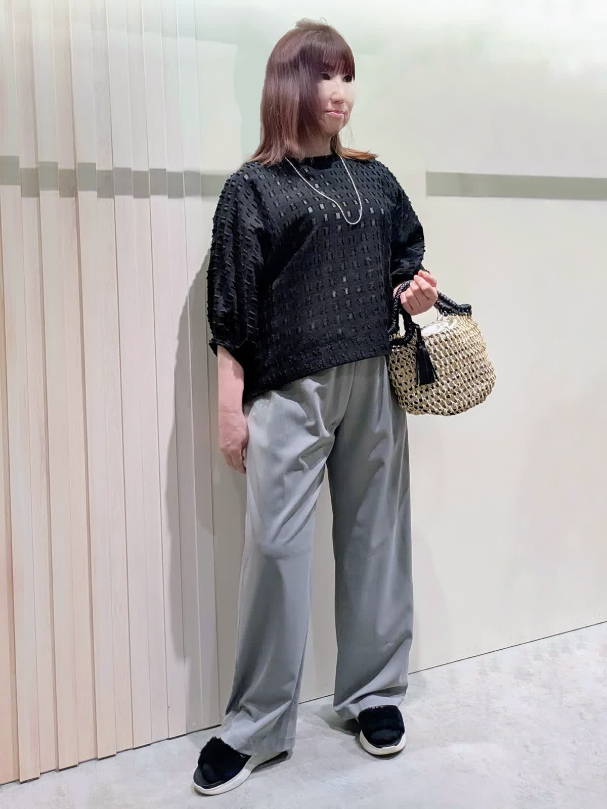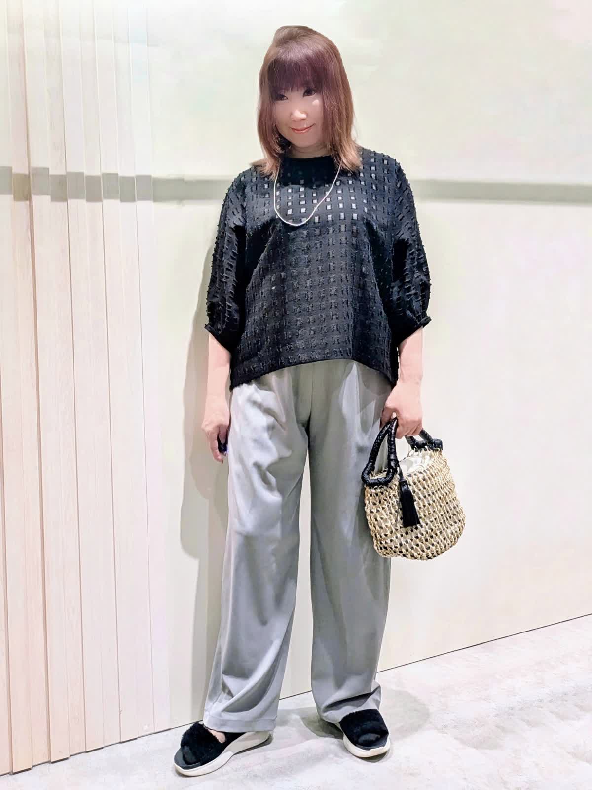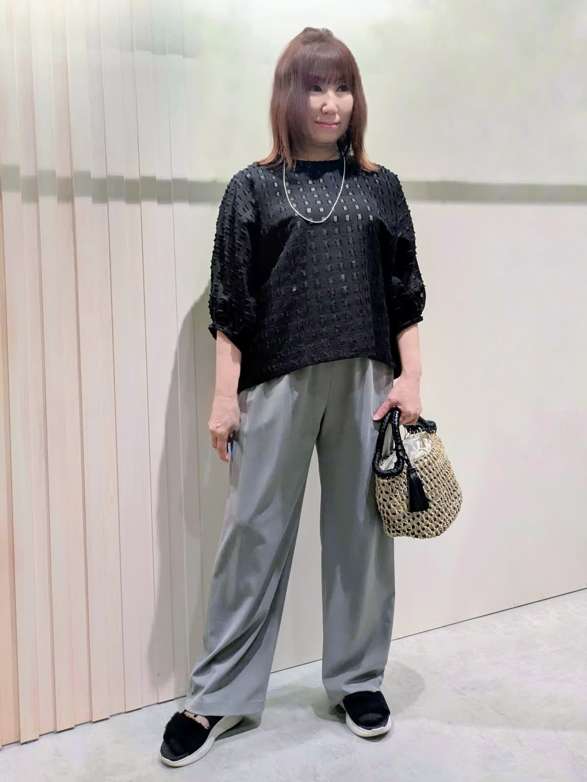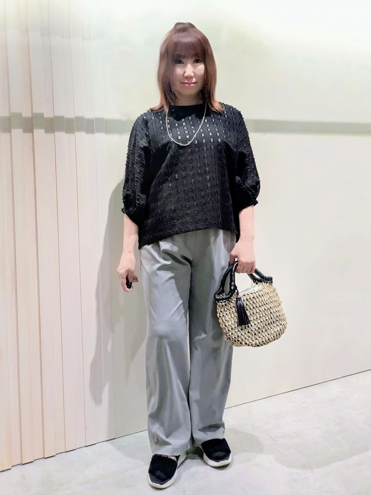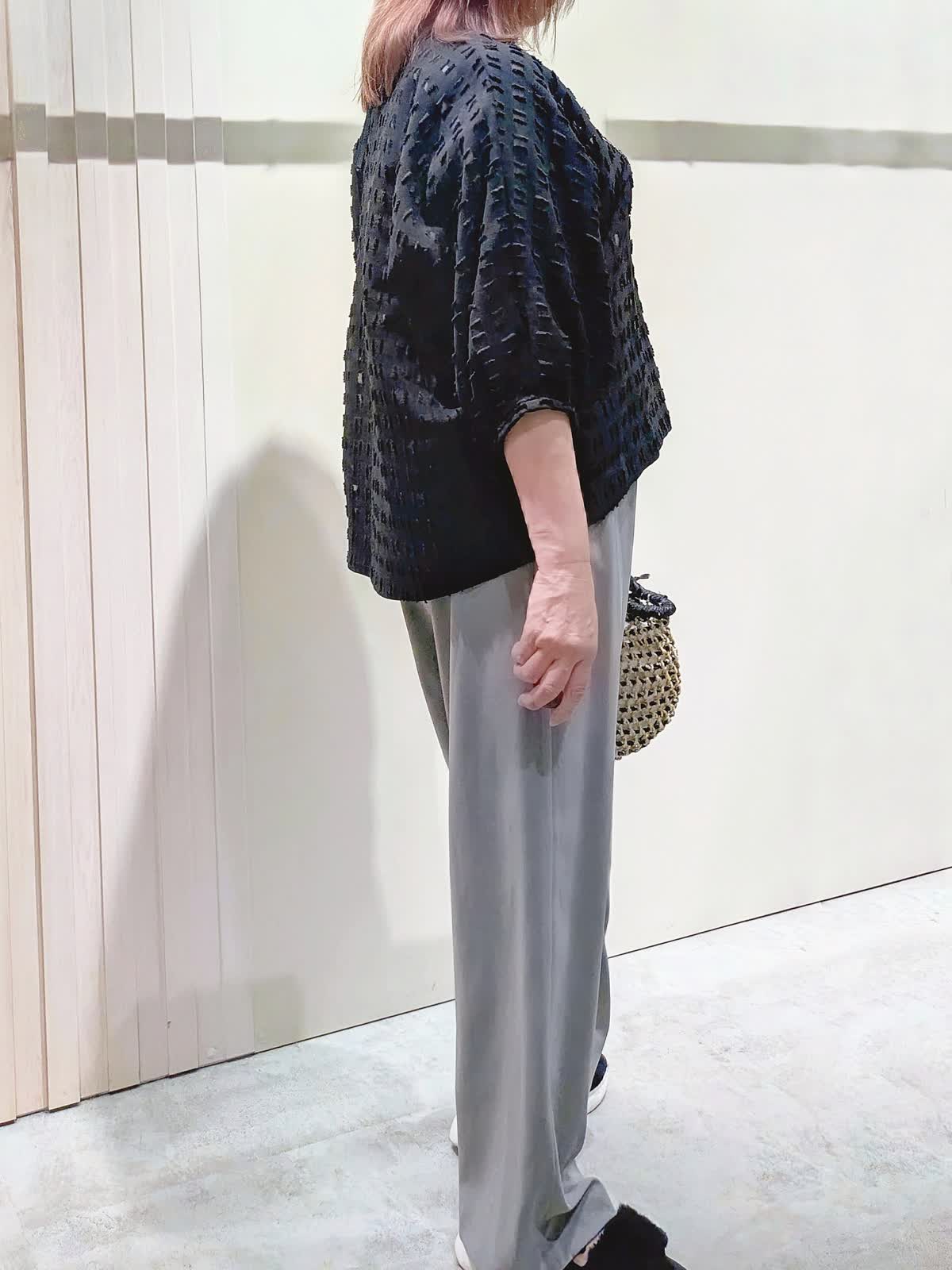 【着用サイズ】ブラウス、パンツ:フリーサイズ【着用カラー】ブラウス:ブラック パンツ:グレー 夏のお出掛けコーディネート カットジャガードのブラウスは、シアー感を表現した涼しげな素材感で表情豊かな凹凸感のあるスタイリングのポイントになる1枚です。軽やかな素材感のワイドパンツは、程よいシルエットでキレイ目にもカジュアルにも使え、ウエストゴムのドロスト仕様ではき心地も楽ちんです。