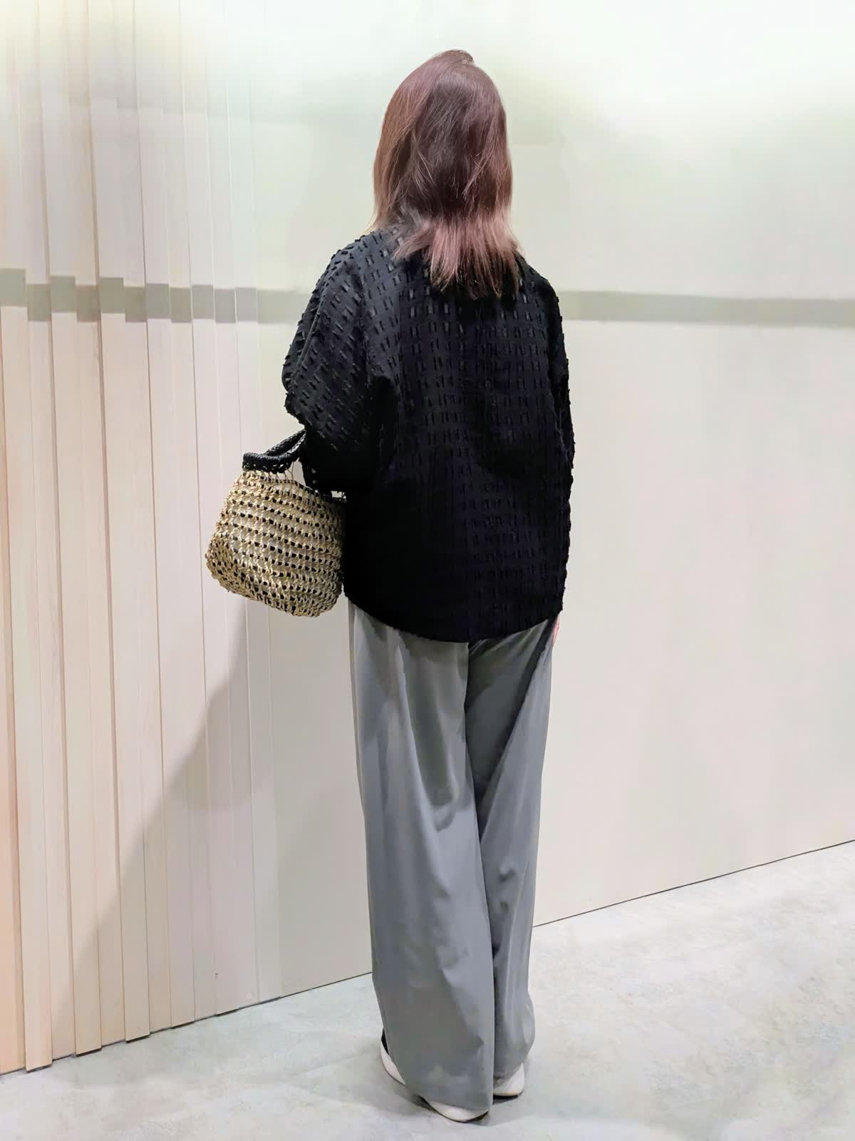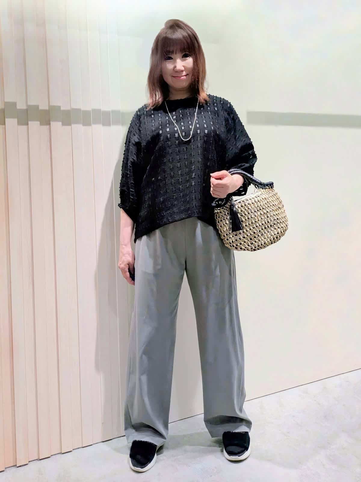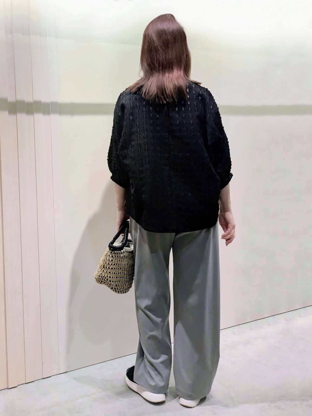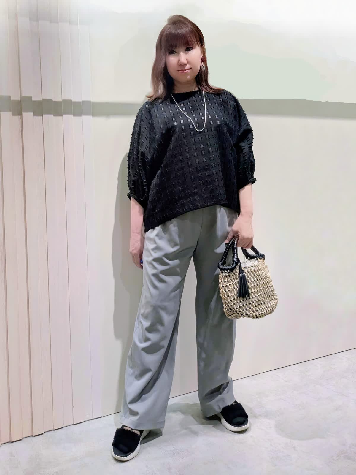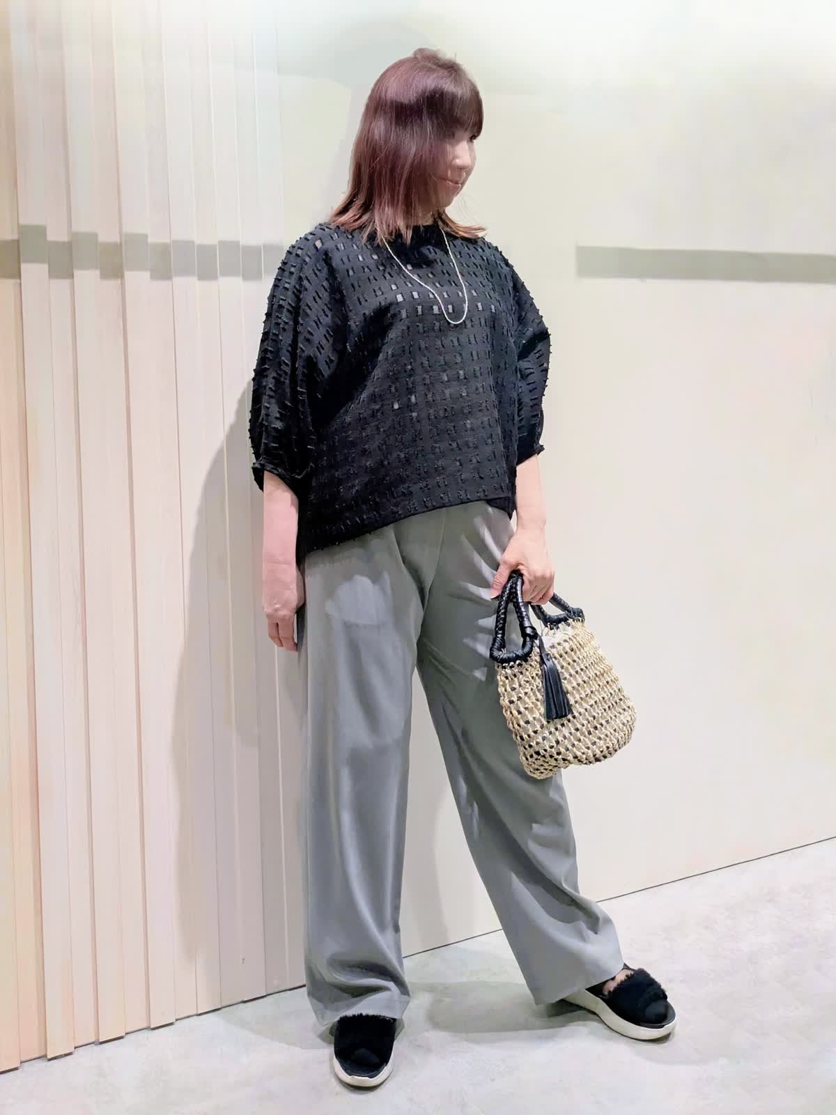 【着用サイズ】ブラウス、パンツ:フリーサイズ【着用カラー】ブラウス:ブラック パンツ:グレー 夏のお出掛けコーディネート カットジャガードのブラウスは、シアー感を表現した涼しげな素材感で表情豊かな凹凸感のあるスタイリングのポイントになる1枚です。軽やかな素材感のワイドパンツは、程よいシルエットでキレイ目にもカジュアルにも使え、ウエストゴムのドロスト仕様ではき心地も楽ちんです。