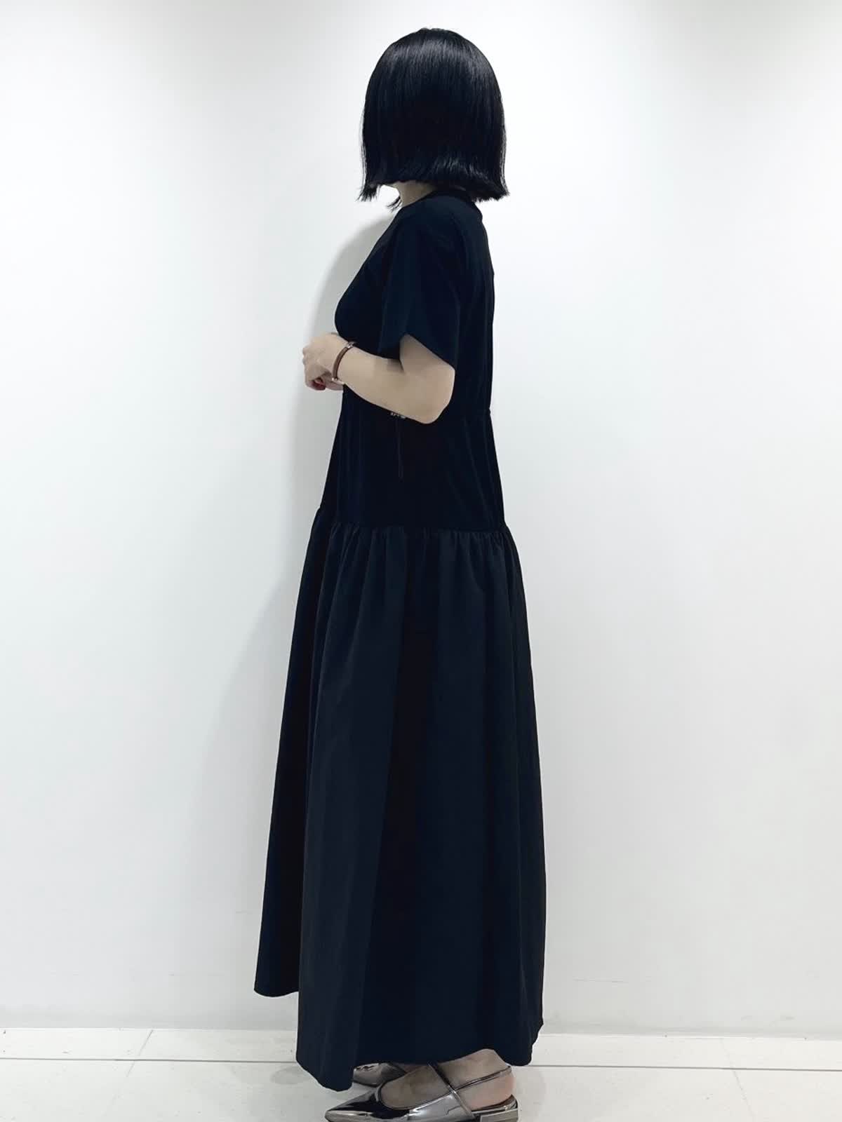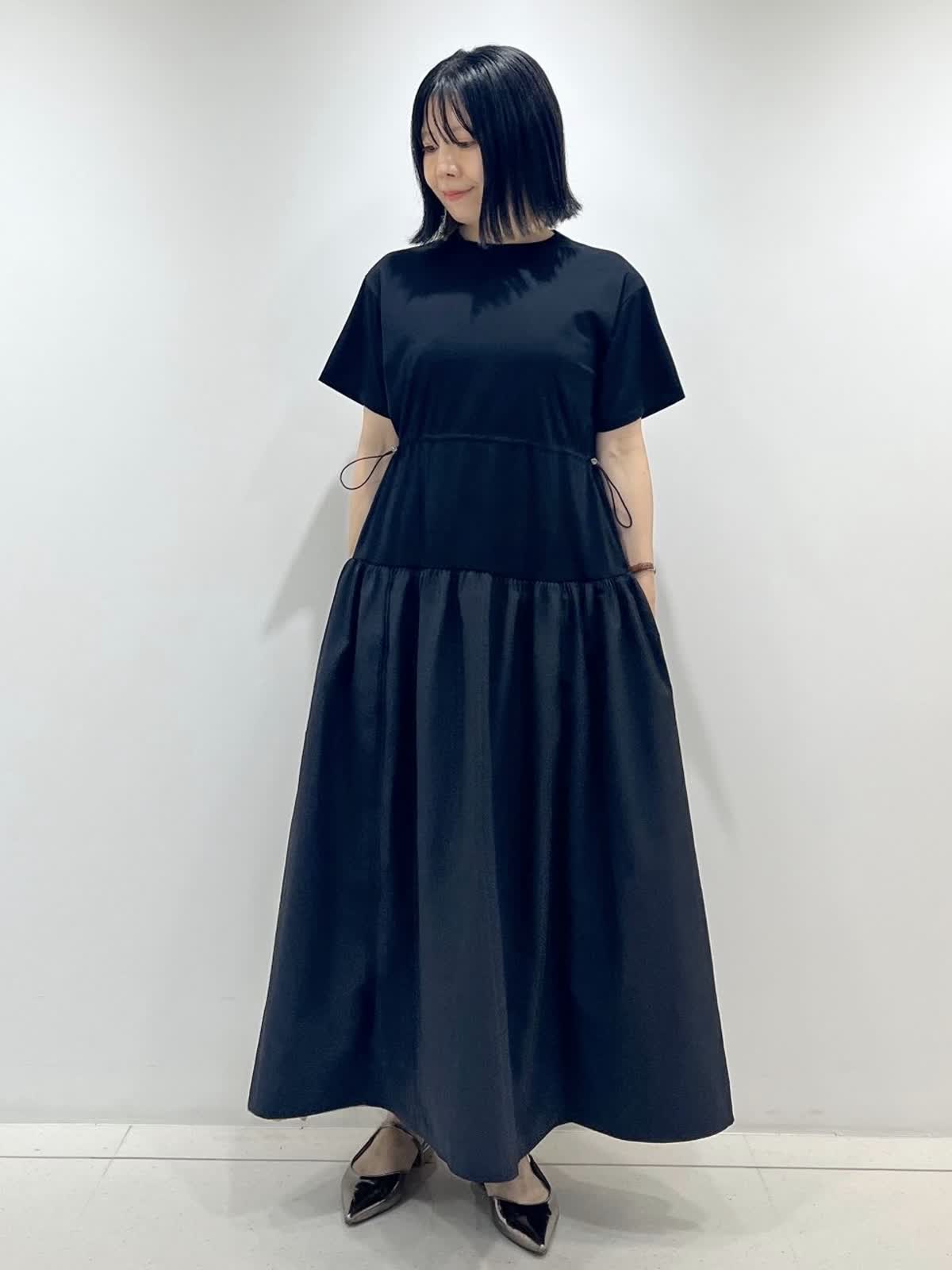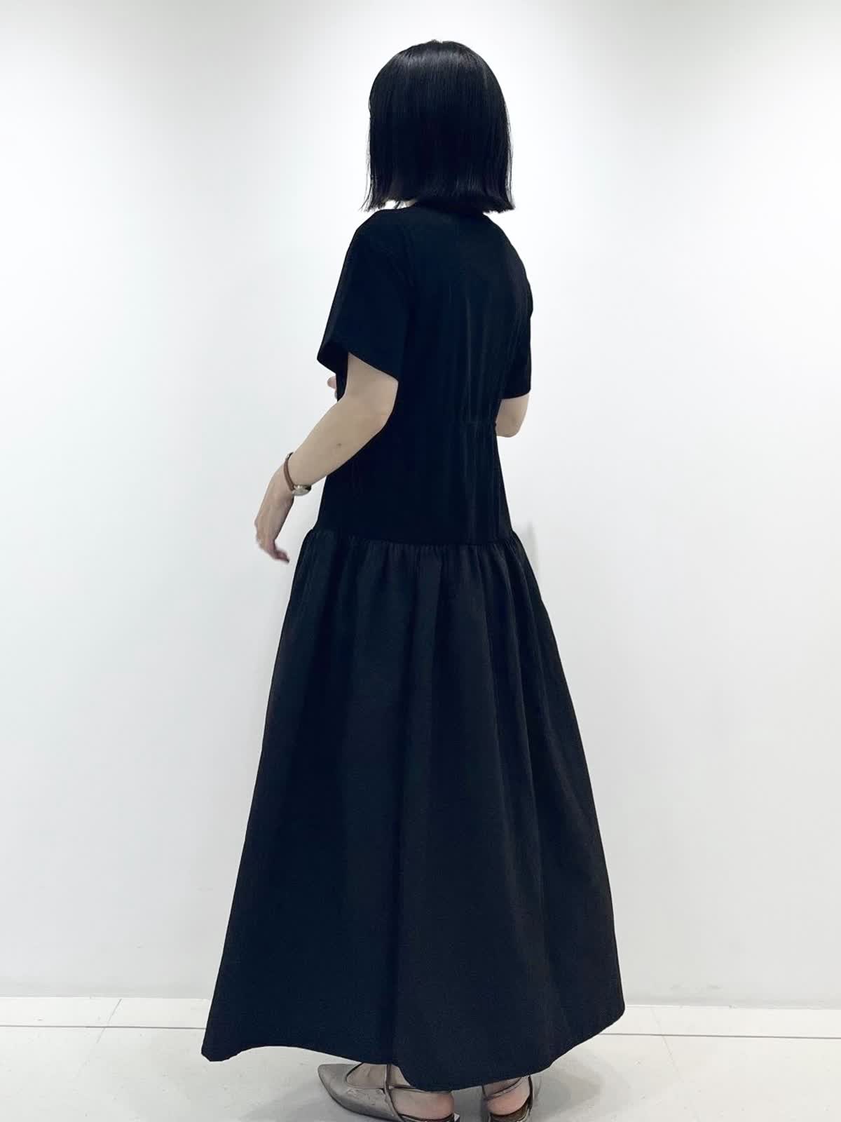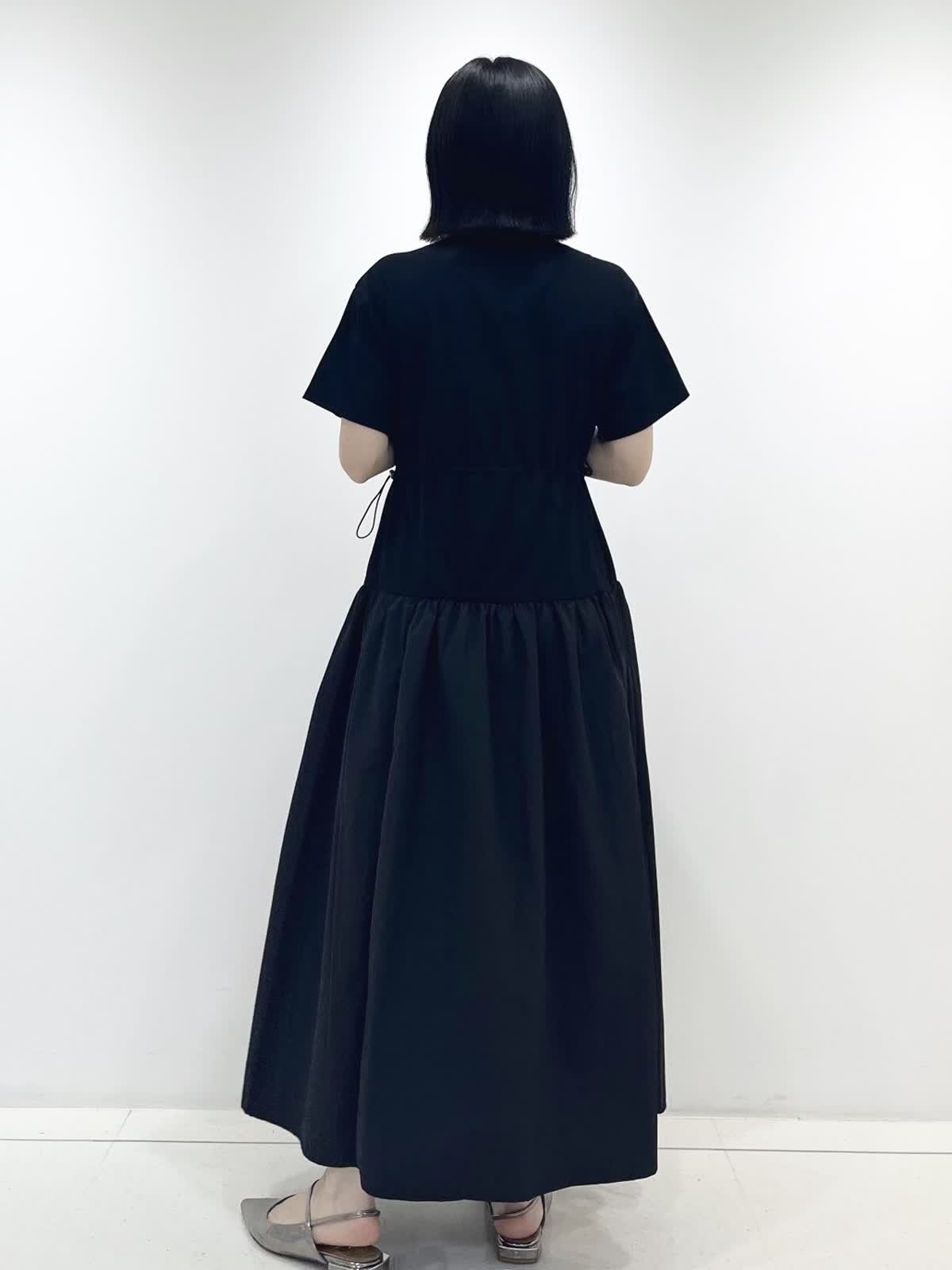 【着用サイズ】ワンピース:9号/ ブラック 上身頃はTシャツ、スカート部分はタフタ素材のドッキングワンピース。ウエスト部分のドロストでシルエットの変化も楽しめ、体型カバーもできる一枚。 これからの季節に大活躍のアイテムです!