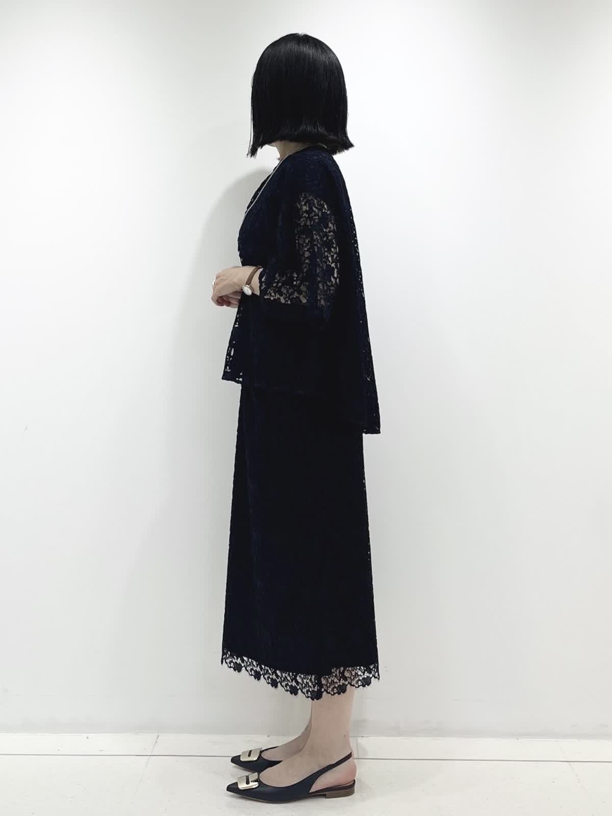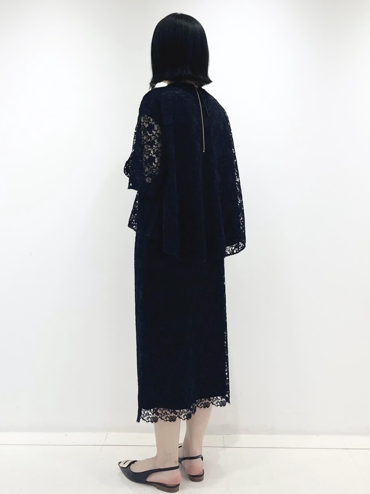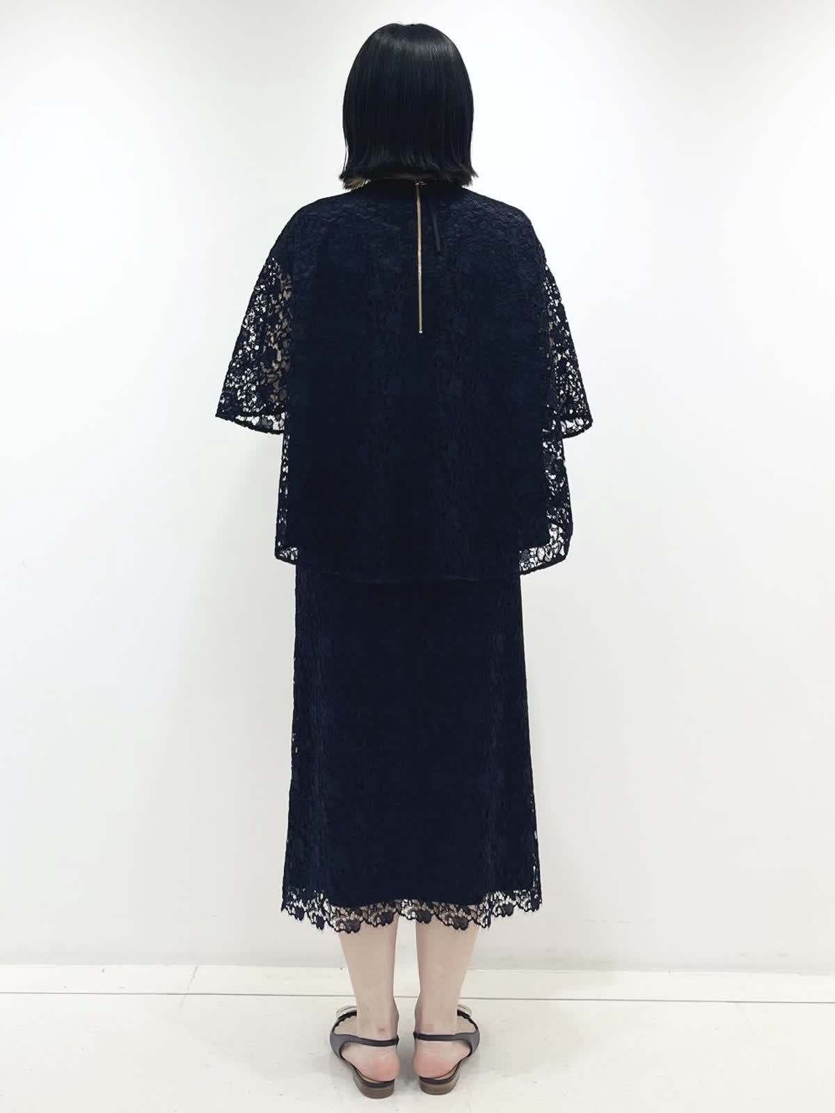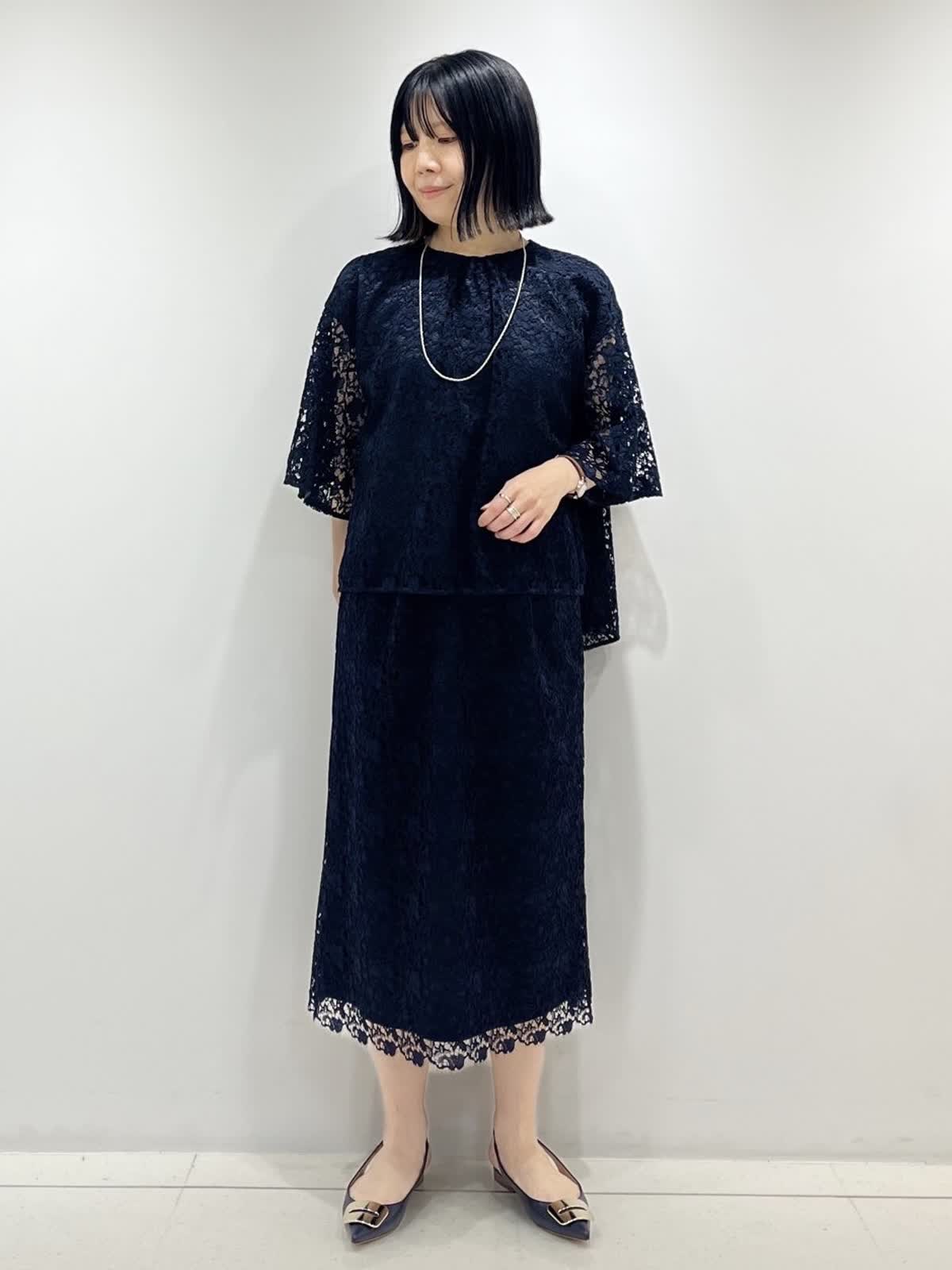 【着用サイズ】ブラウス:9号/ ネイビー スカート:9号/ネイビー レースのセットアップスタイル。お食事会やお仕事、セレモニーシーンでも大活躍!! セットでワンピース風に、単品で合わせても華やかさをプラスできるアイテムなので、キレイめスタイリングにお勧めのレースアイテムです!