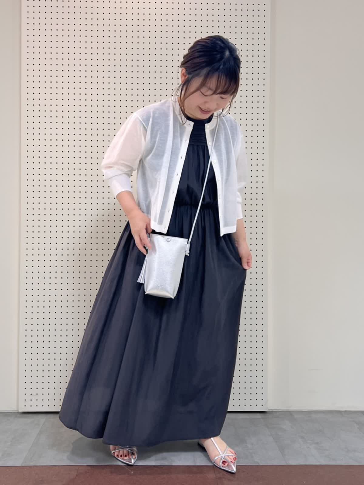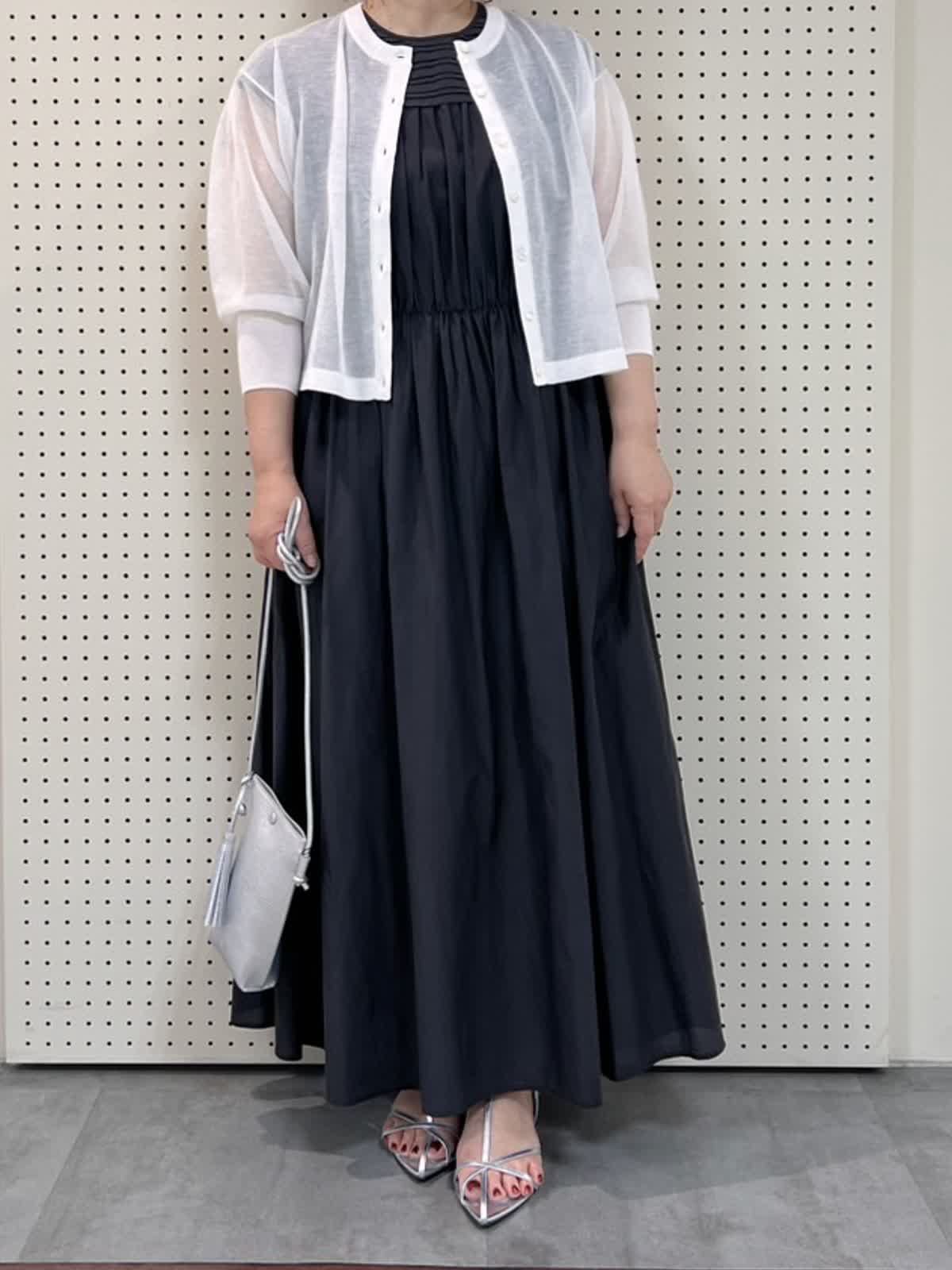 【着用サイズ/カラー】カーディガン:9号/オフホワイト ワンピース:9号/モカチャ バッグ:フリー/シルバー 夏のワンピースコーディネート。ワンピースはさらっとしていて涼しく、ウエストがゆるめのゴムになっていて着心地が良いです。袖もフレンチスリーブで1枚でも着やすいですが、腕をだすのは‥という方にはシアーカーディガンがおすすめです!