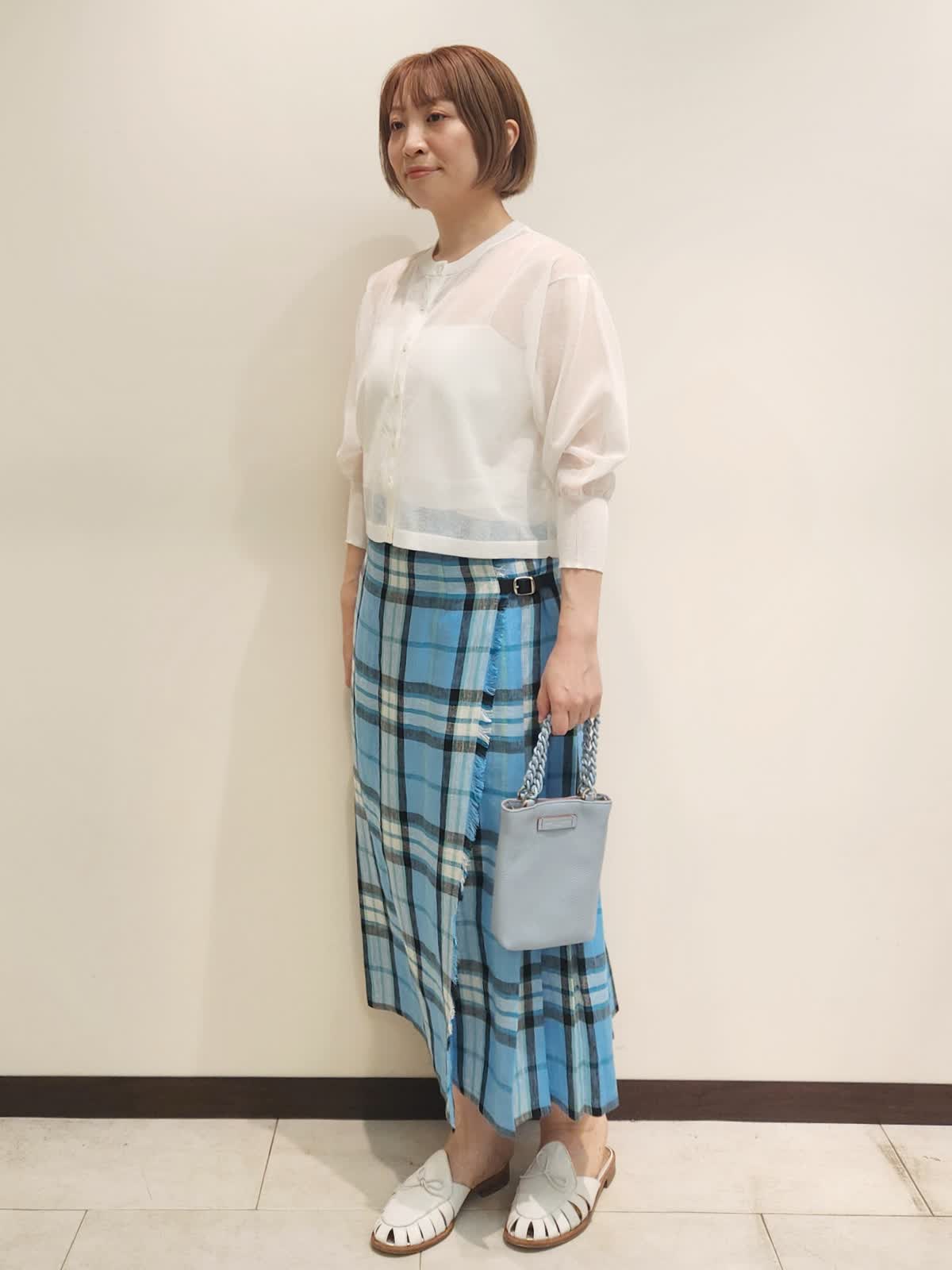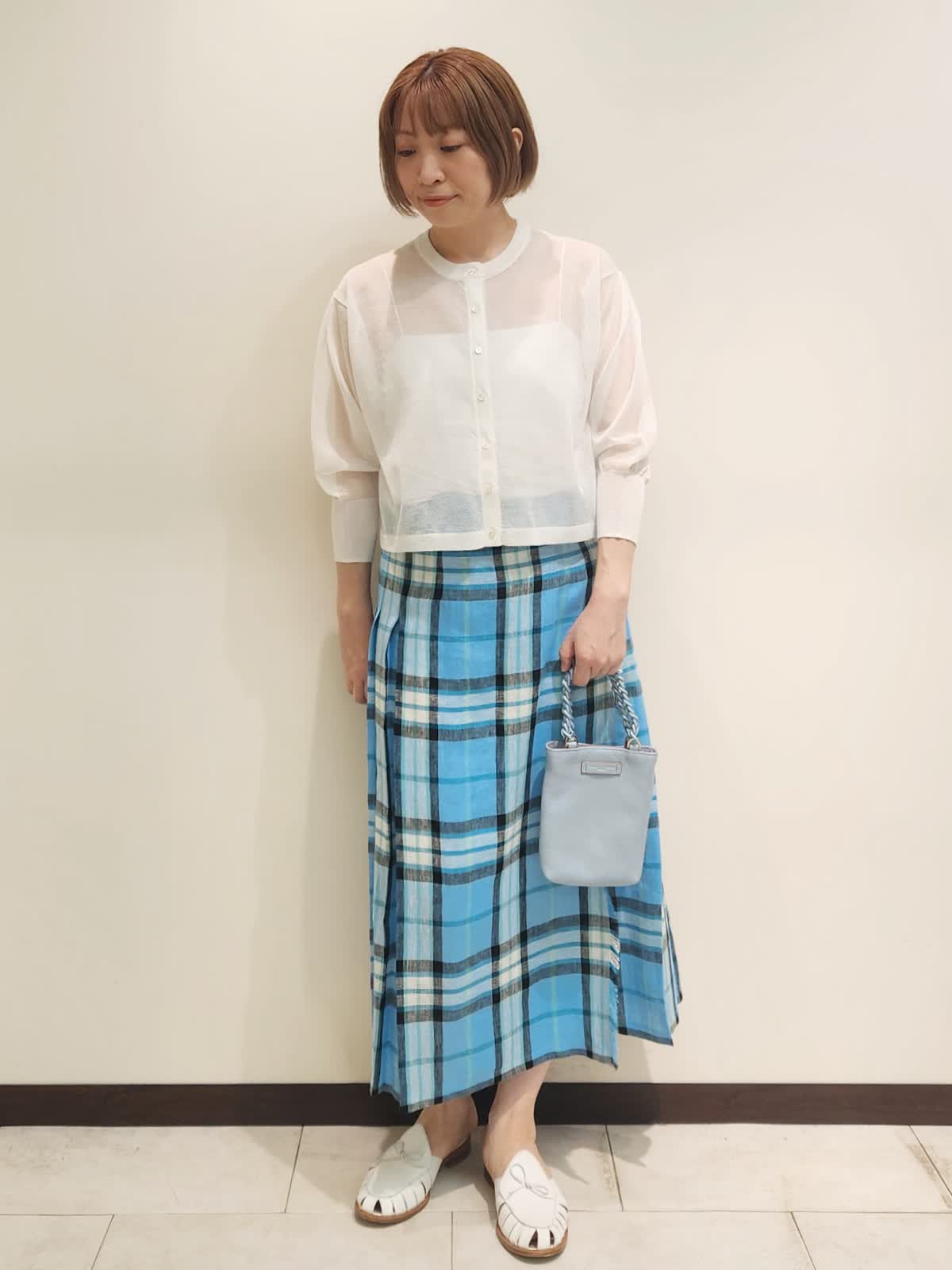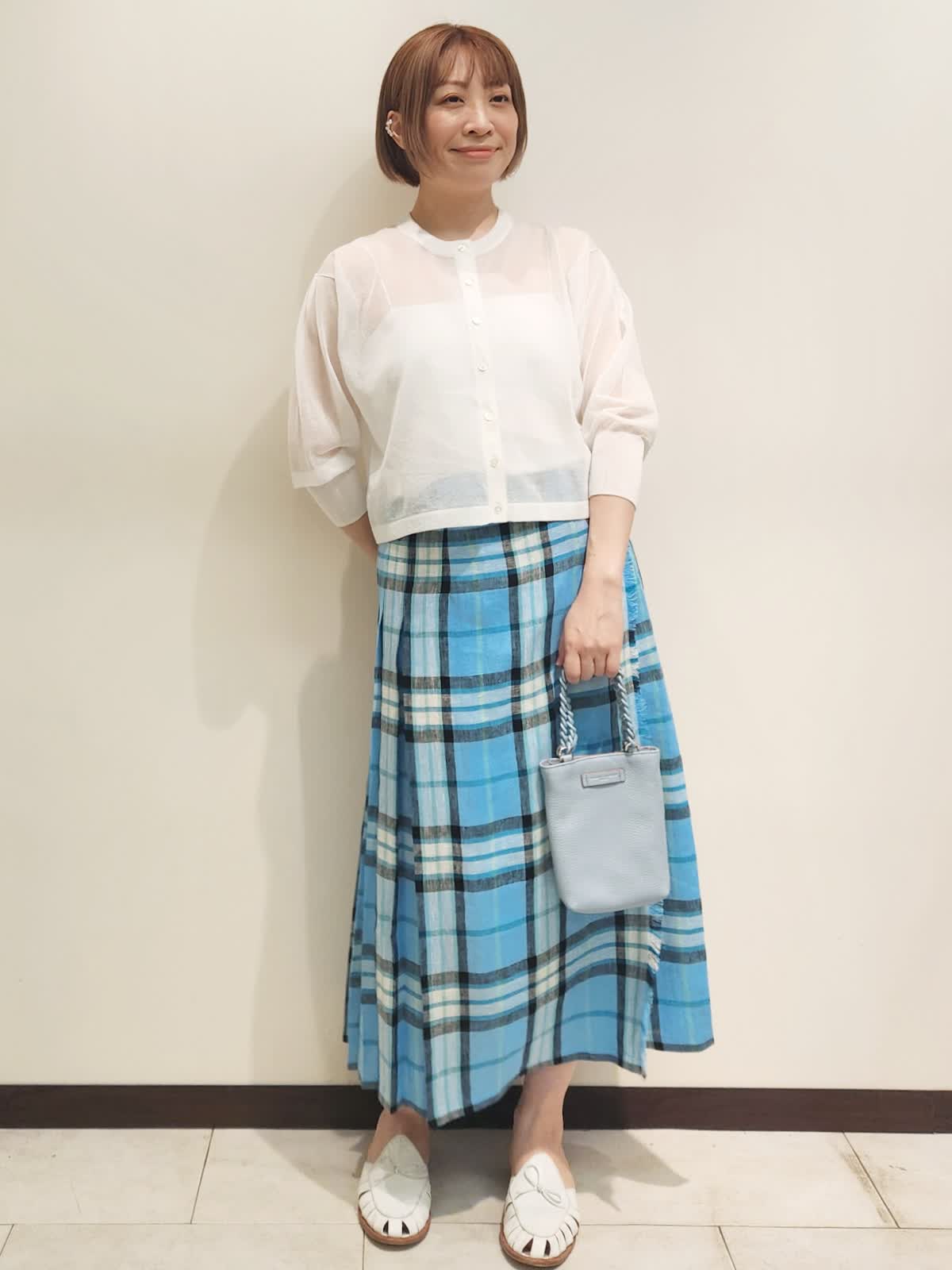 【着用サイズ】全て9号 【着用カラー】カーディガン:オフホワイト スカート:サックス O'NEIL OF DUBLIN夏のチェックスカートを主役コーディネート。 鮮やかなチェックスカートはリネンを感じる爽やか素材。 シアーカーディガンがあれば主役を引き立てつつ、ありがちなコーディネートにはなりません!! バックはブルーをチョイスしてトーンを合わせました。