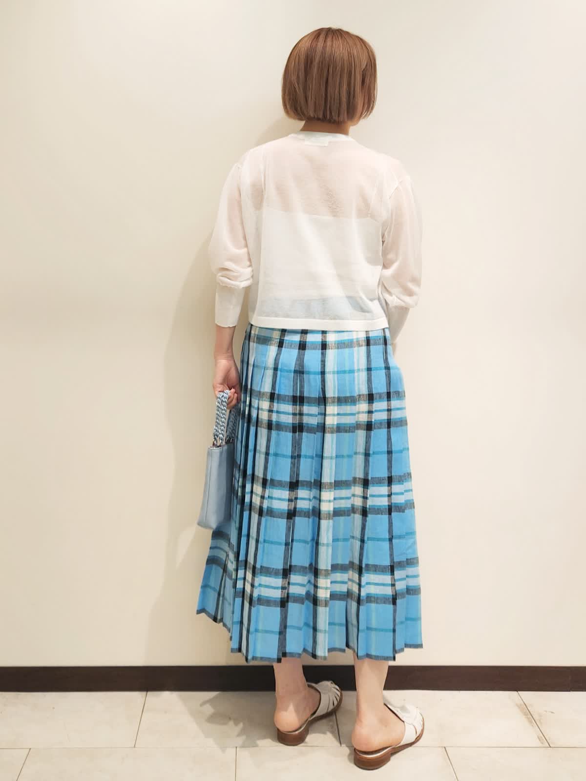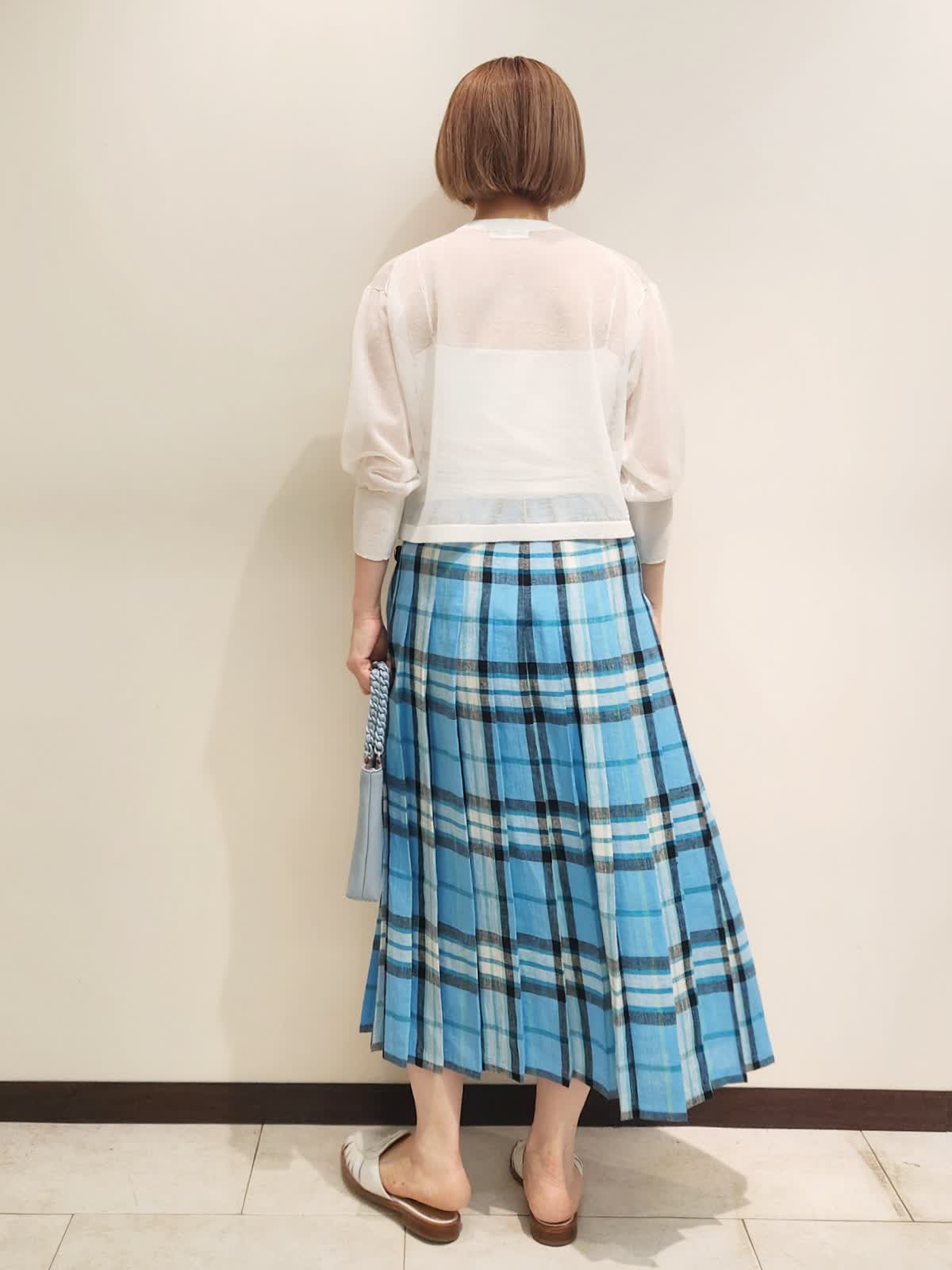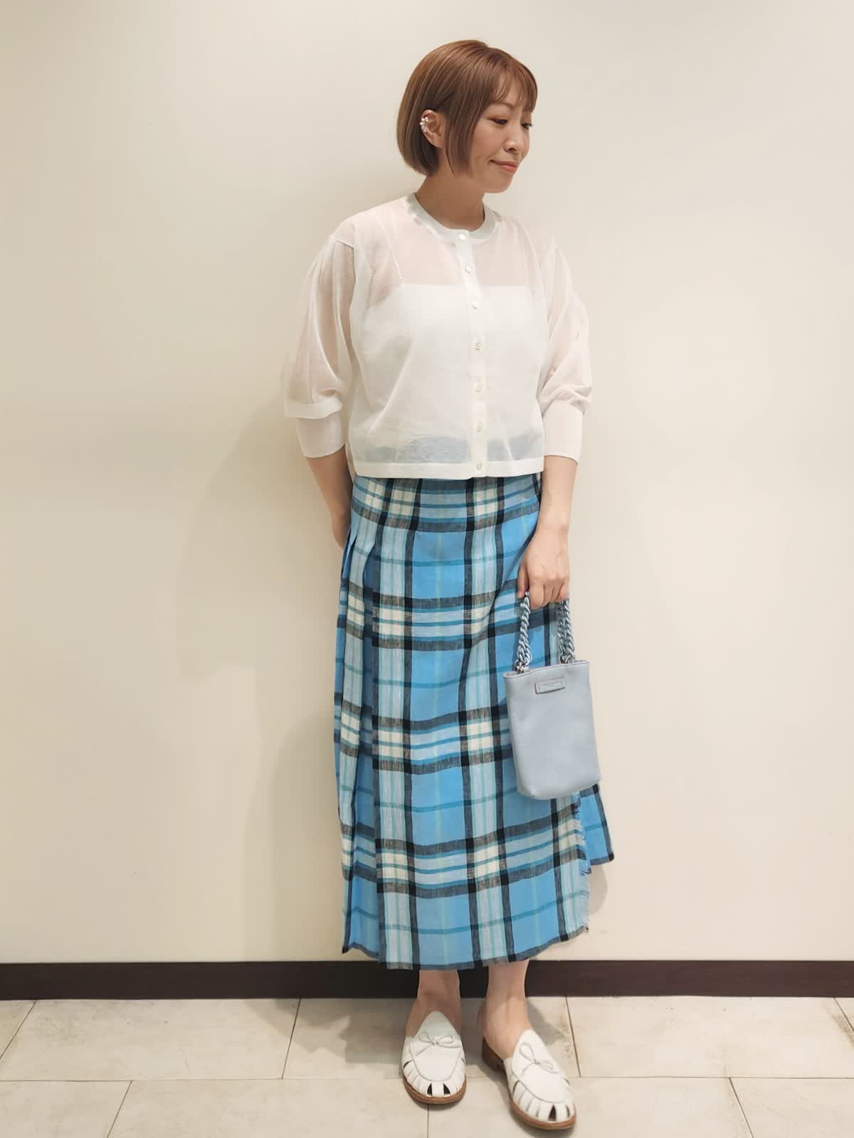 【着用サイズ】全て9号 【着用カラー】カーディガン:オフホワイト スカート:サックス O'NEIL OF DUBLIN夏のチェックスカートを主役コーディネート。 鮮やかなチェックスカートはリネンを感じる爽やか素材。 シアーカーディガンがあれば主役を引き立てつつ、ありがちなコーディネートにはなりません!! バックはブルーをチョイスしてトーンを合わせました。