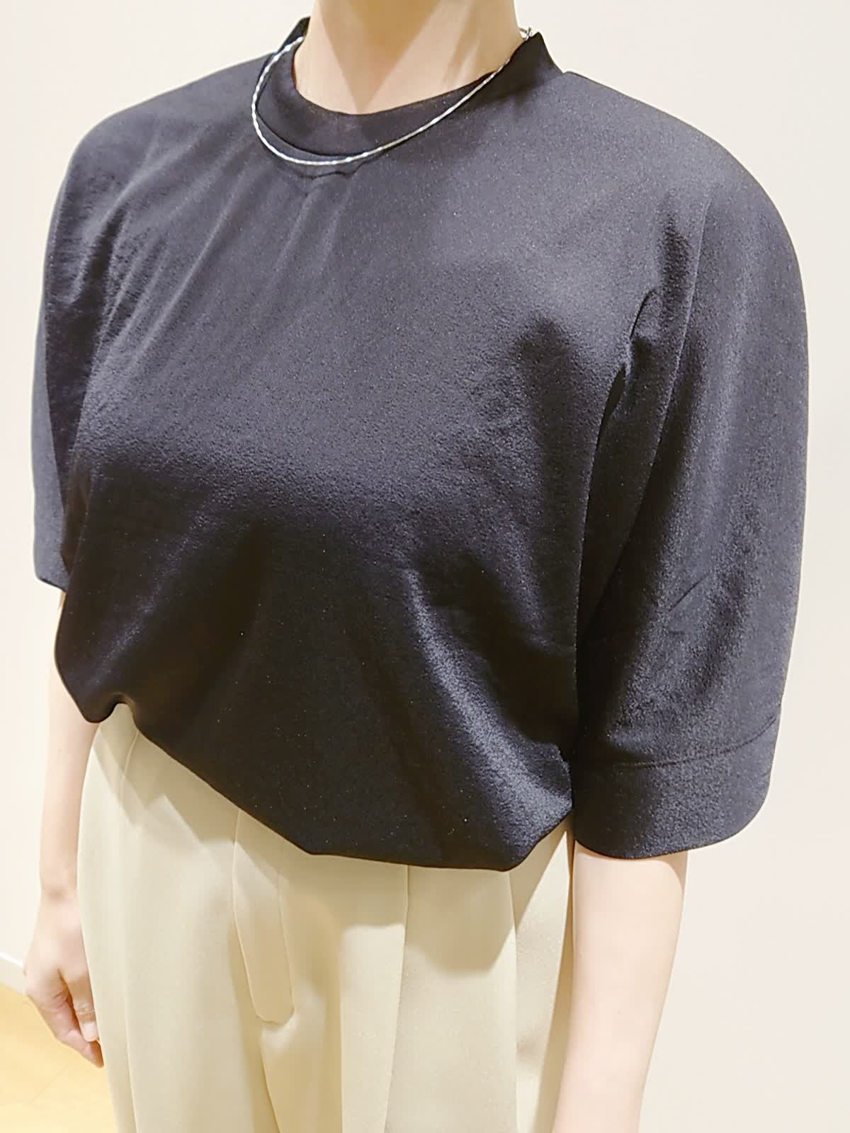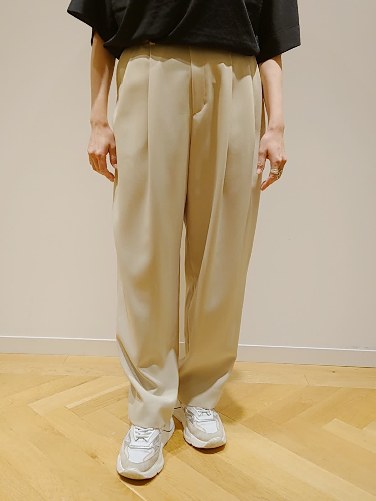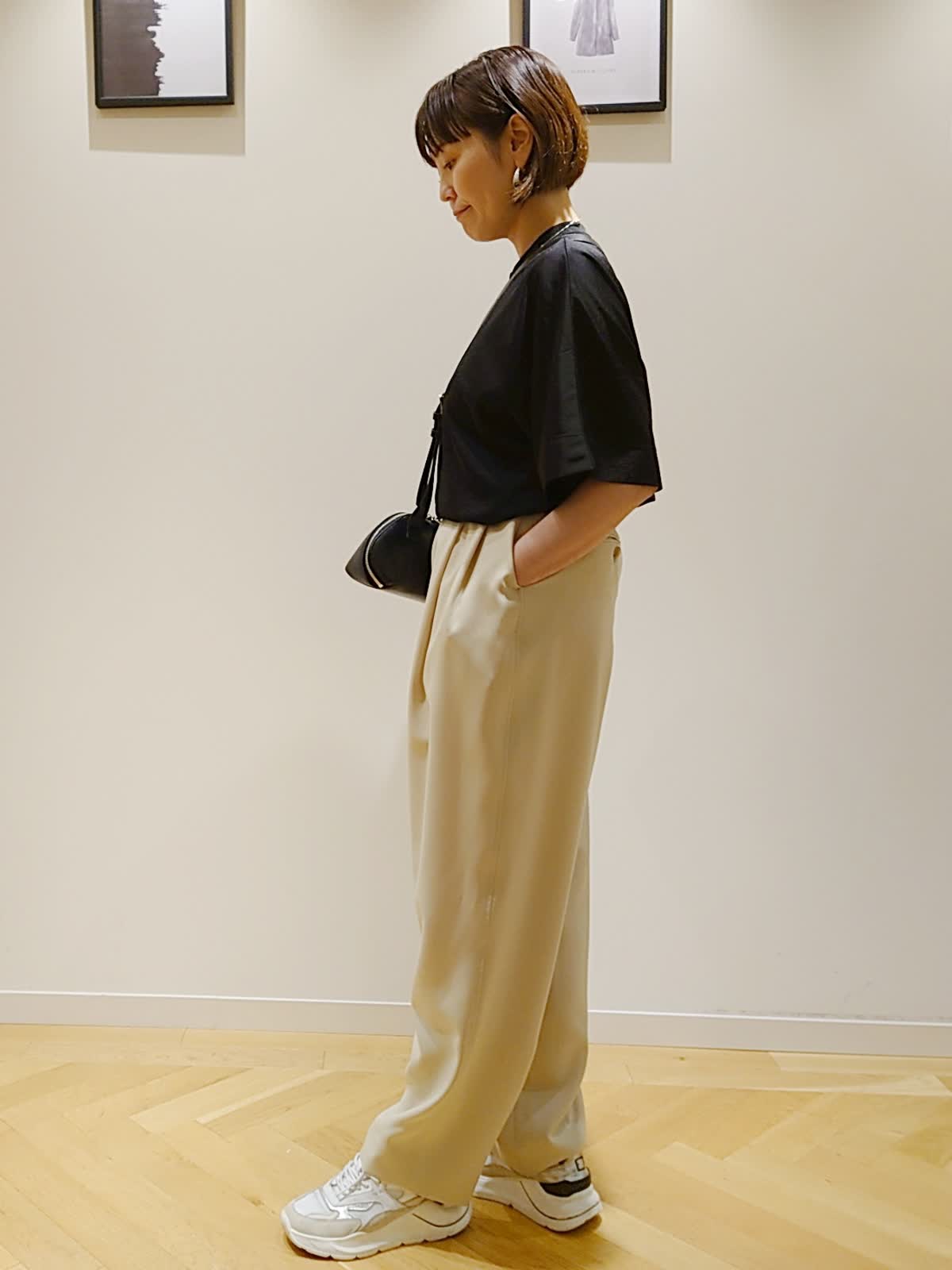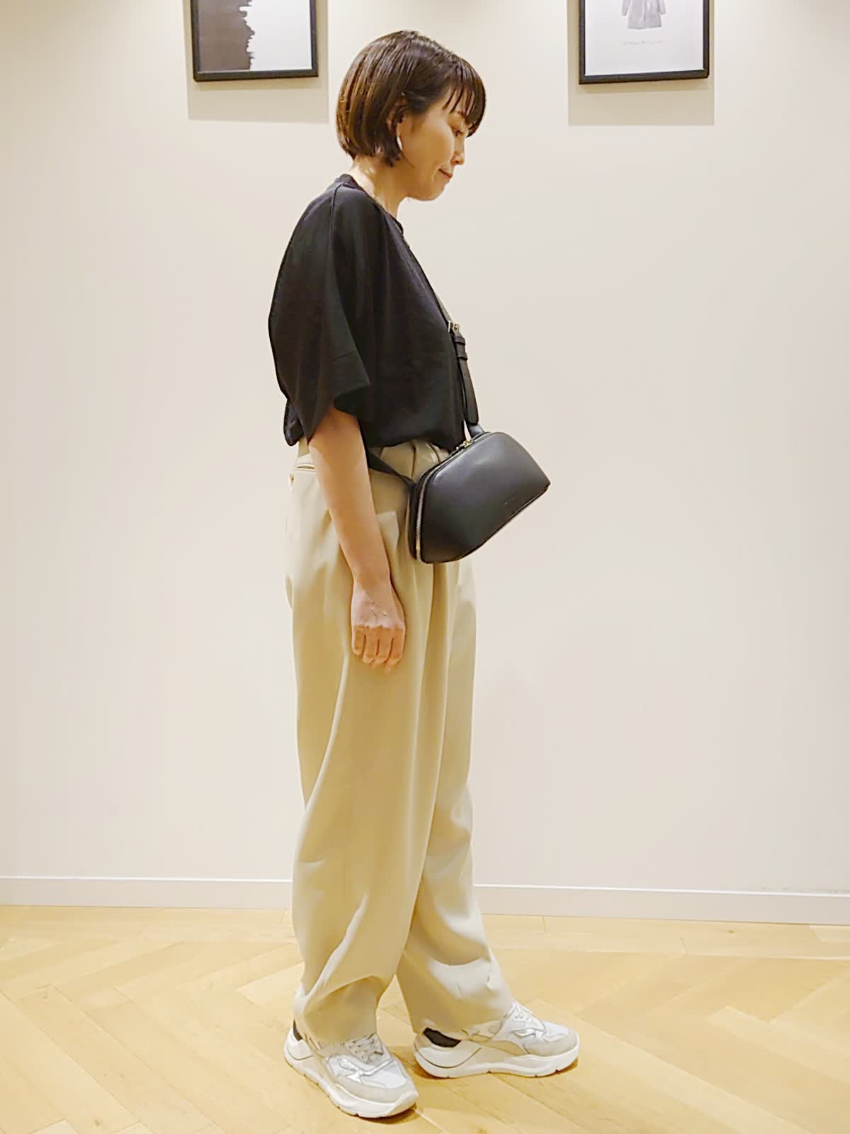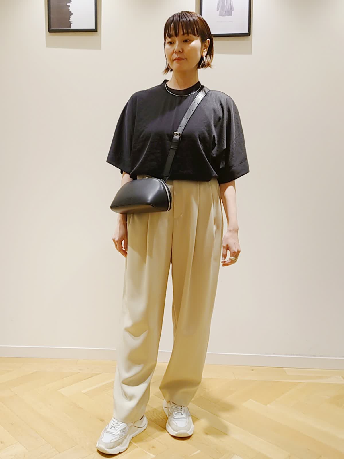 【着用サイズ】カットソー:9号 パンツ:9号【着用カラー】カットソー:ブラックパンツ:ベージュ シンプルなクルーネックの、シアー半袖Tカットソー。程よい透け感で、デイリー使いはもちろん、オフィスカジュアルスタイルにも使えます。着回し力抜群のTシャツは、一枚持っておくと重宝するアイテムです。パンツはカジュアルながらもおしゃれなシルエットで、様々なコーディネートに合わせやすい万能なバレルパンツです。