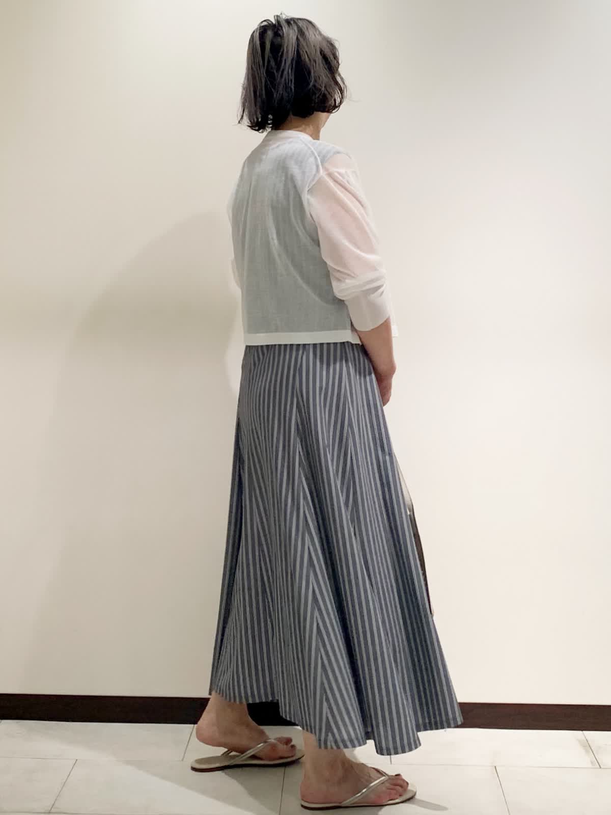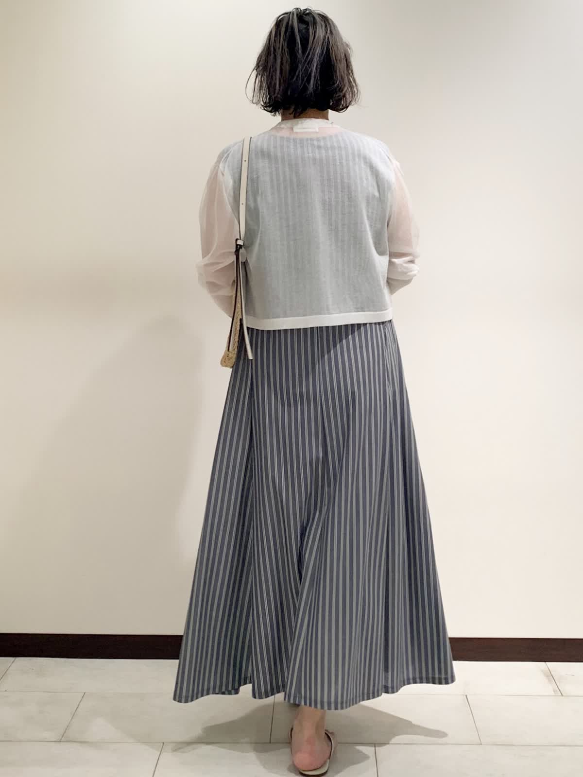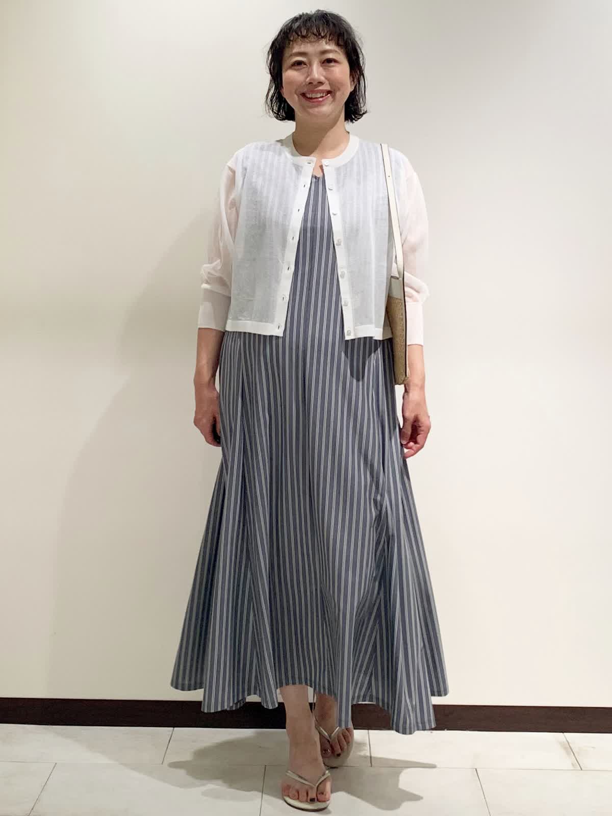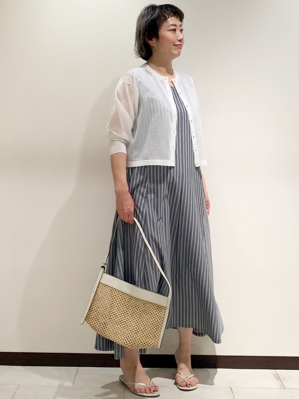 【着用サイズ】全て9号サイズ 【着用カラー】ワンピース:ネイビー カーディガン:ホワイト バッグ:ベージュ 腰のあたりから綺麗にフレアーが入るワンピースは、広がりすぎずすっきりとしたシルエット。サラッとした着心地が夏におすすめです。軽く通気性の良いカーディガンと合わせて爽やかコーディネートの完成です。