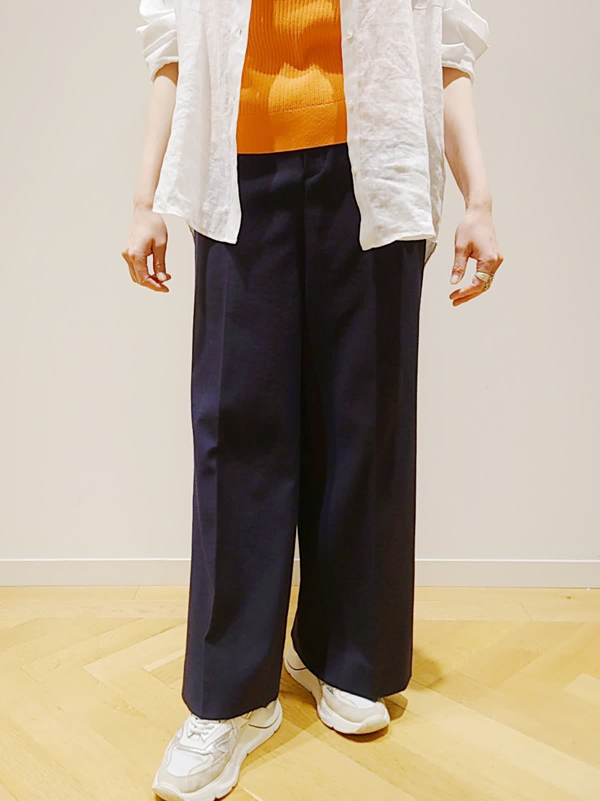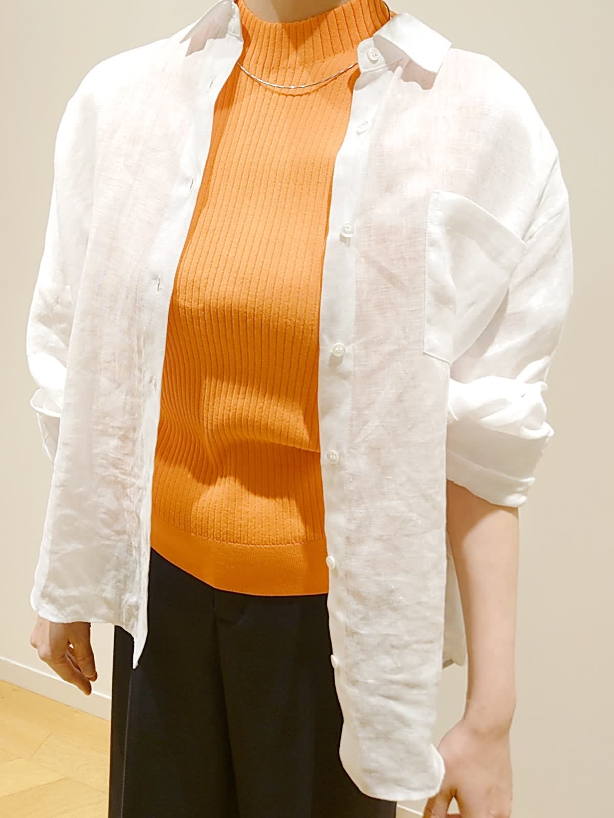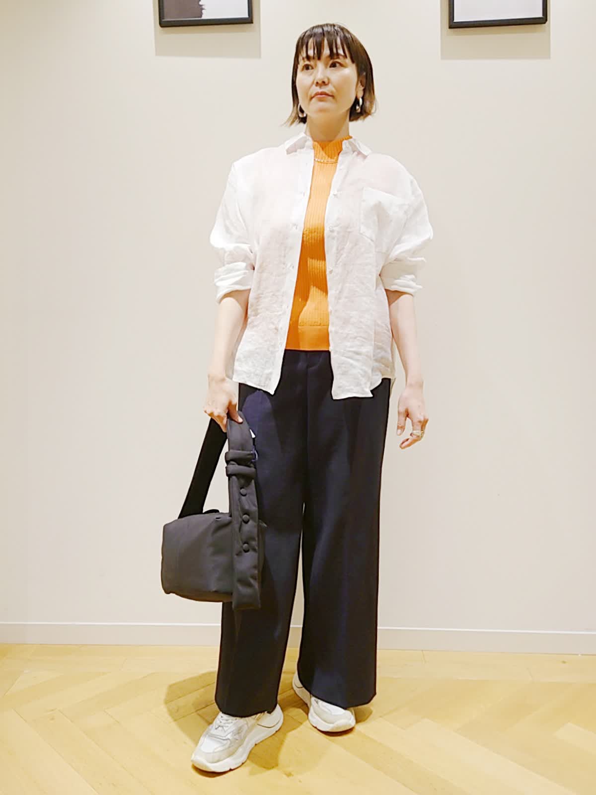 【着用サイズ】ブラウス:9号 ニット:9号 パンツ:9号【着用カラー】ブラウス:オフホワイトニット:オレンジパンツ:ネイビー ナチュラルで程よくシアー感のある大人っぽいリネンシャツは、一枚で着るにも羽織としても大活躍。お尻も隠れる丈感でパンツにもスカートにも合わせやすい使い勝手抜群のアイテムです。ニットはリブで柔らかく着心地がいいです。パンツは人気の美脚ワイドパンツで、ストレッチがきいており動きやすい快適な穿き心地です。