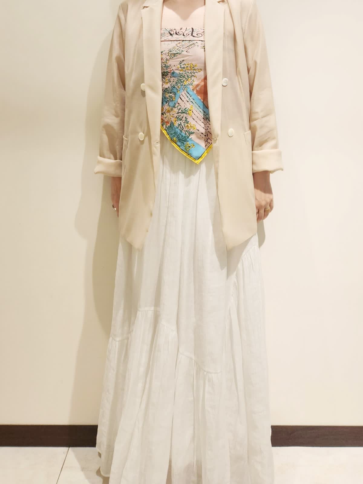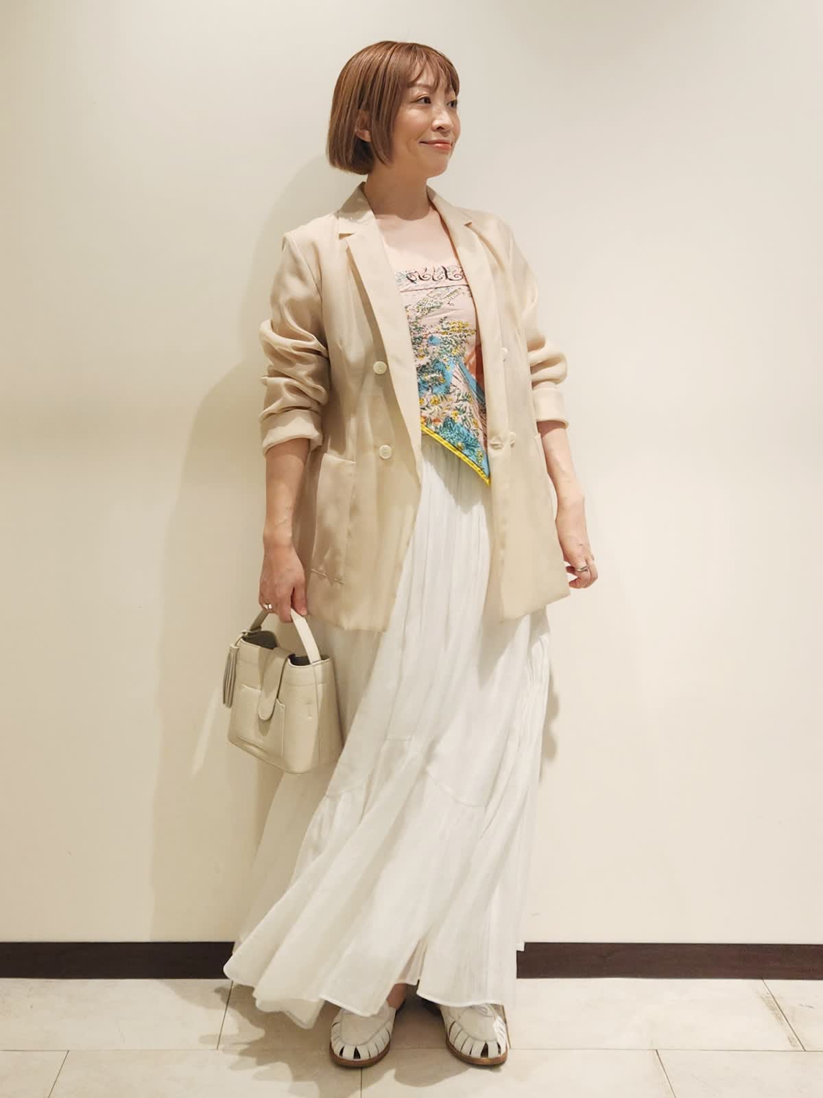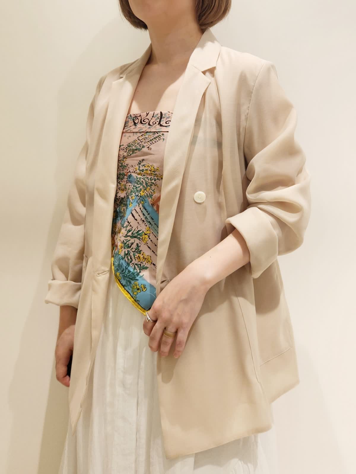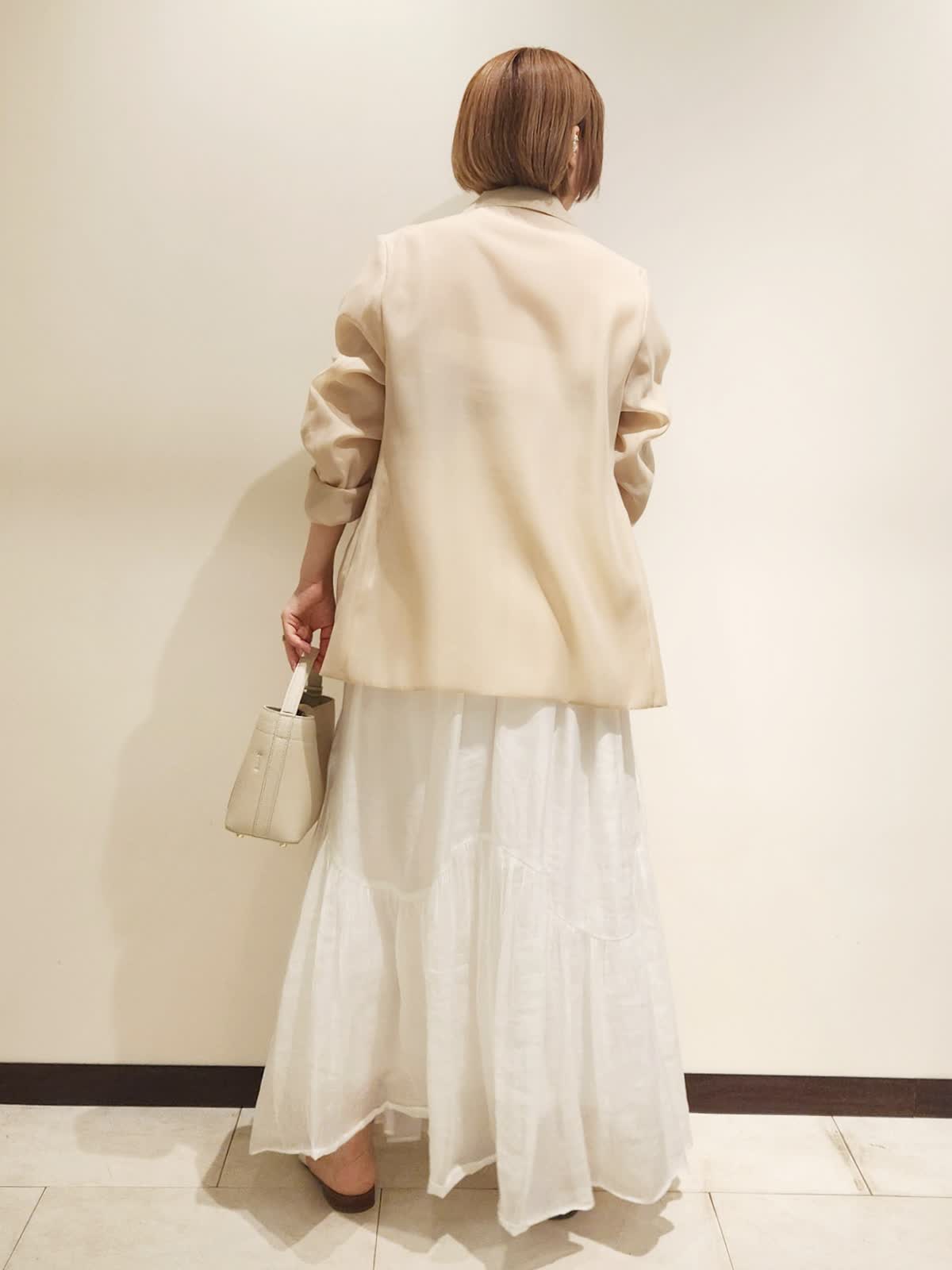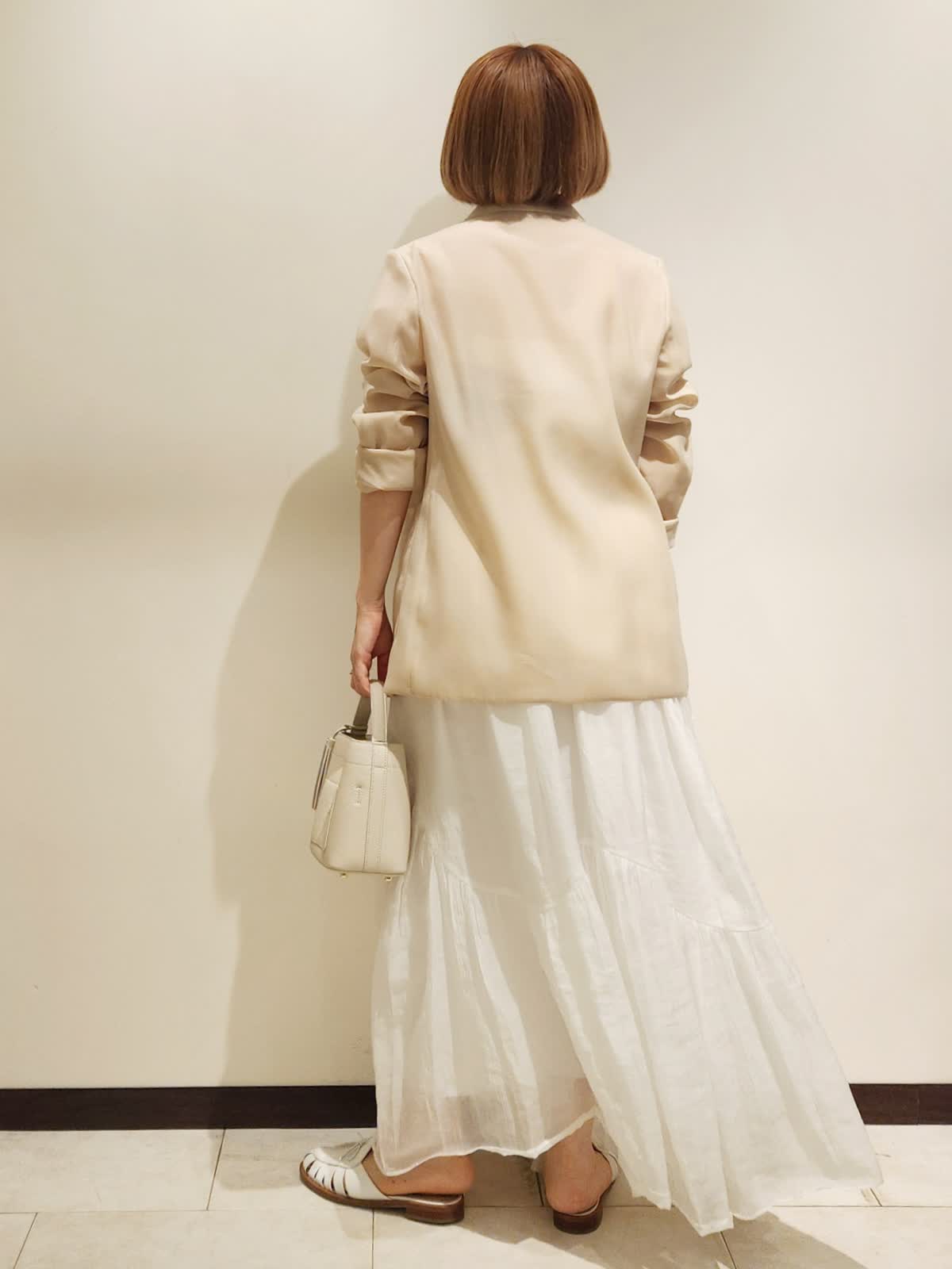 【着用サイズ】全て9号 【着用カラー】ジャケット:ベージュ スカート:オフホワイト 普段のコーディネートでジャケットも着たい!!が叶うアイテム。オーガンジーの上質さありながらカーディガンのような気軽さが魅力的です。柔らかいベージュカラーを引き立てたいのでスカートはホワイトにしました。トップはカップ付きキャミにスカーフをプラスして。小物にはレザーアイテムでホワイトをチョイス。