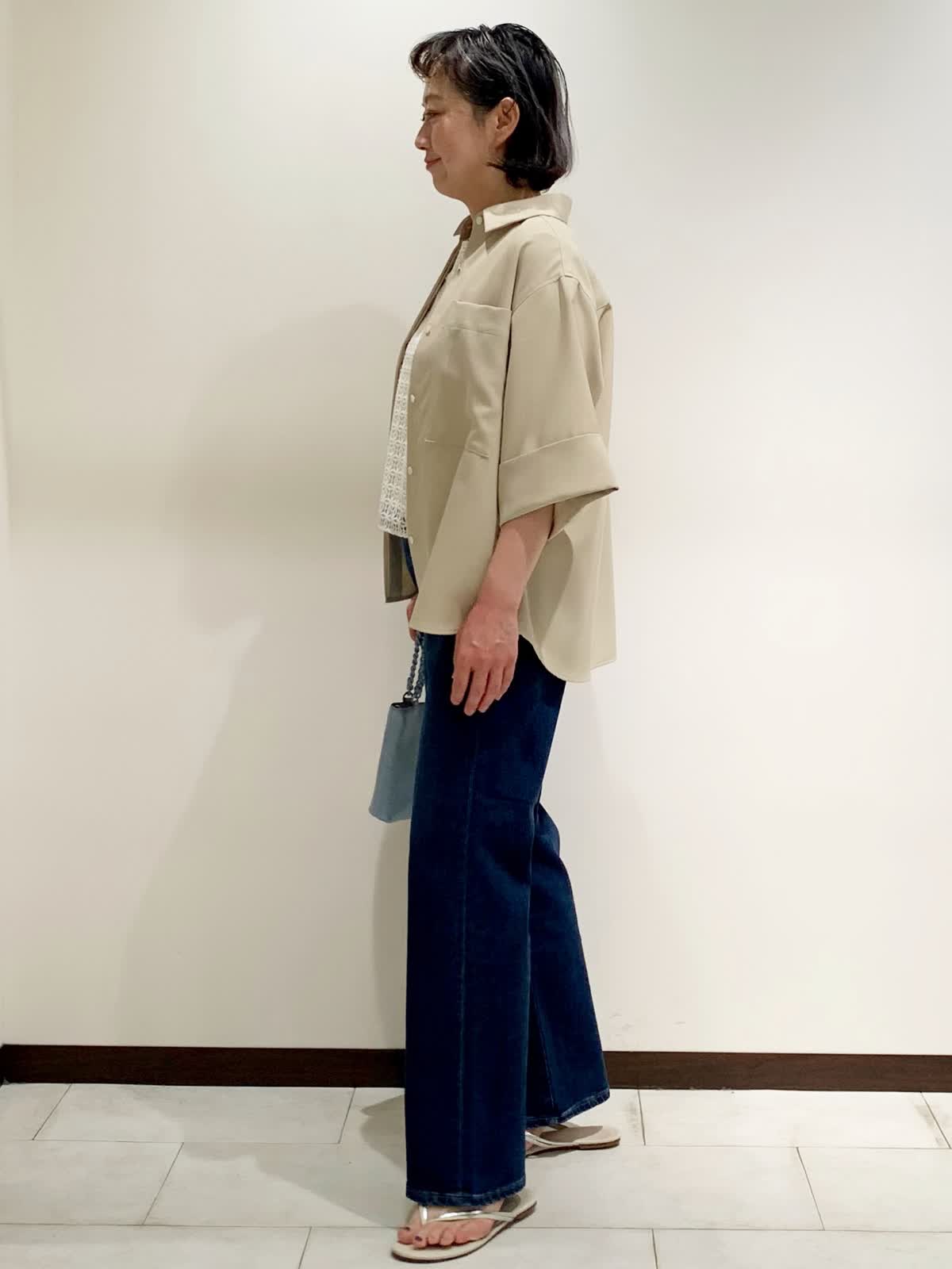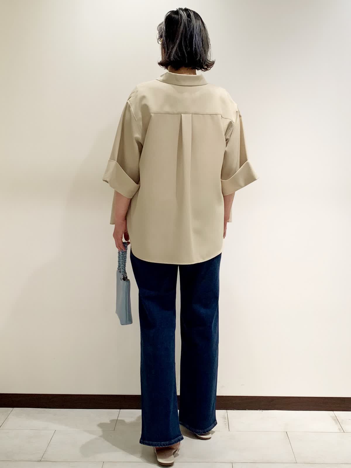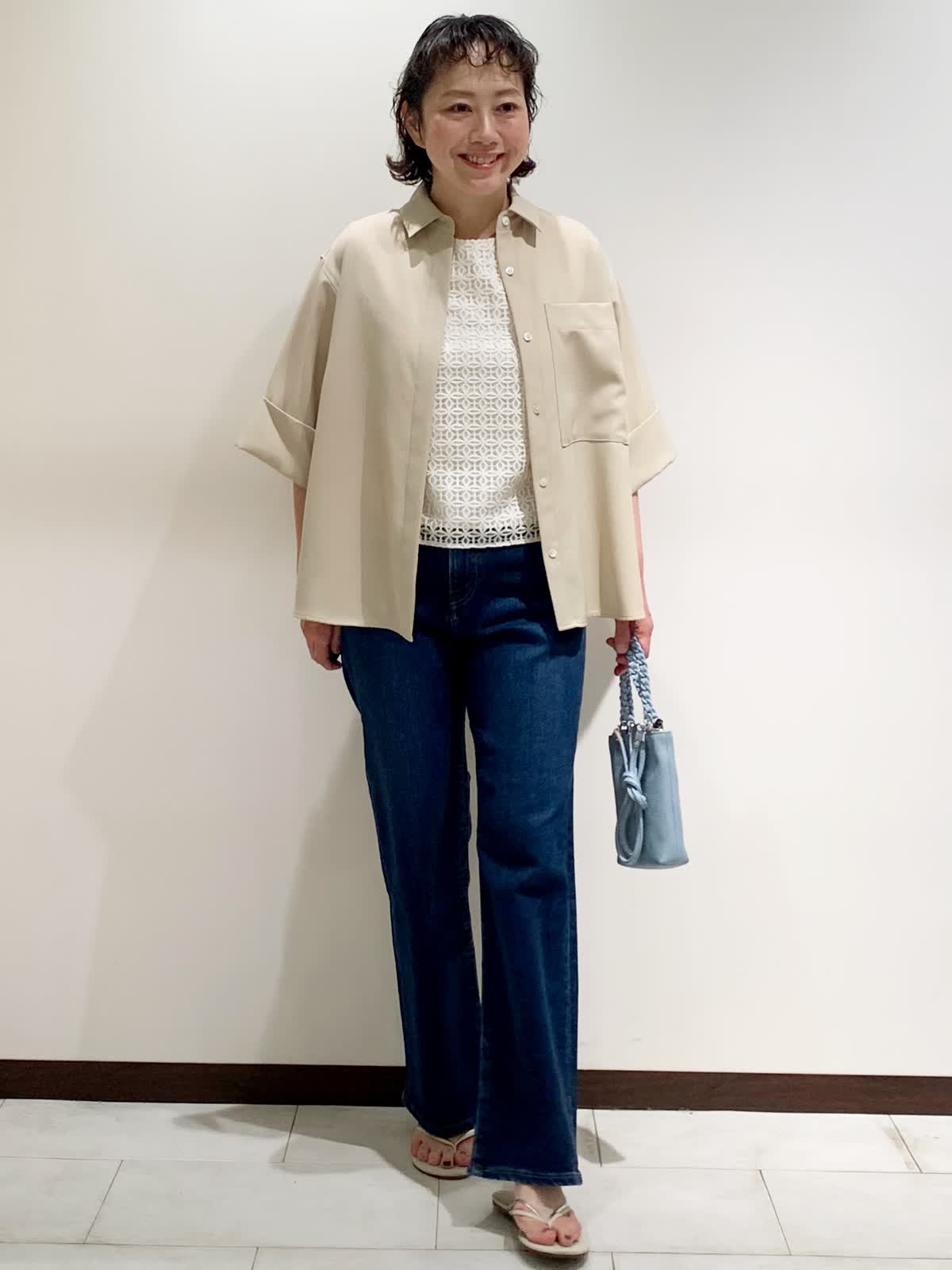 【着用サイズ】全て9号サイズ 【着用カラー】シャツ:ベージュ ブラウス:オフホワイト パンツ:インディゴ バッグ:サックス レースブラウスは体のラインをひろわず、お腹周り気になる部分をうまくカバーしてくれます。デニムは柔らかくハイウエストなので履いていて安心感があります。シャツを羽織ってカジュアルなコーディネートの完成です。