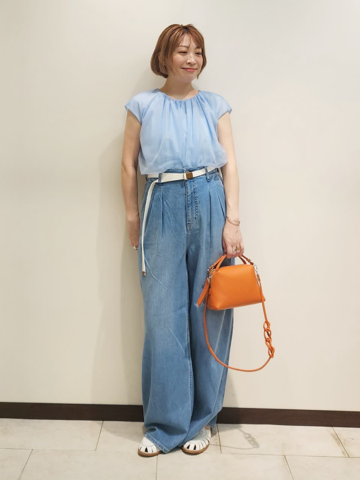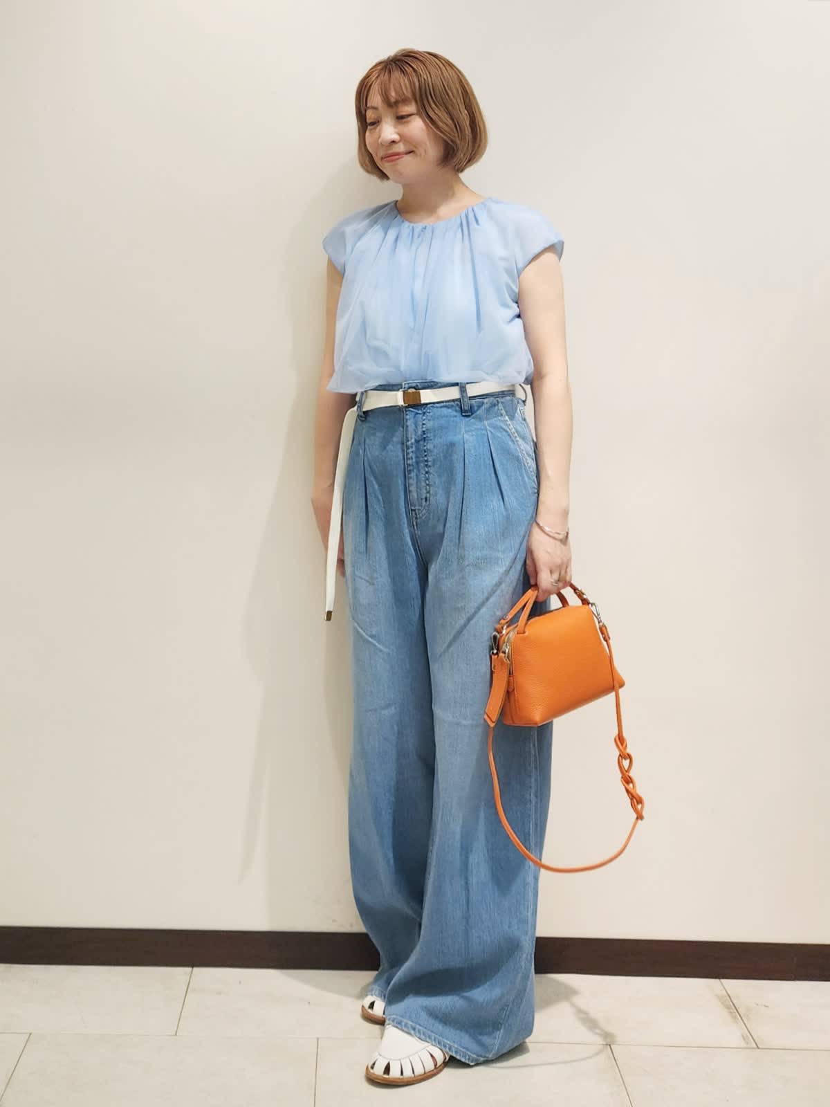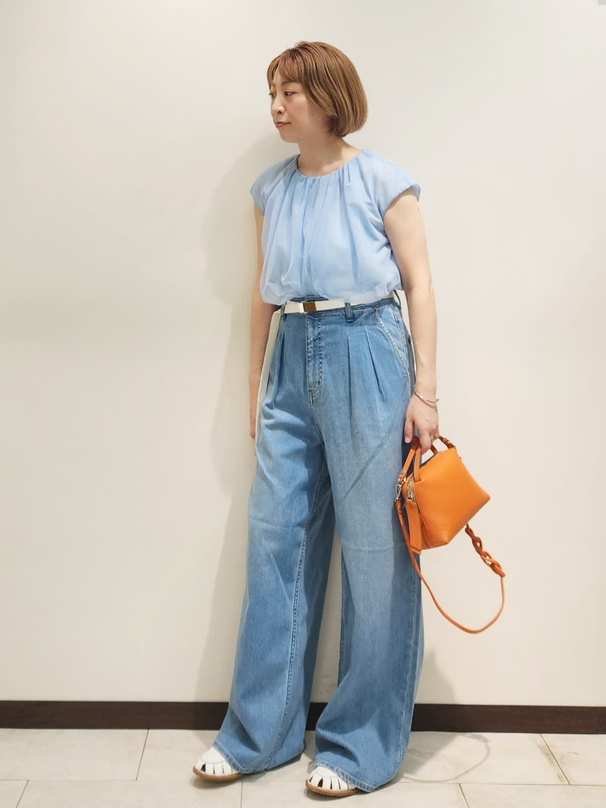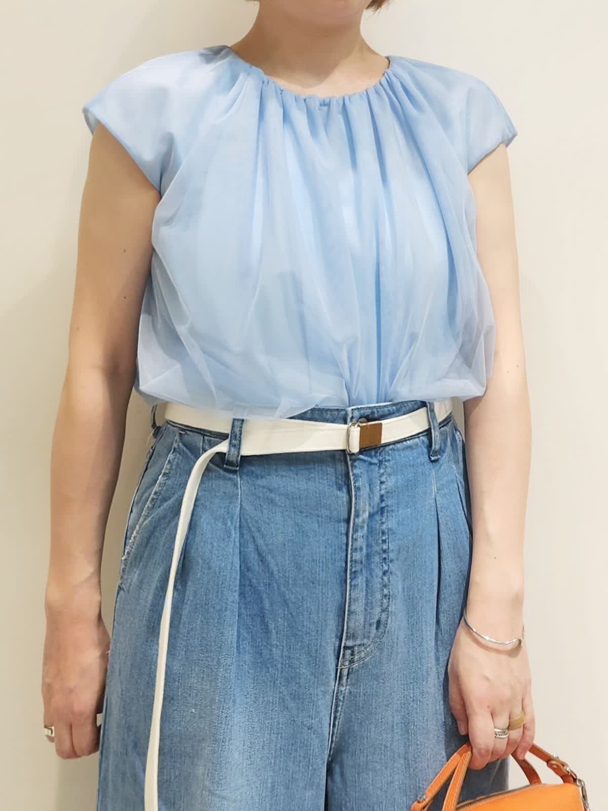【着用サイズ】全て9号 【着用カラー】ブラウス:サックス デニム:サックス チュールブラウス×Healthyデニムでアクティブなお出かけコーディネート。 チュールのトップスがあればいつものカジュアルコーデに女子感をプラス!!パンツは動きやすい方が良いのでINED別注Healthyデニムを合わせて。フェミニンよりなカジュアルをたまには楽しみます!!