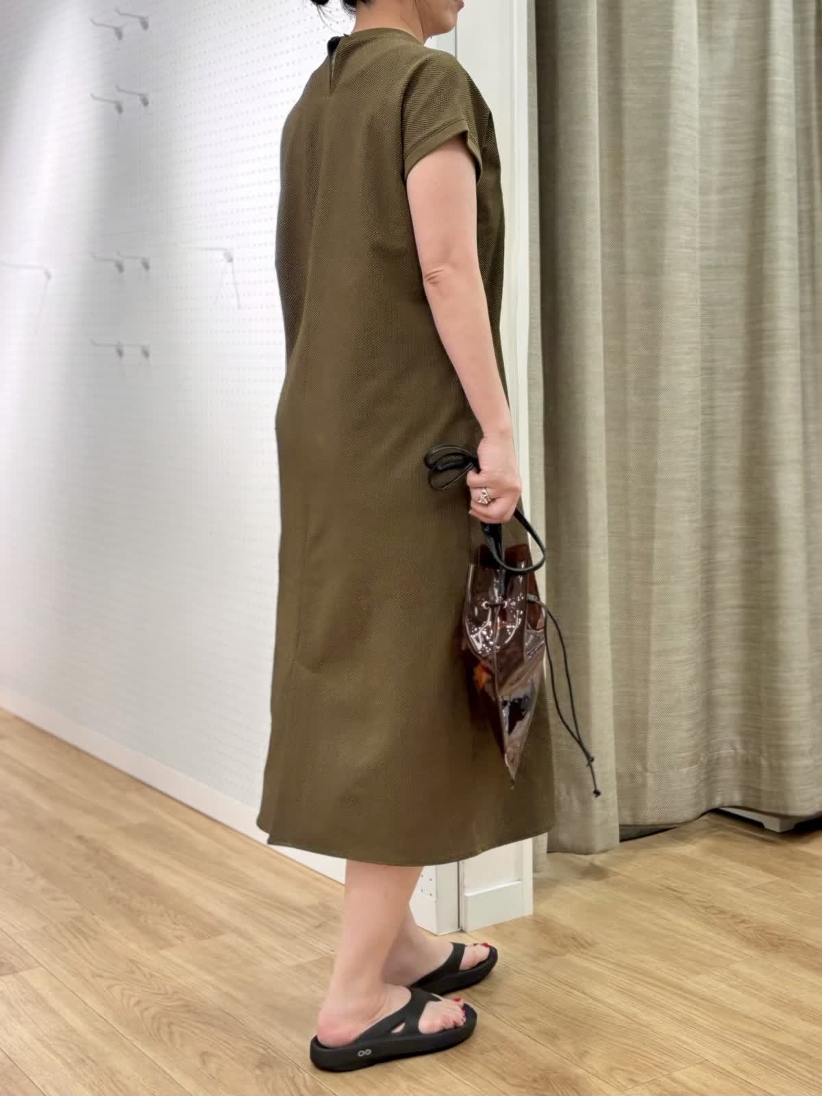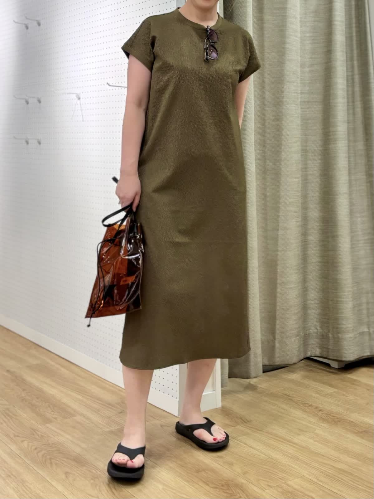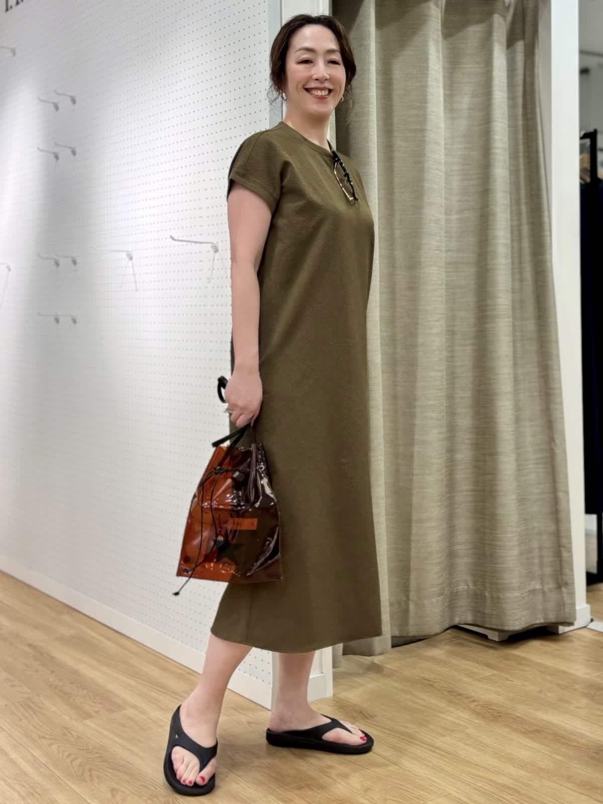 【着用カラー/サイズ】 ワンピース:カーキ/フリー 旅先のリラックスコーデ。防シワでUV加工のあるワンピースは夏旅に最適です。生地表面の凹凸が肌離れして着られるサッカー生地なので涼しく過ごしやすいです。