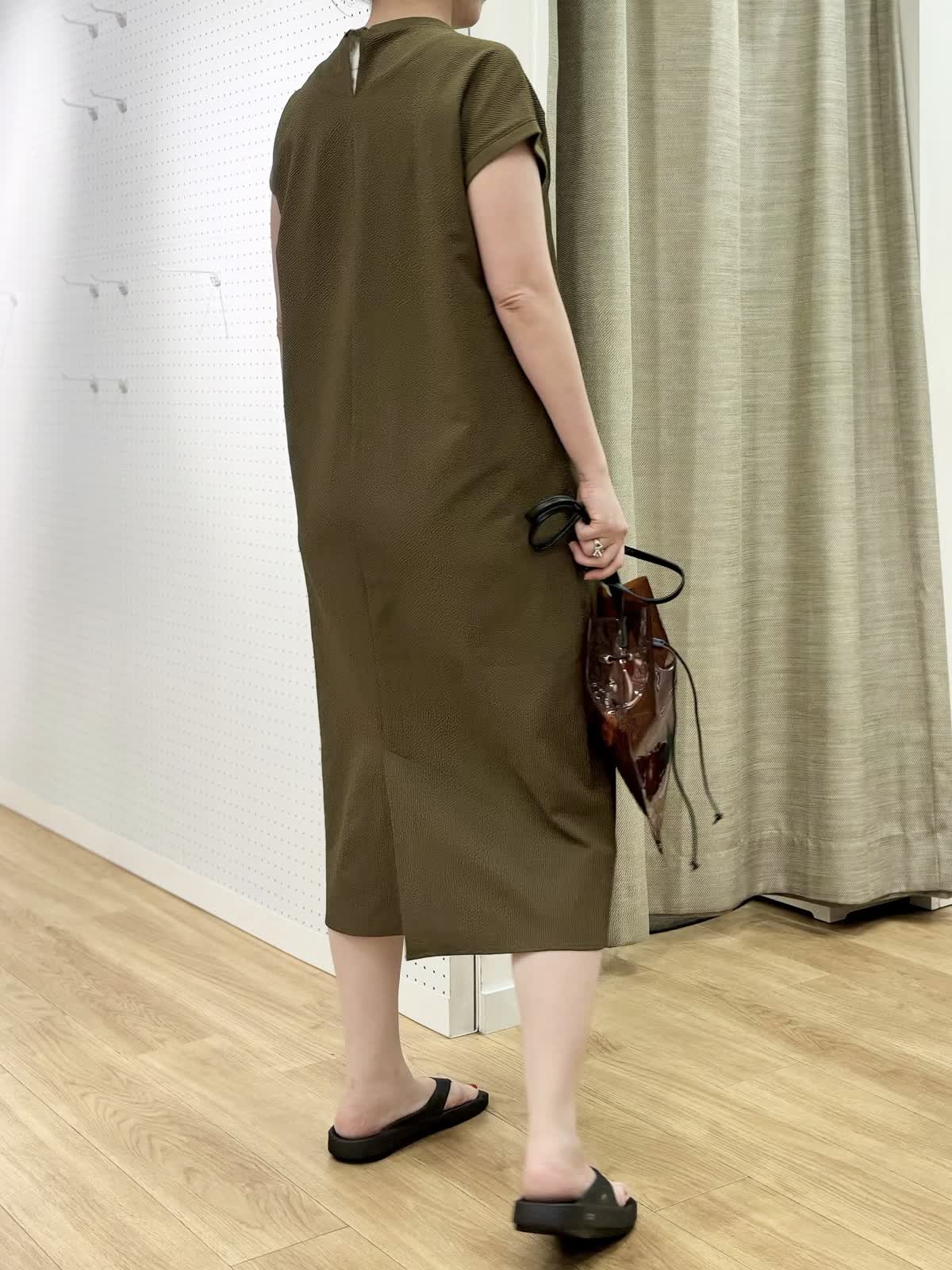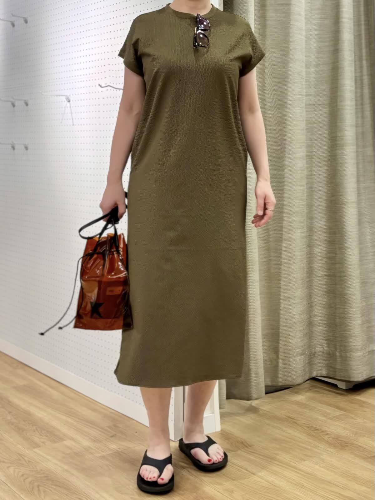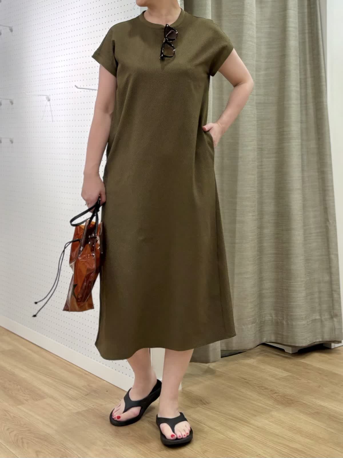 【着用カラー/サイズ】 ワンピース:カーキ/フリー 旅先のリラックスコーデ。防シワでUV加工のあるワンピースは夏旅に最適です。生地表面の凹凸が肌離れして着られるサッカー生地なので涼しく過ごしやすいです。