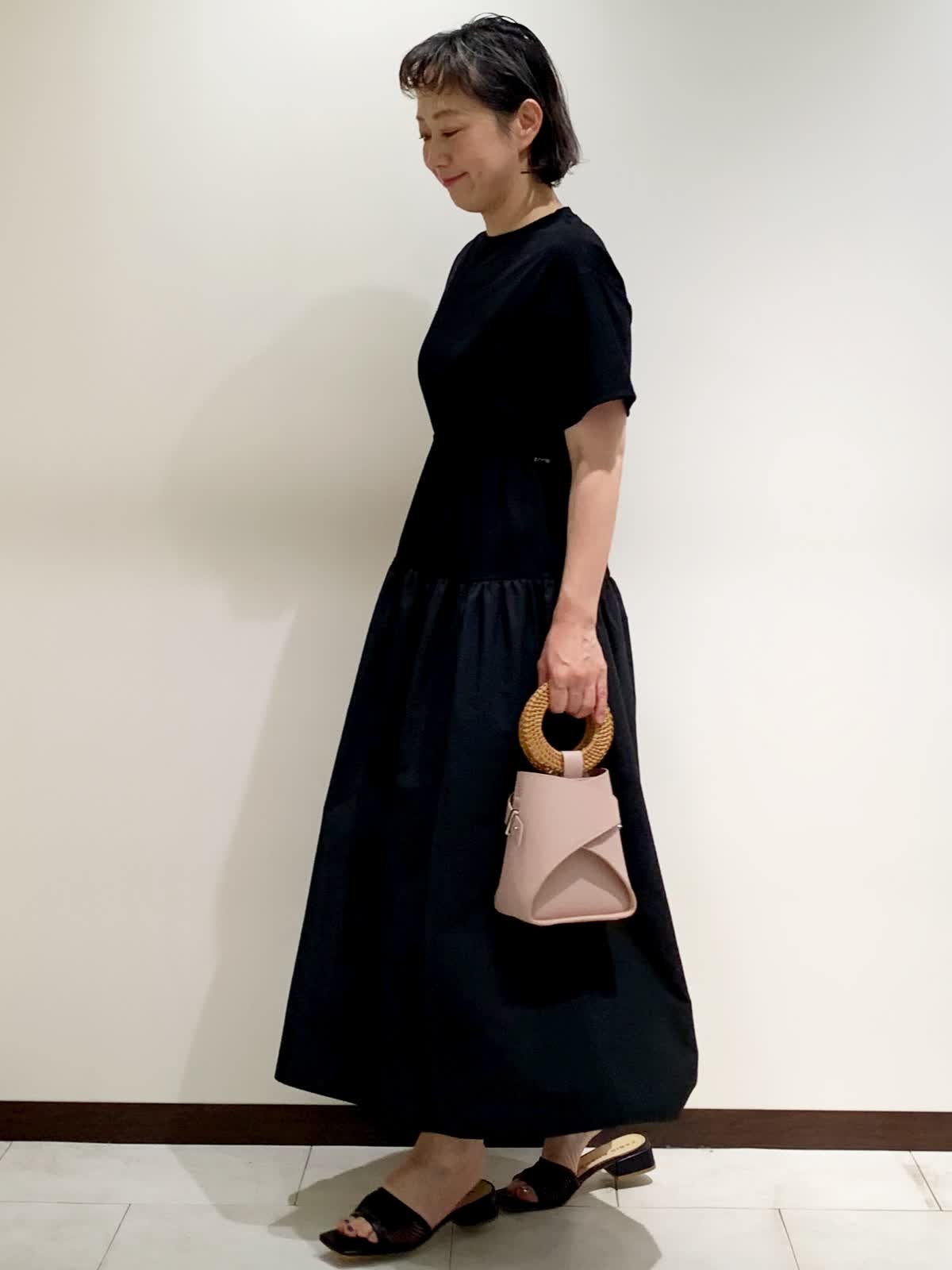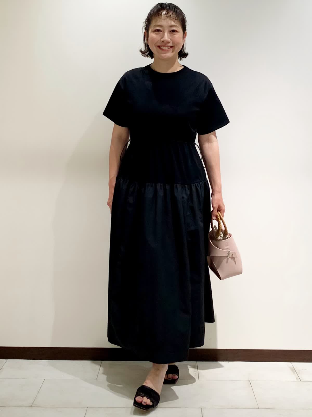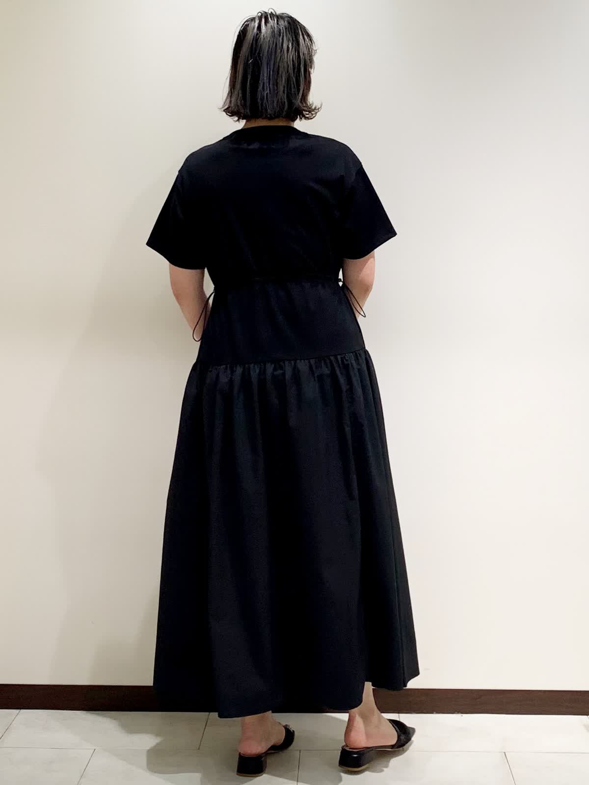 【着用サイズ】9号サイズ 【着用カラー】ワンピース:ブラック バッグ:ピンク つるっとしたTシャツ生地とスカート部分のドライタッチな生地はイージーケア素材なので、気兼ねなく普段使いしやすいワンピース。体のラインをひろわないので、リラックスして着られます。