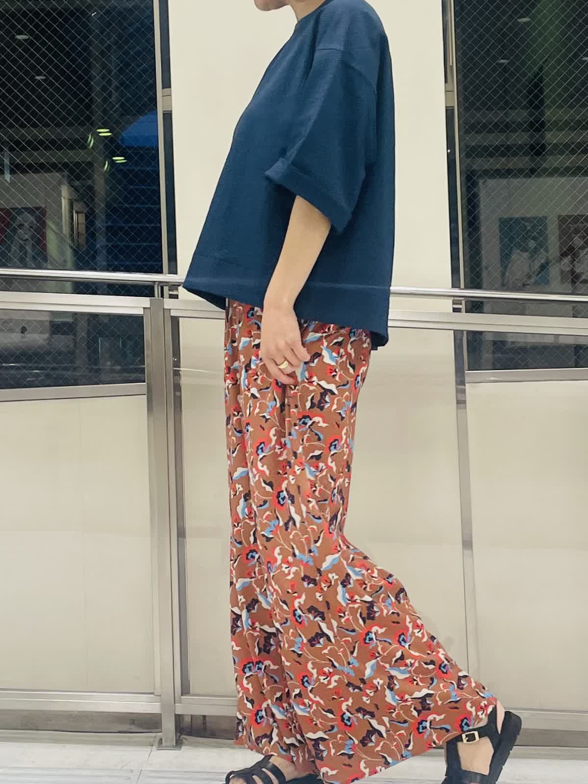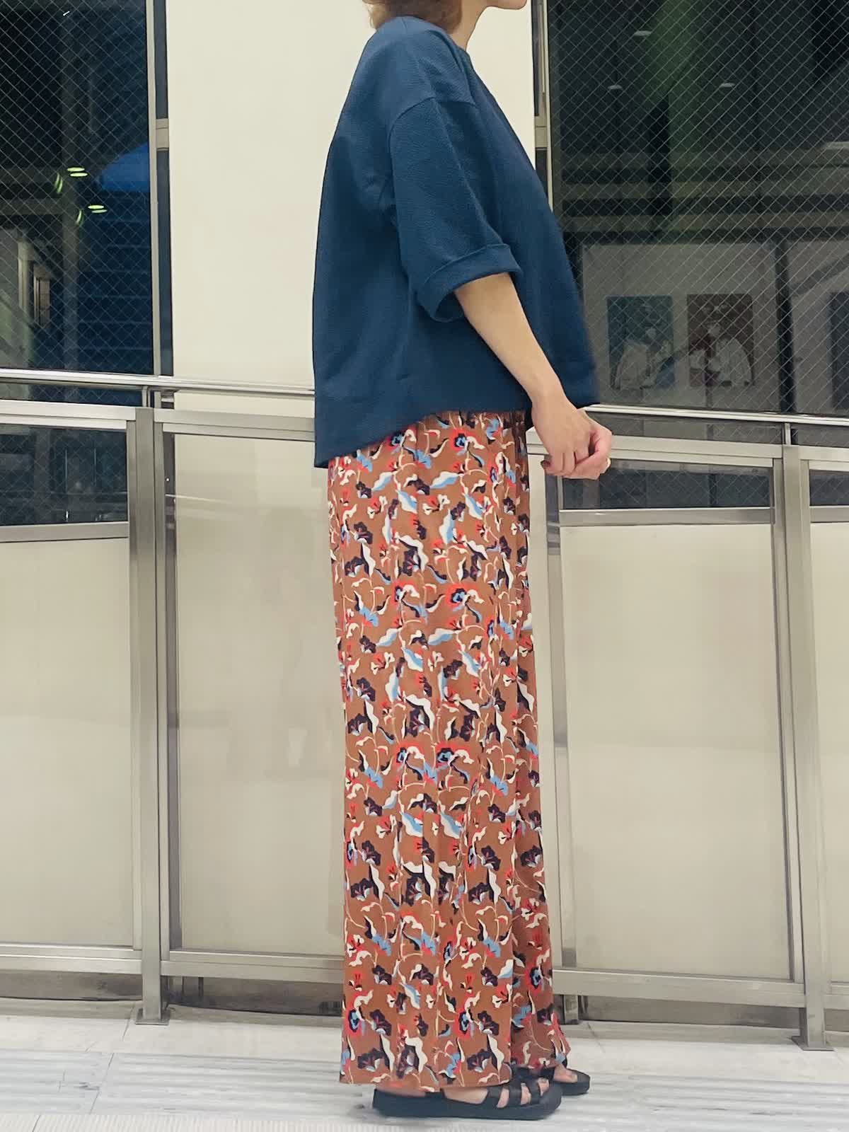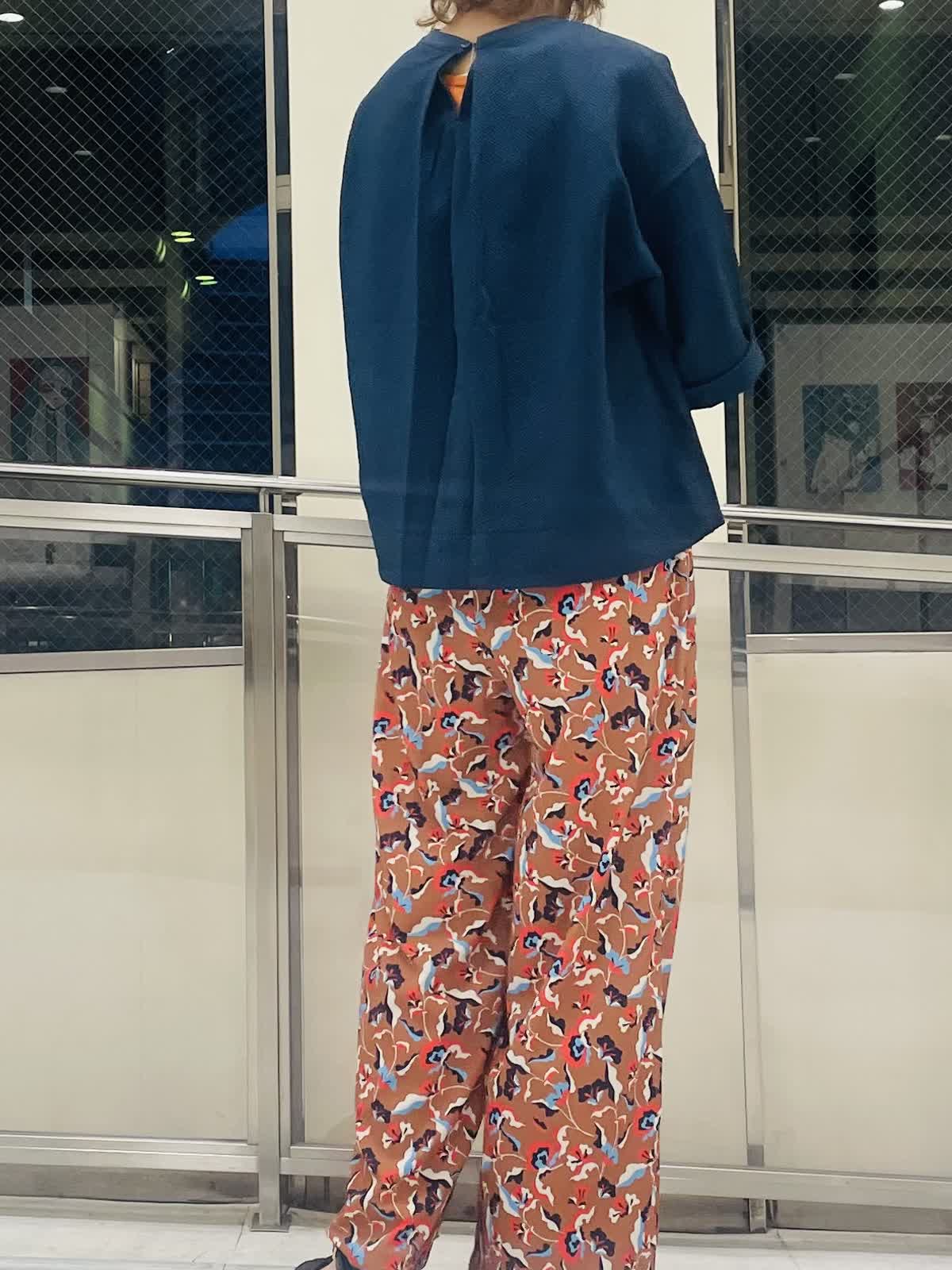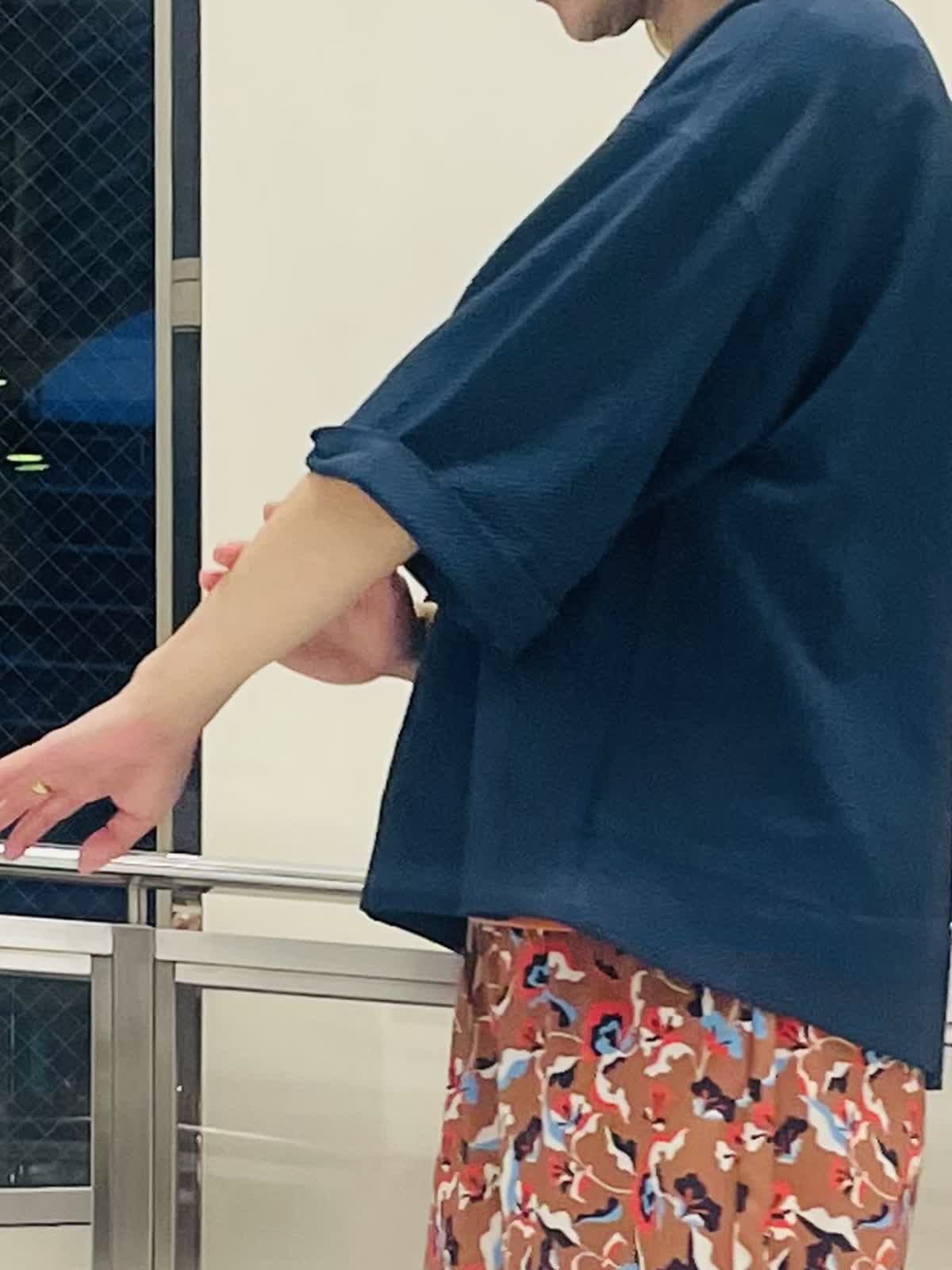 【着用サイズ/カラー】ネイビーブラウス:フリー タンク:9号サイズ パンツ:フリー ポコポコした生地は見た目より ドライタッチで涼しく、肘まで隠れる袖丈がポイント。 秋になっても着回しができる安心感で推し服です。 柄物パンツも渋色合わせで落ち着き感とお尻周りのカモフラージュに◎。