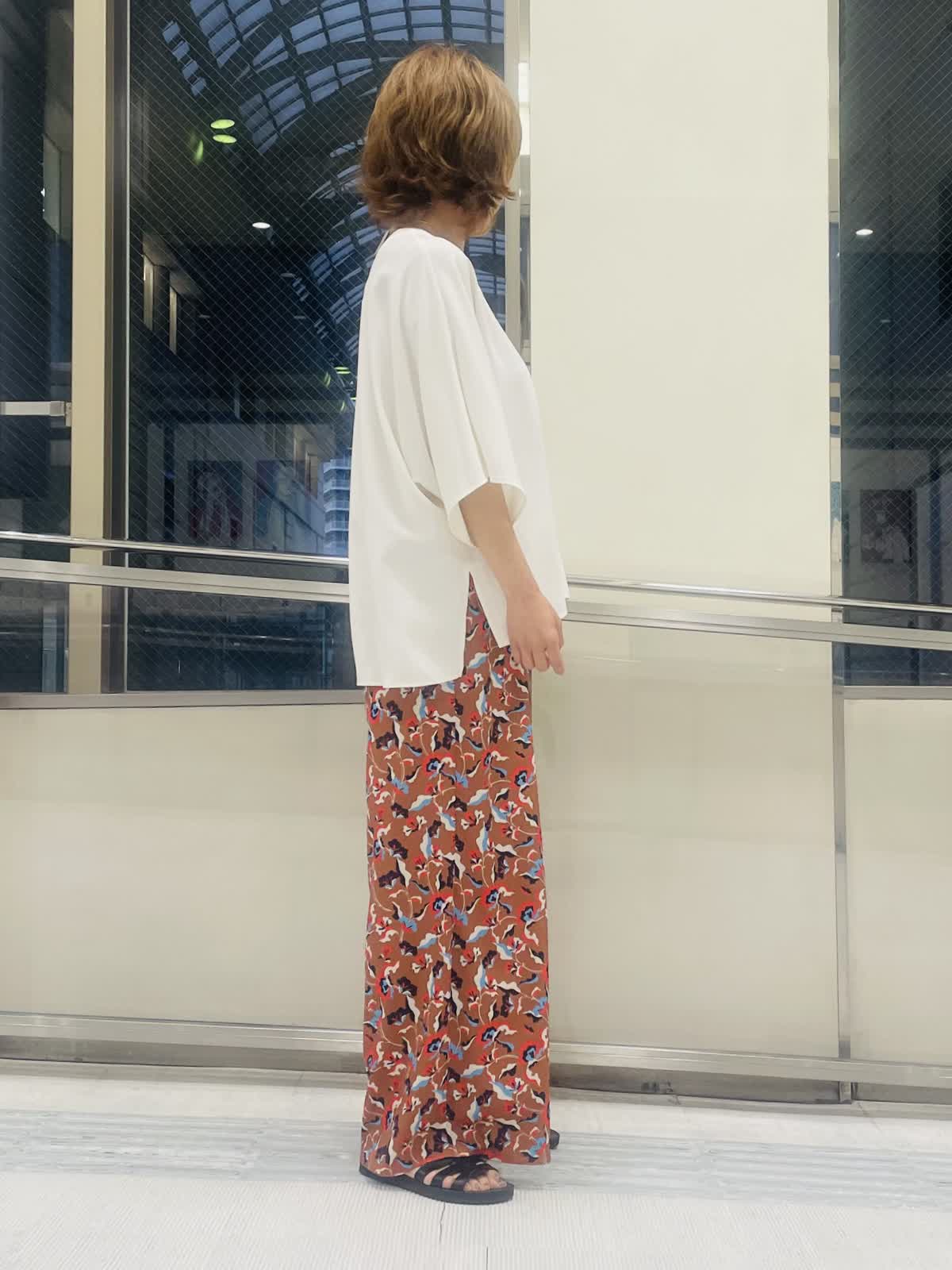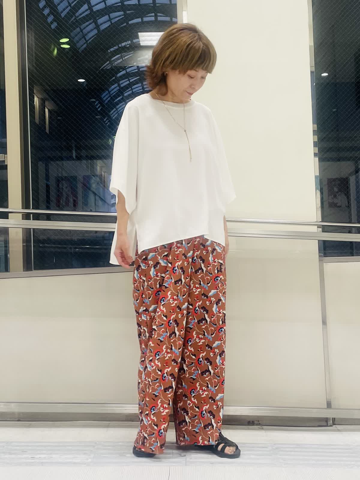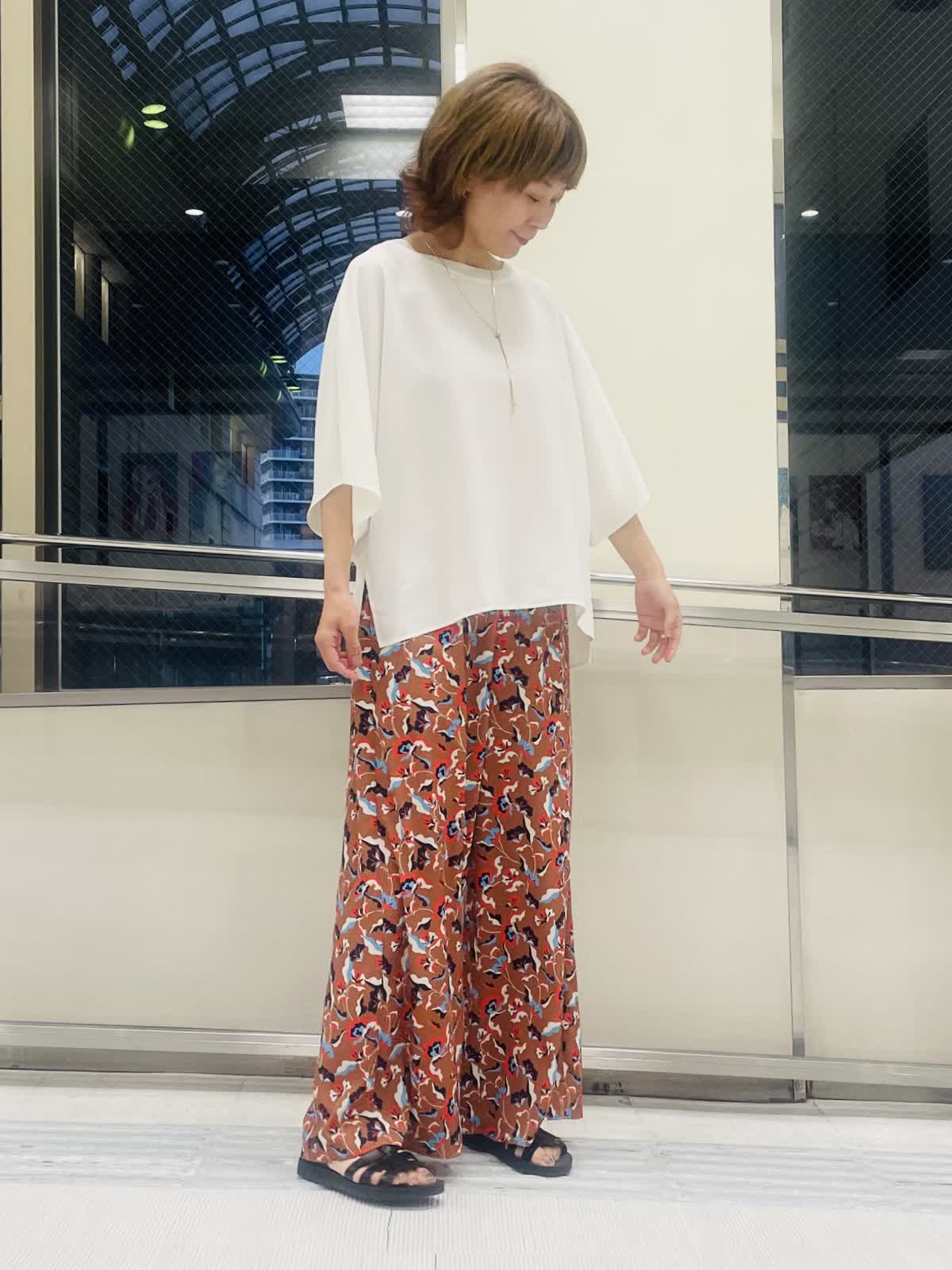 【着用サイズ/カラー】ホワイトリブ襟Tブラウス:フリー タンク:9号サイズ パンツ:9号サイズ Aラインでスタイルアップを狙う柄物コーデ。柄物パンツも柔らかい質感合わせで綺麗め仕上げ。 生地感はどちらも心地よくストレスフリーでおすすめです◎。