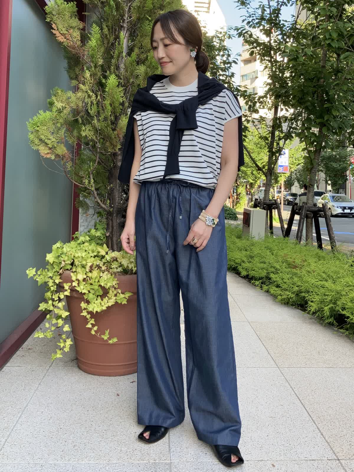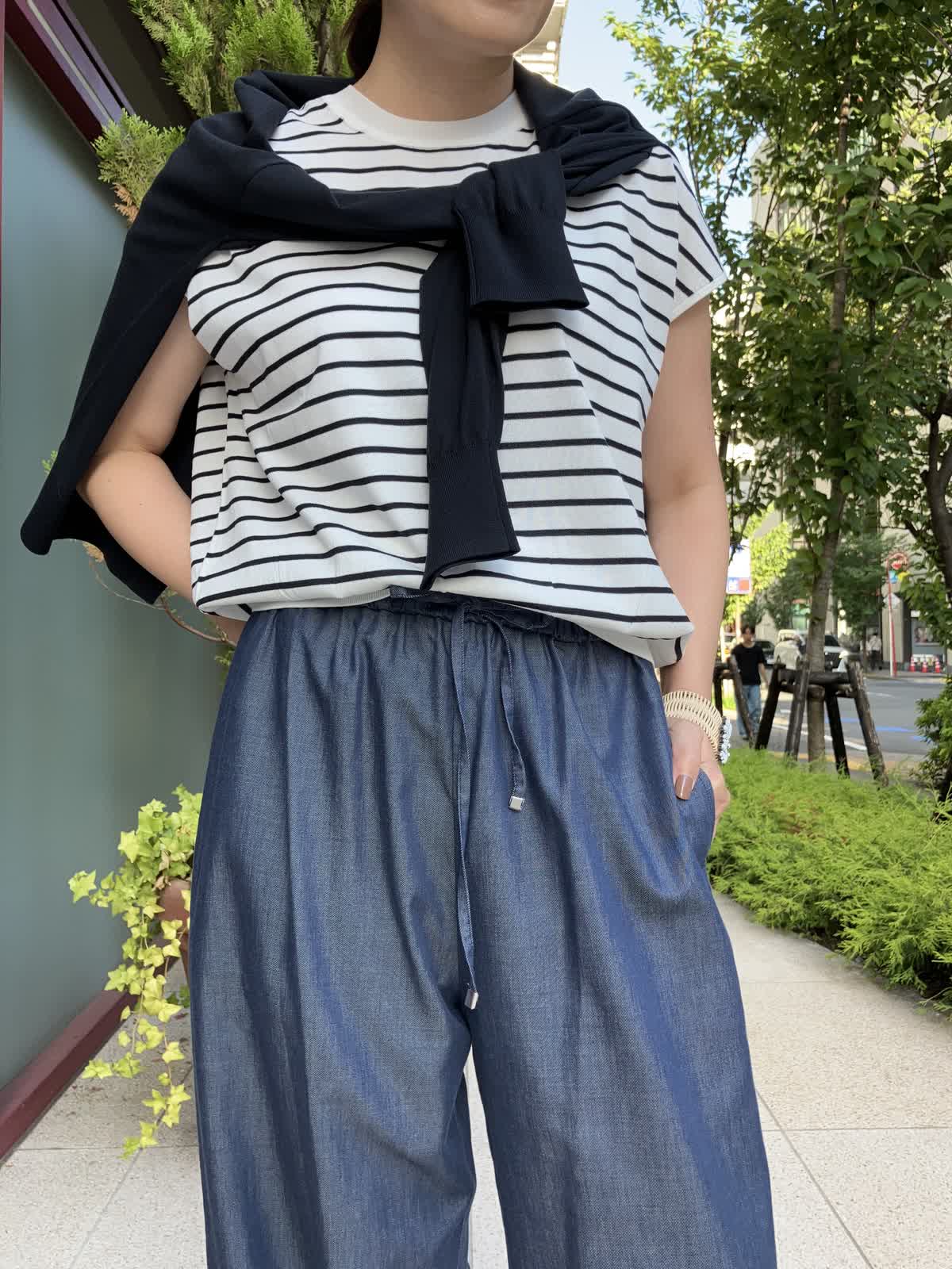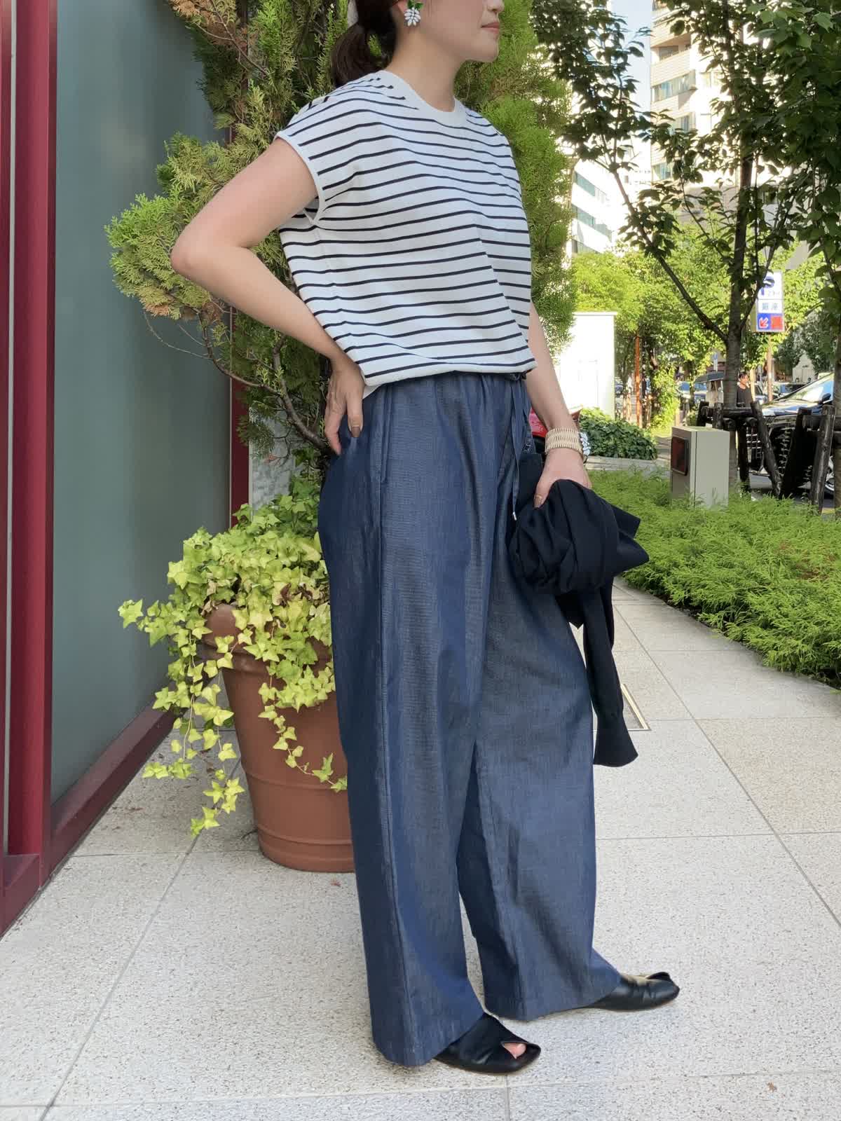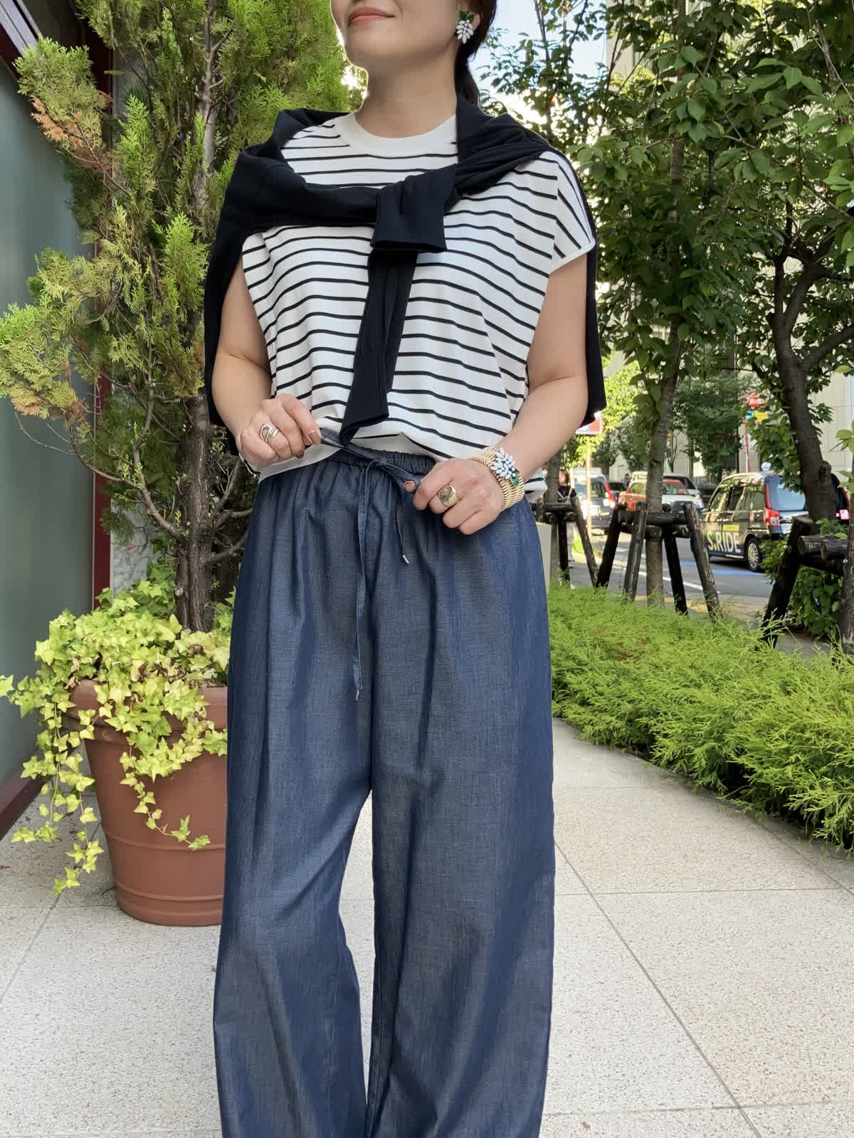 【着用サイズ】全て9号【着用カラー】ニット:ボーダー カーディガン:ネイビー パンツ:ネイビー ストレスフリーに過ごせるリラックススタイル。ご旅行やショッピングの時など、休日におすすめのコーディネートです。デニム調パンツはフィット感が無く、穿いているのを忘れそうなほど楽に穿けるボトムスです。トップスのボーダー柄がコーディネートのアクセントに。