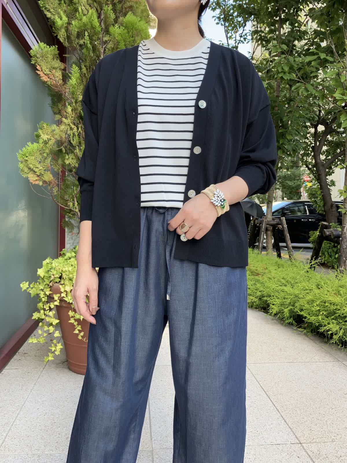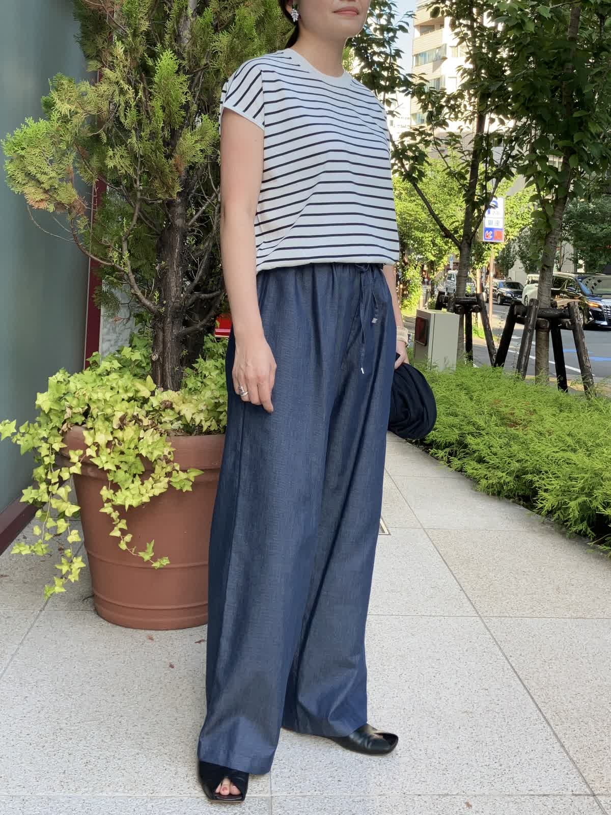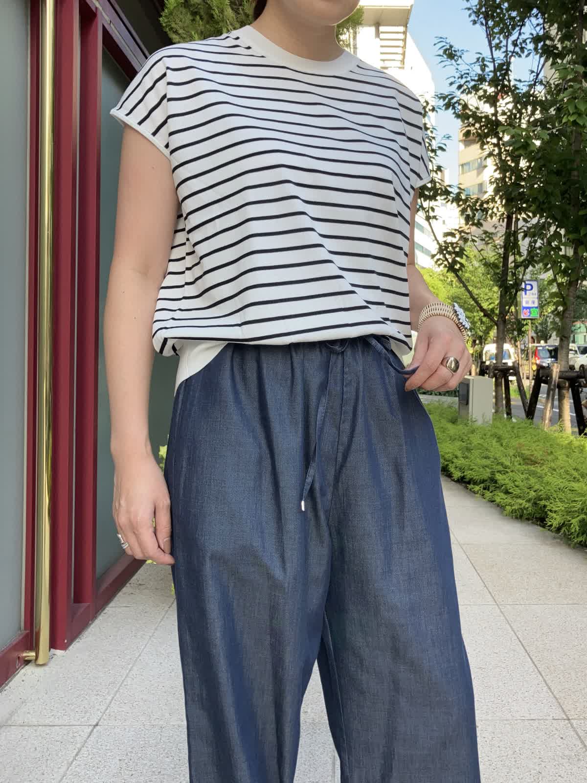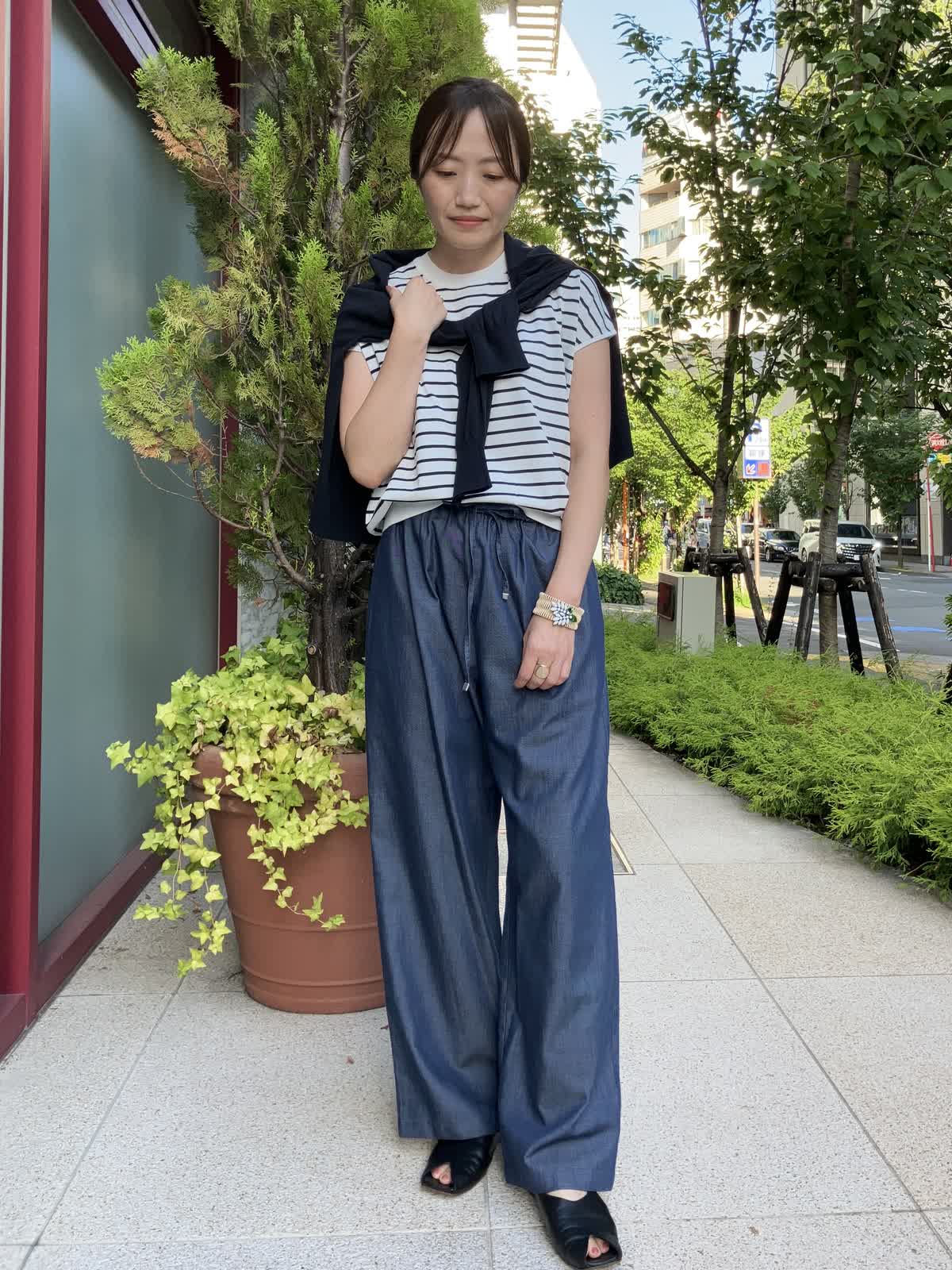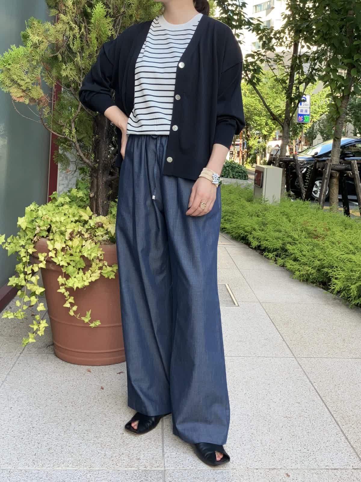 【着用サイズ】全て9号【着用カラー】ニット:ボーダー カーディガン:ネイビー パンツ:ネイビー ストレスフリーに過ごせるリラックススタイル。ご旅行やショッピングの時など、休日におすすめのコーディネートです。デニム調パンツはフィット感が無く、穿いているのを忘れそうなほど楽に穿けるボトムスです。トップスのボーダー柄がコーディネートのアクセントに。