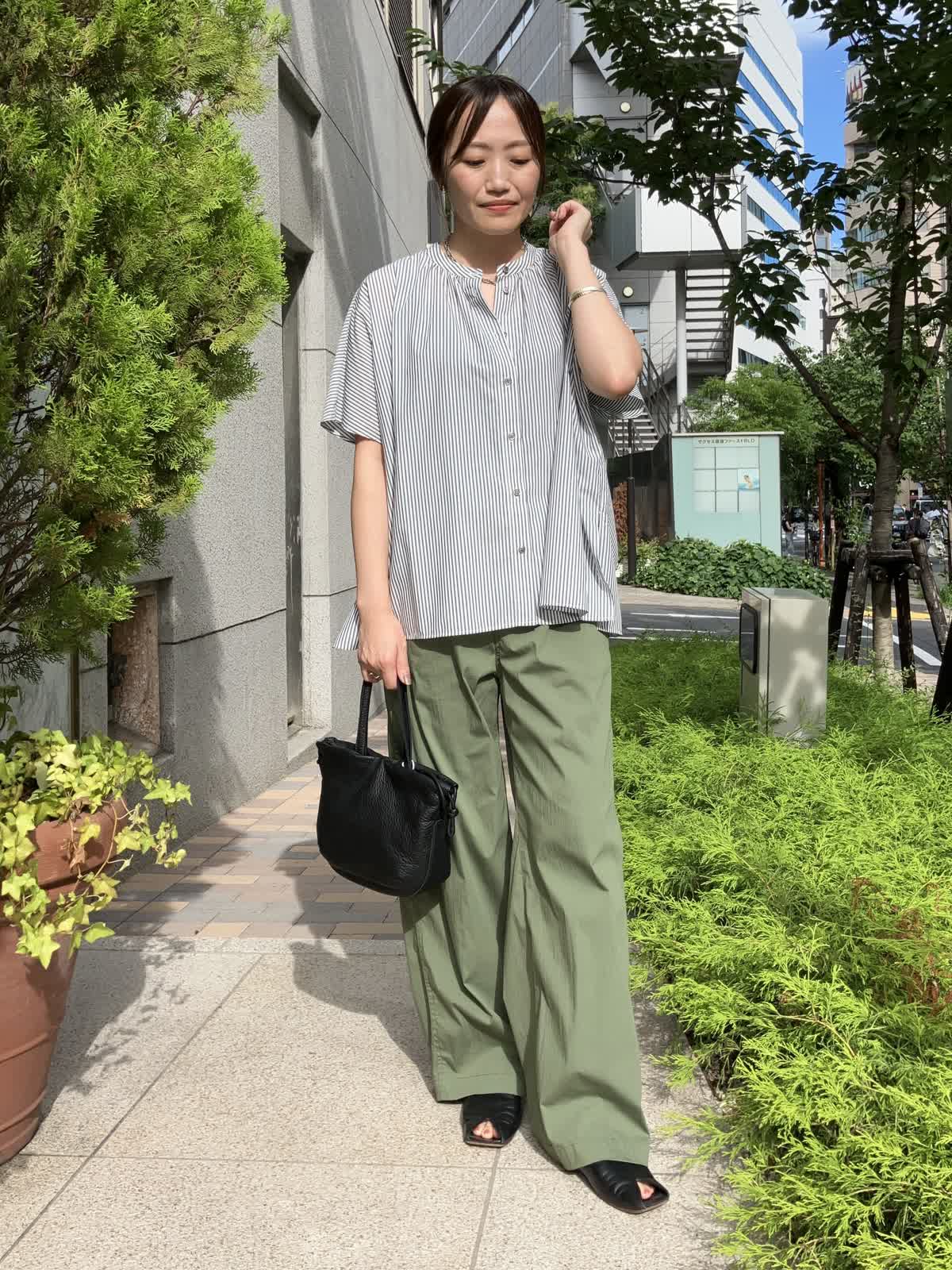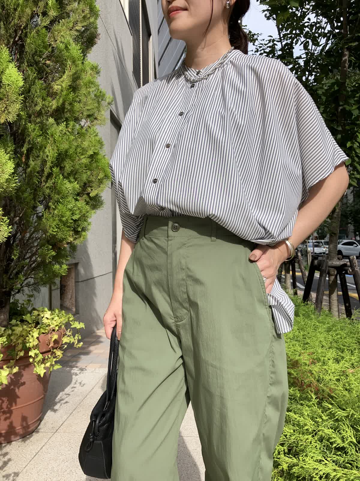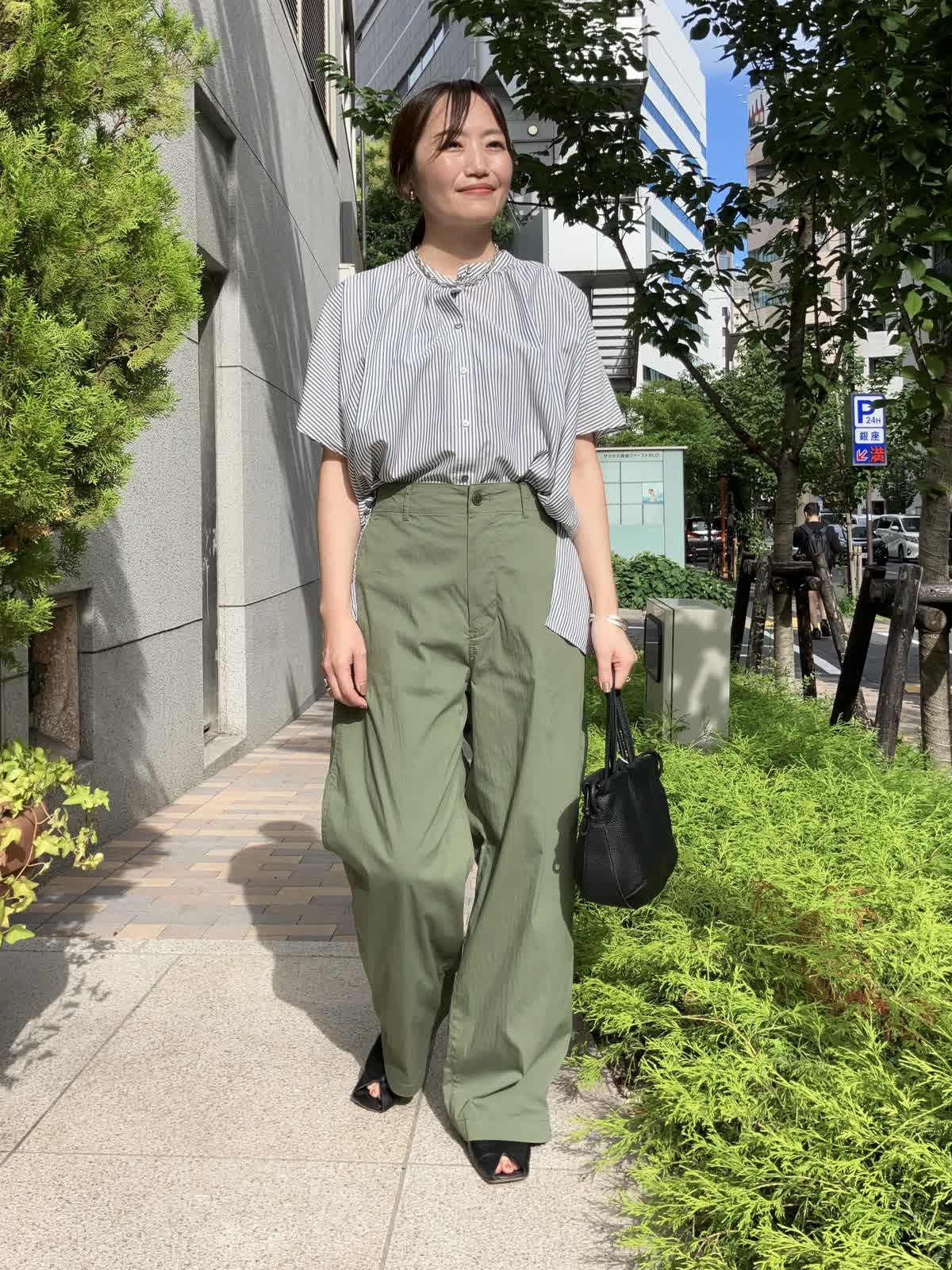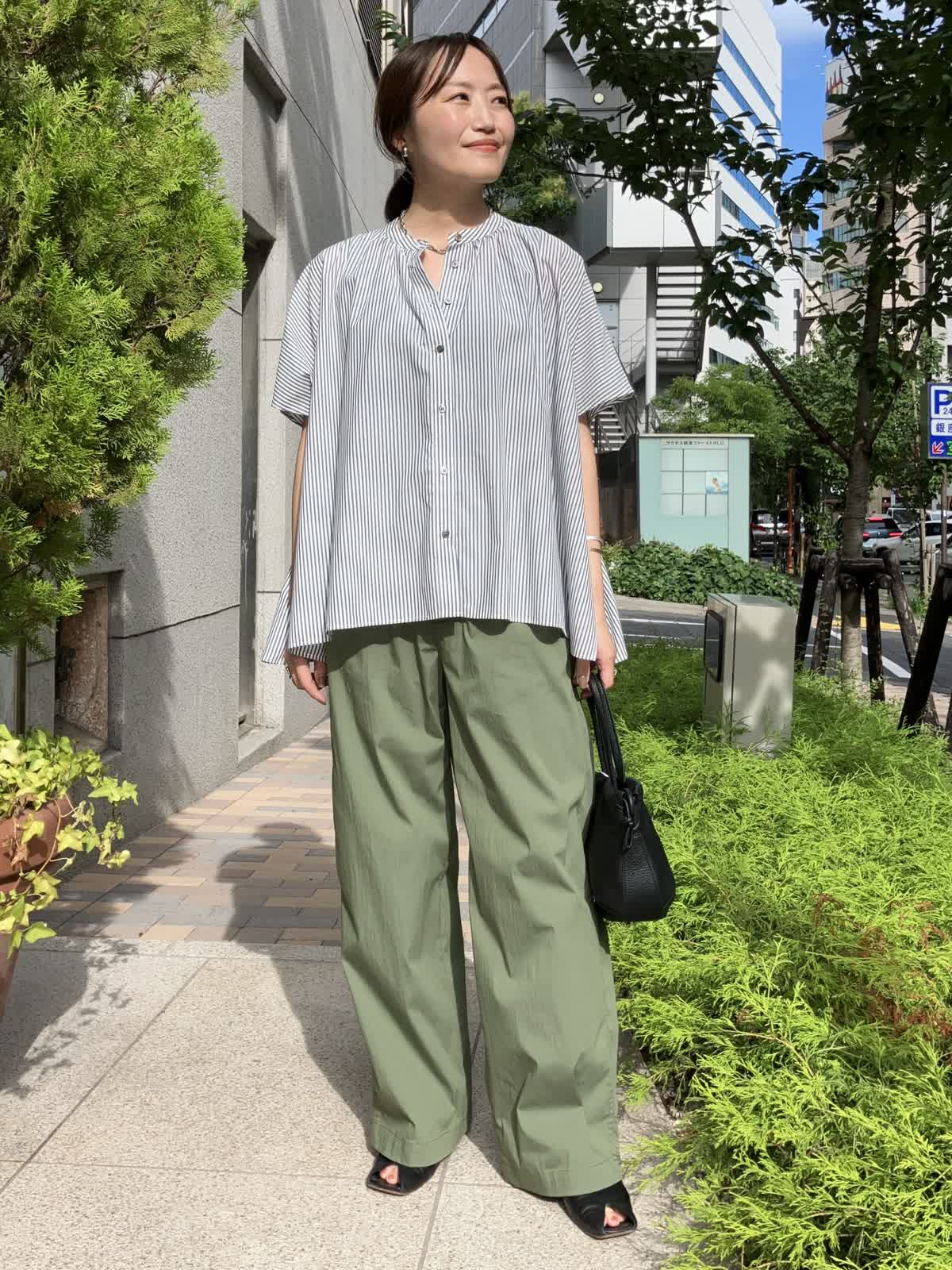 【着用サイズ】ブラウス:フリー パンツ:9号【着用カラー】ブラウス:ストライプ パンツ:カーキ 爽やかで清潔感のあるブラウスコーデ。体のラインを拾わないブラウスはタックインもアウトもどちらのスタイルも楽しめます。二の腕もカバーしてくれるので安心です。カジュアルなパンツと合わせればアクティブに過ごす日も大活躍。