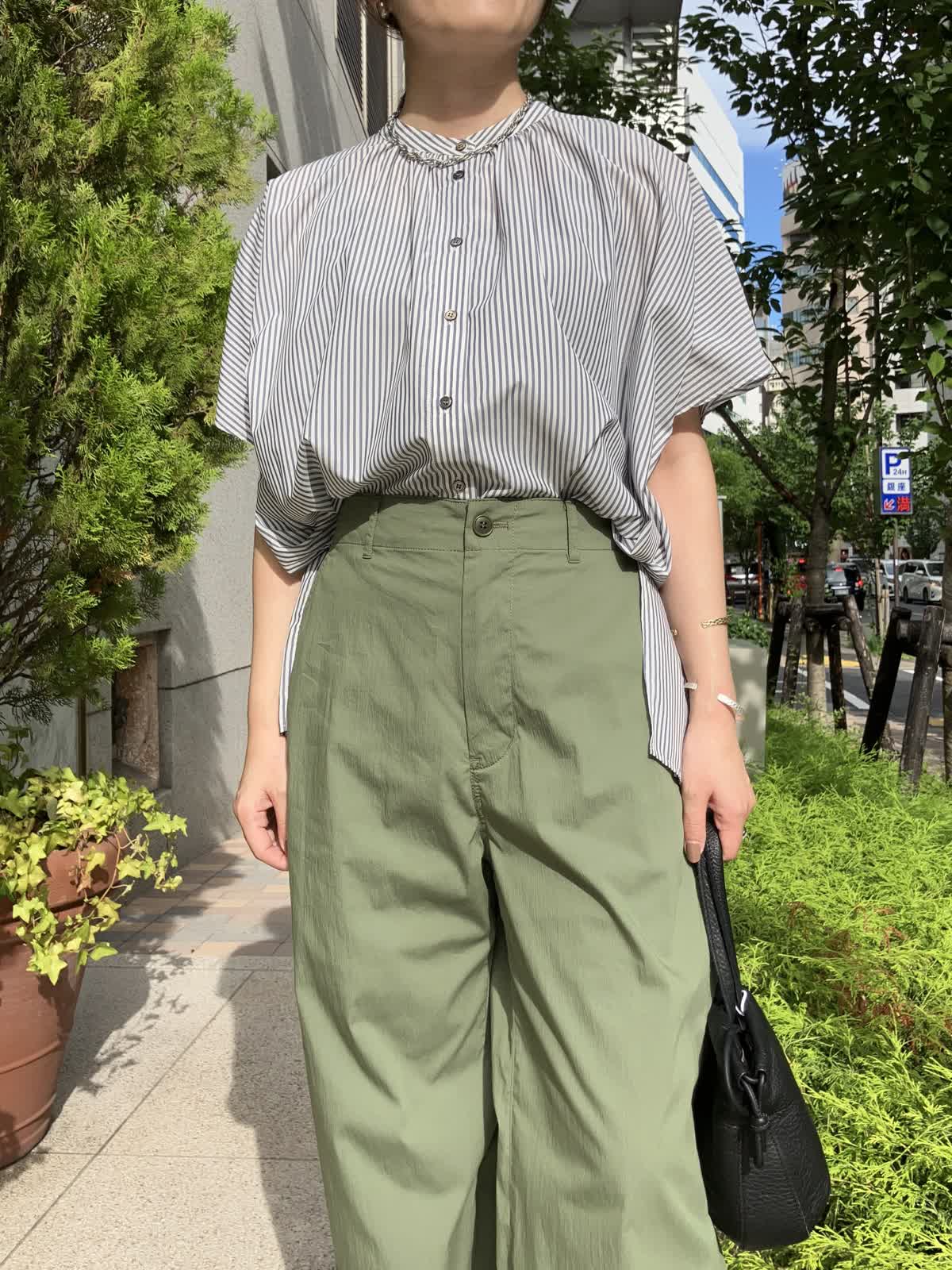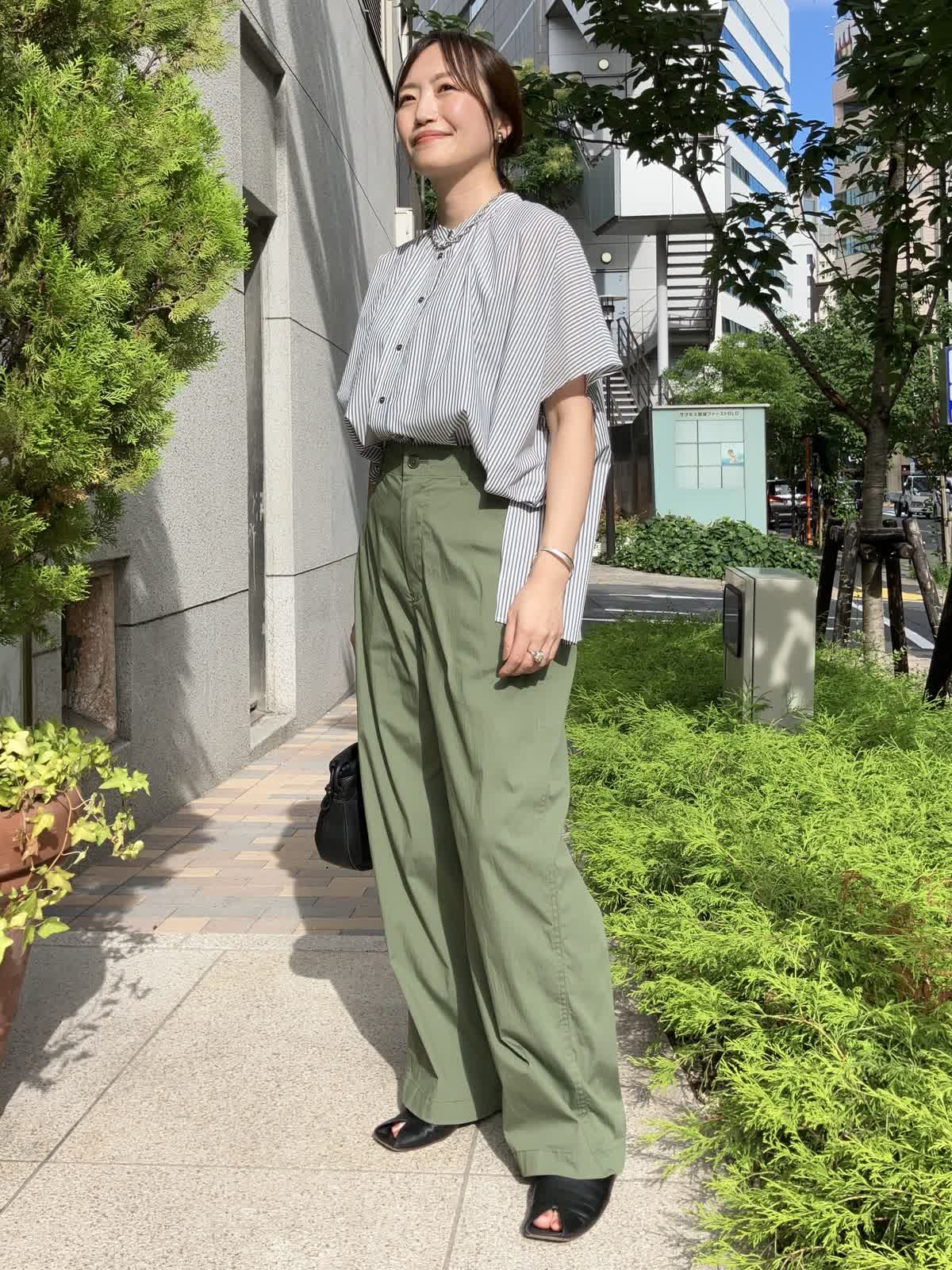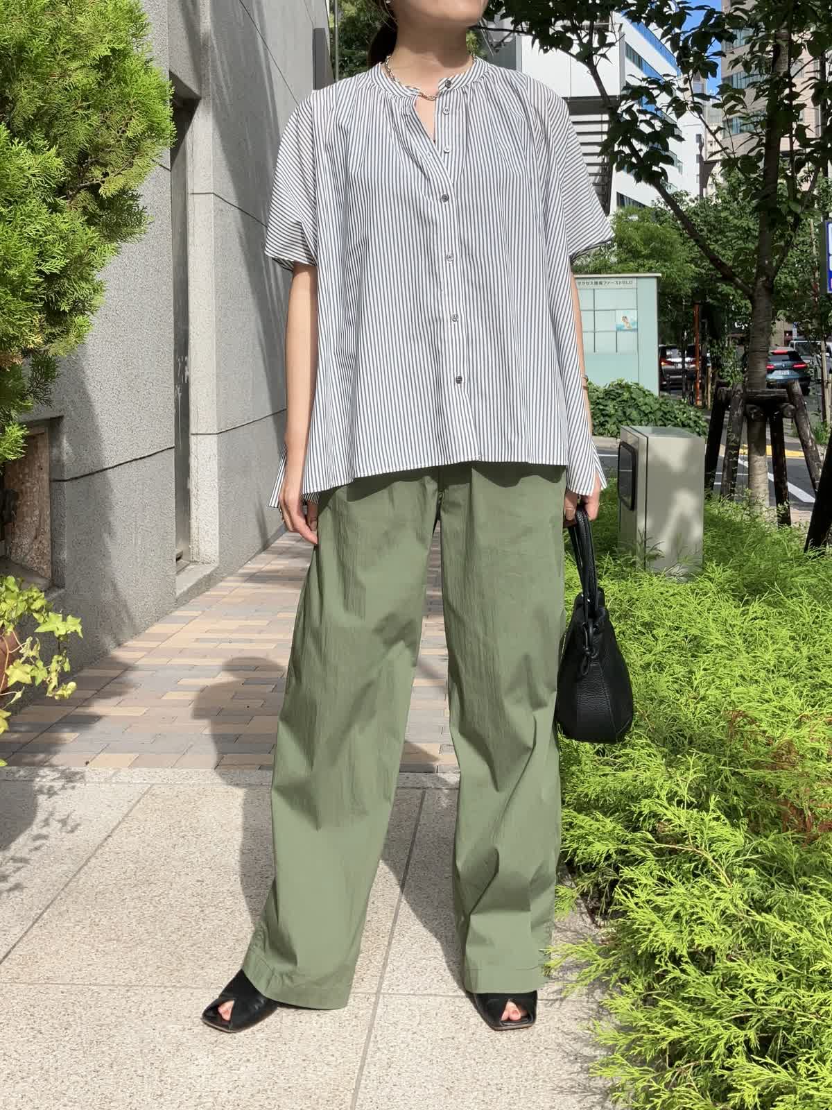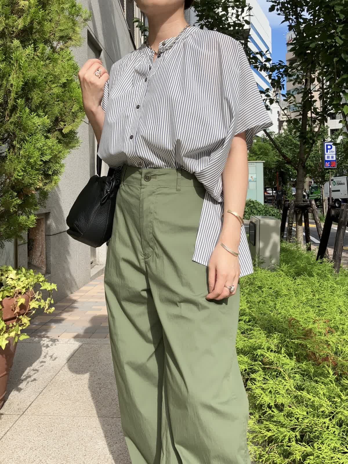 【着用サイズ】ブラウス:フリー パンツ:9号【着用カラー】ブラウス:ストライプ パンツ:カーキ 爽やかで清潔感のあるブラウスコーデ。体のラインを拾わないブラウスはタックインもアウトもどちらのスタイルも楽しめます。二の腕もカバーしてくれるので安心です。カジュアルなパンツと合わせればアクティブに過ごす日も大活躍。