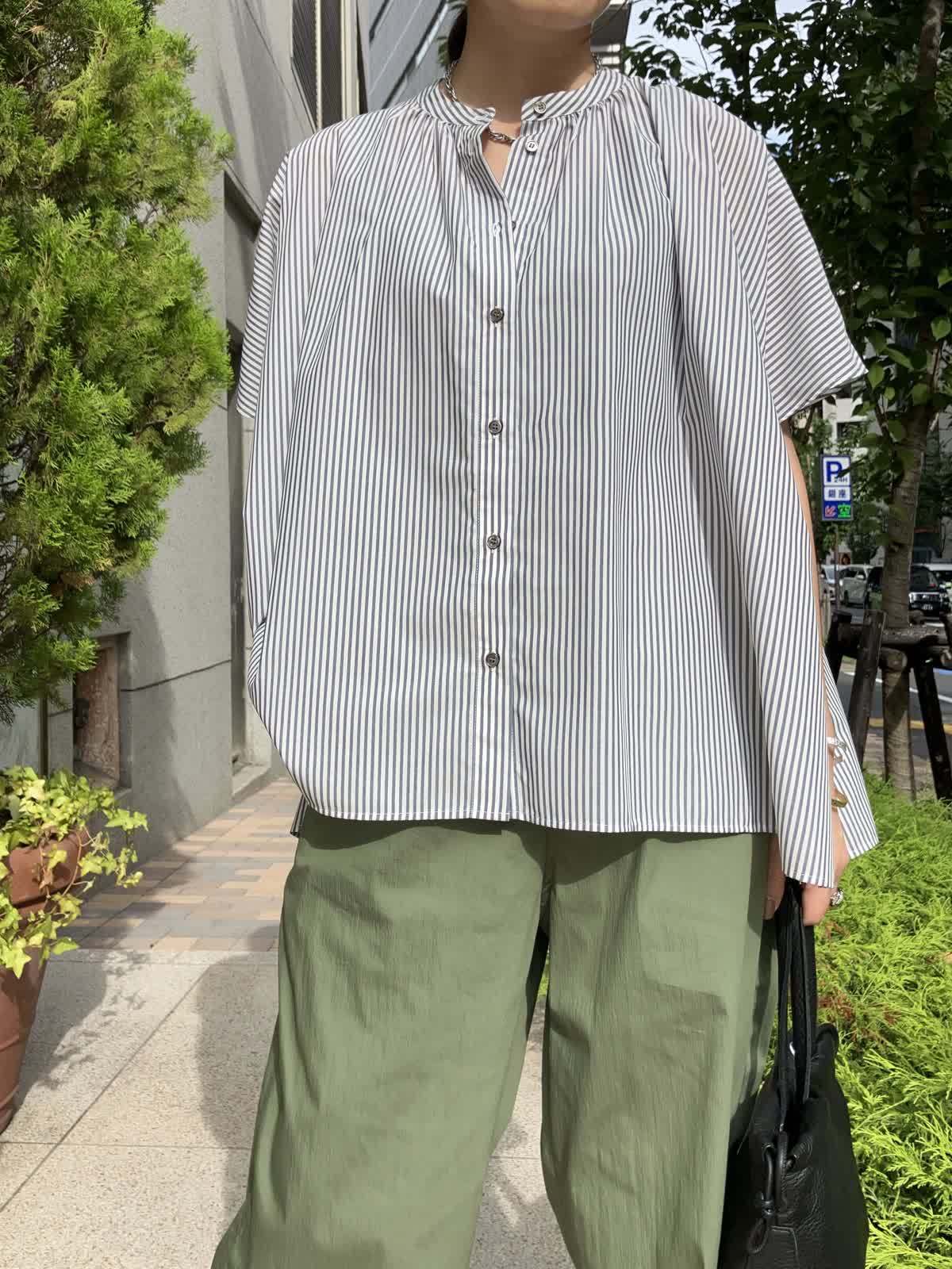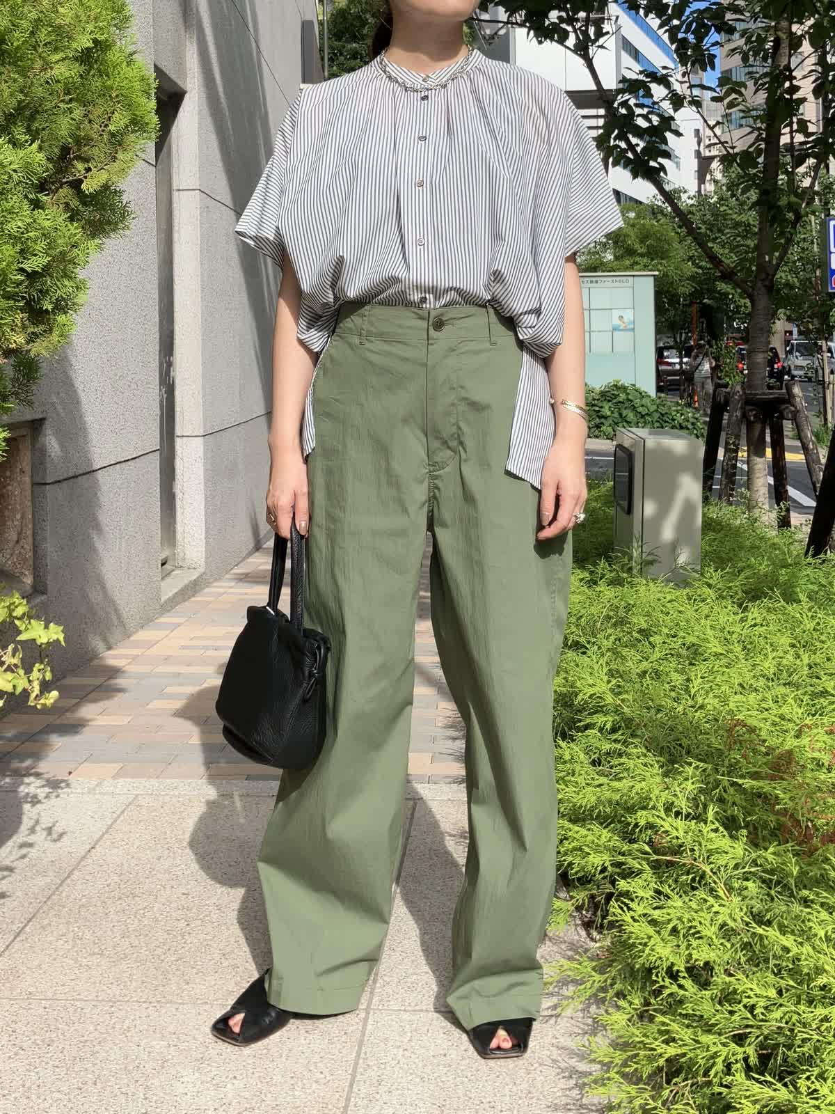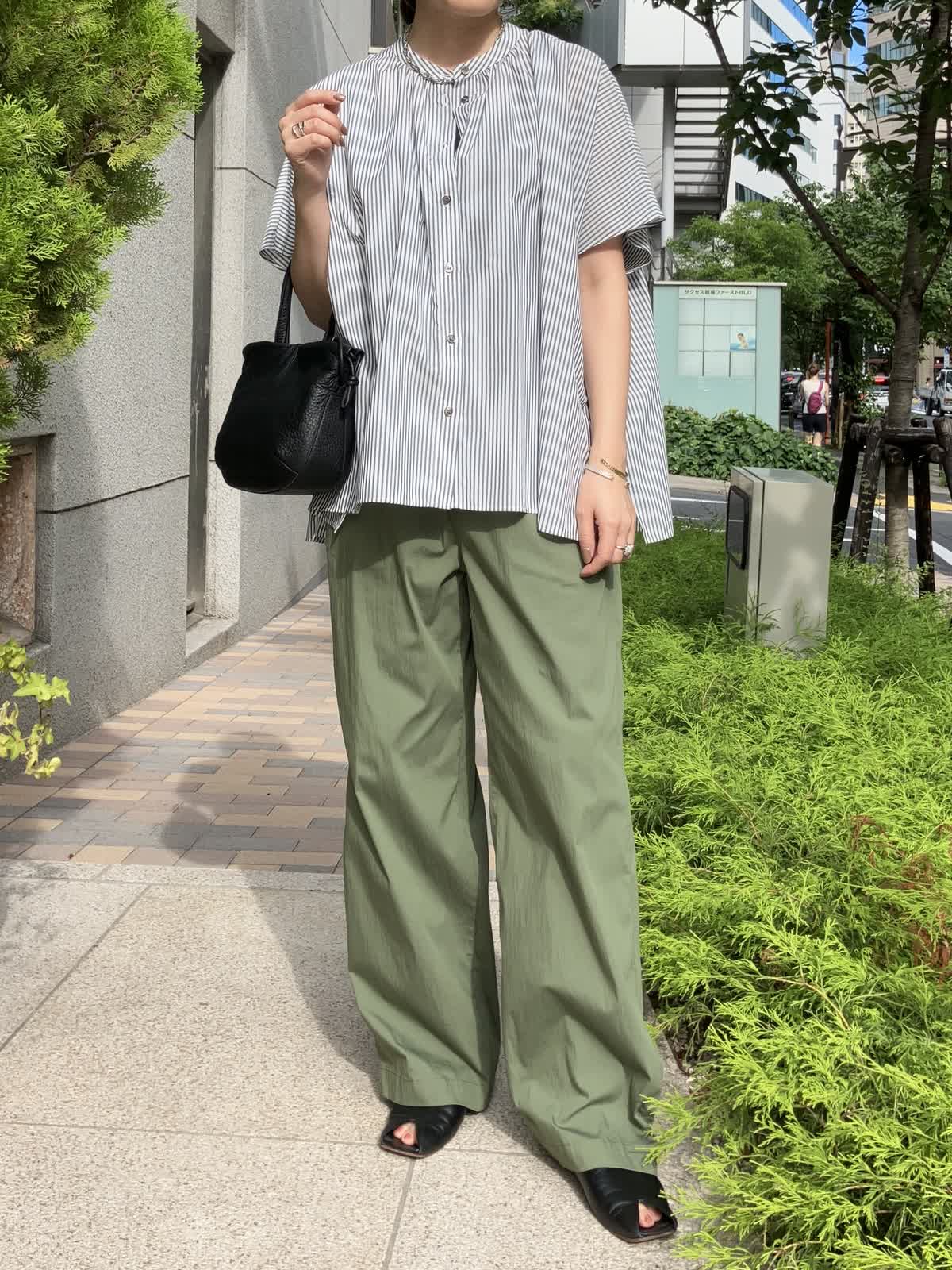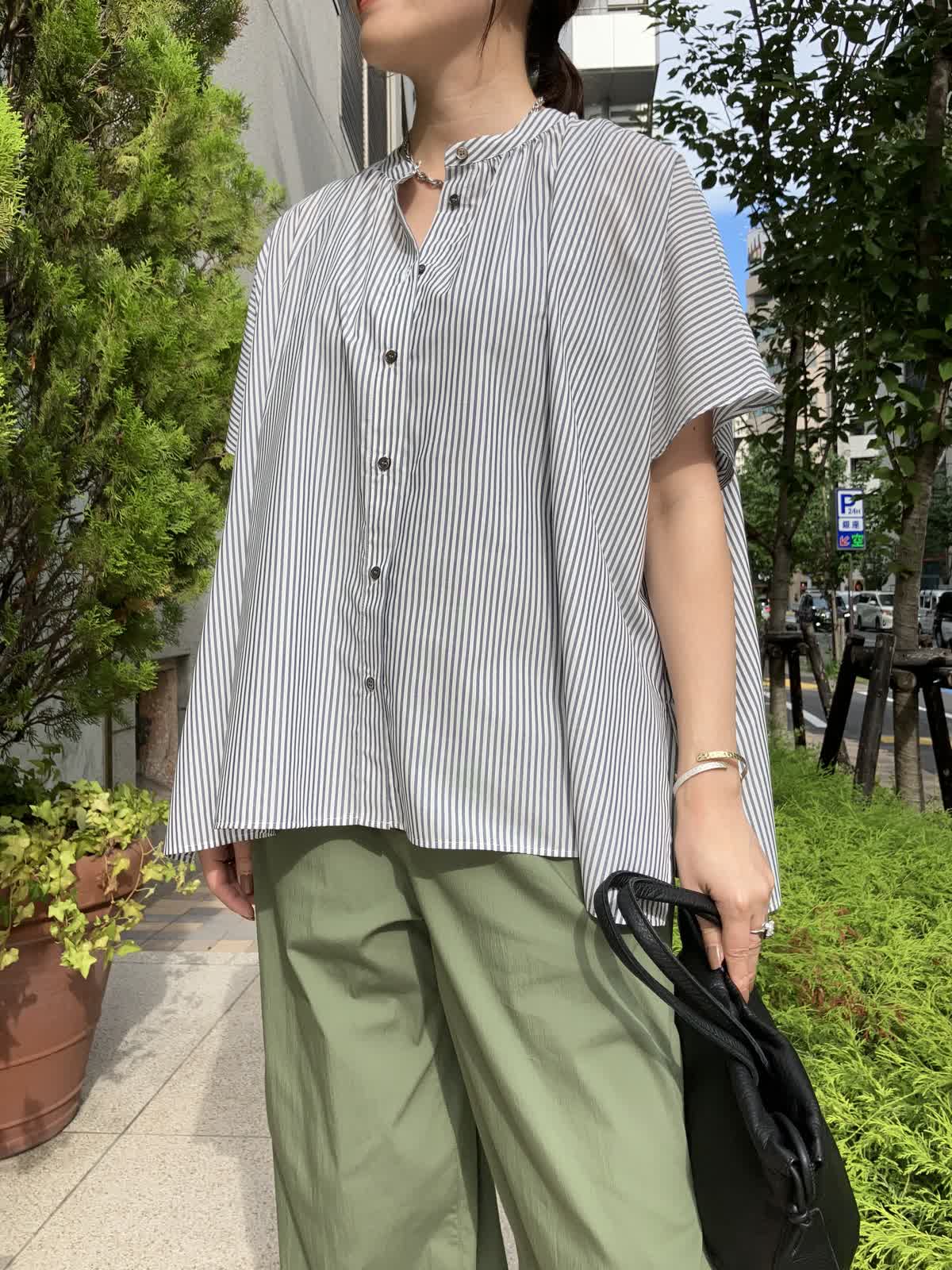 【着用サイズ】ブラウス:フリー パンツ:9号【着用カラー】ブラウス:ストライプ パンツ:カーキ 爽やかで清潔感のあるブラウスコーデ。体のラインを拾わないブラウスはタックインもアウトもどちらのスタイルも楽しめます。二の腕もカバーしてくれるので安心です。カジュアルなパンツと合わせればアクティブに過ごす日も大活躍。