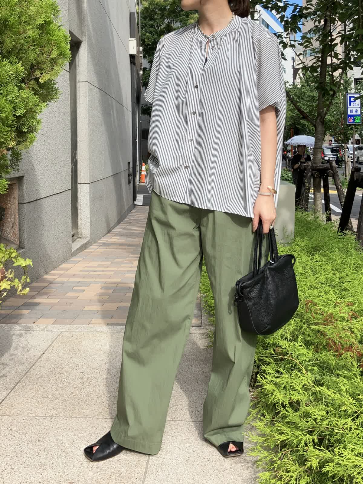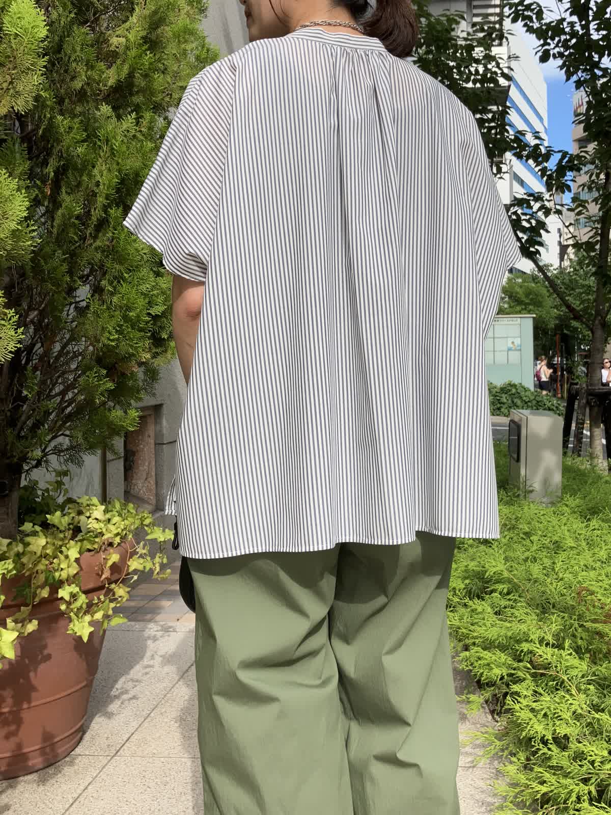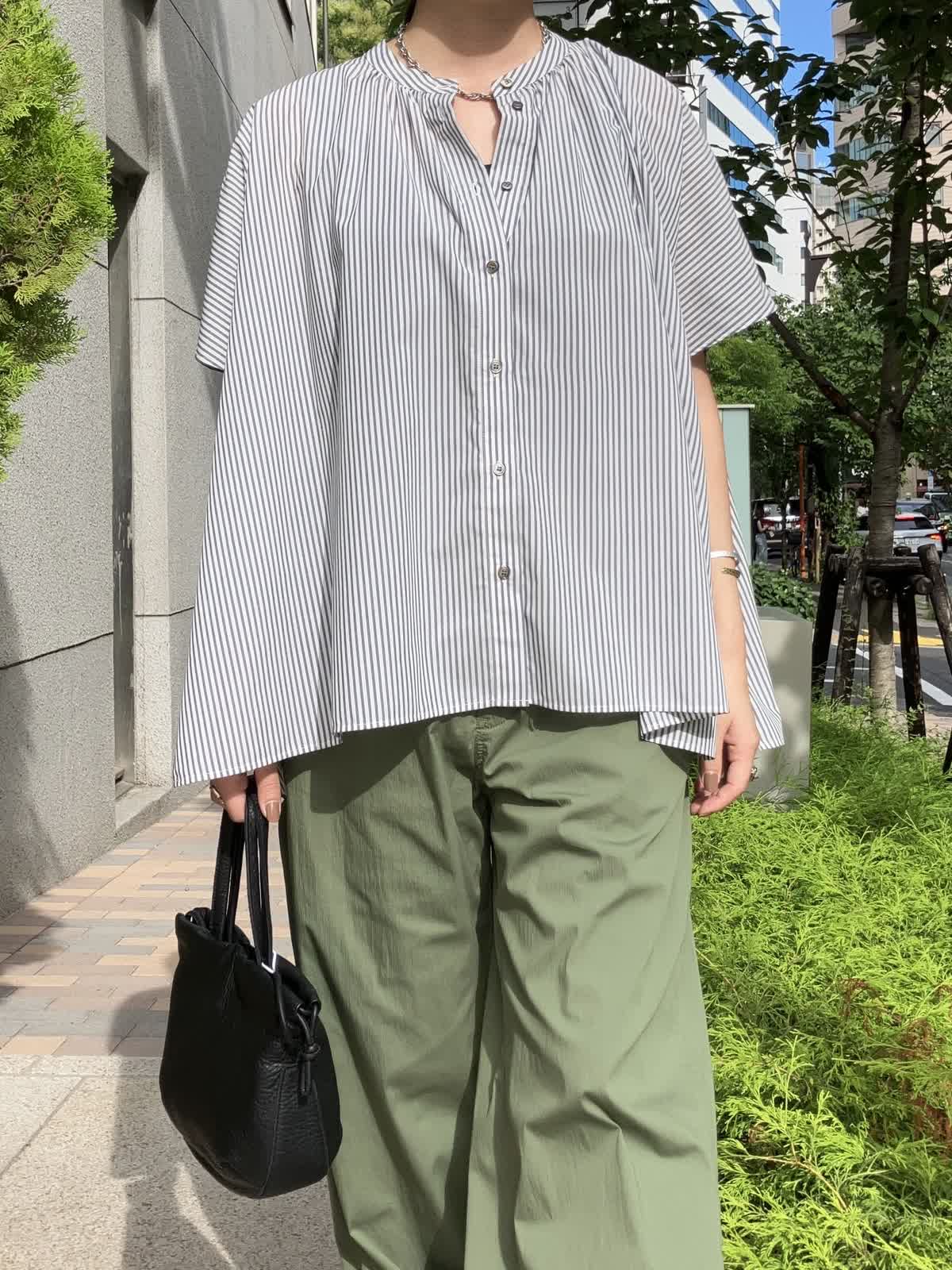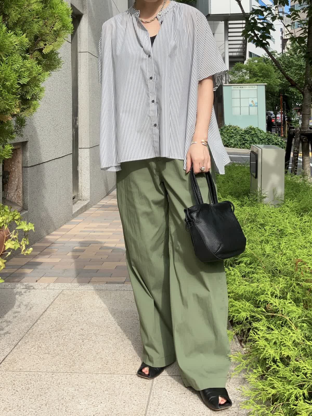 【着用サイズ】ブラウス:フリー パンツ:9号【着用カラー】ブラウス:ストライプ パンツ:カーキ 爽やかで清潔感のあるブラウスコーデ。体のラインを拾わないブラウスはタックインもアウトもどちらのスタイルも楽しめます。二の腕もカバーしてくれるので安心です。カジュアルなパンツと合わせればアクティブに過ごす日も大活躍。
