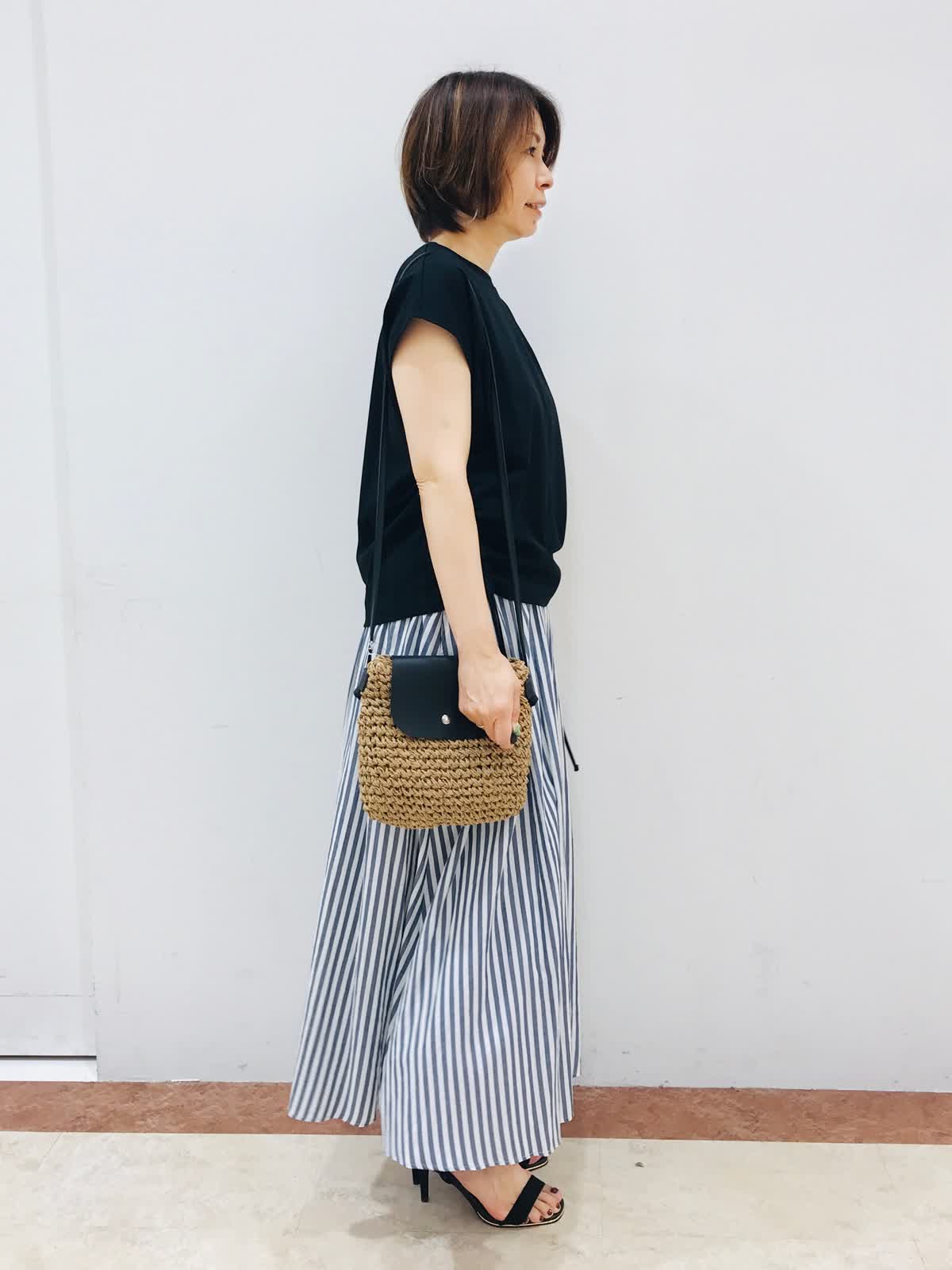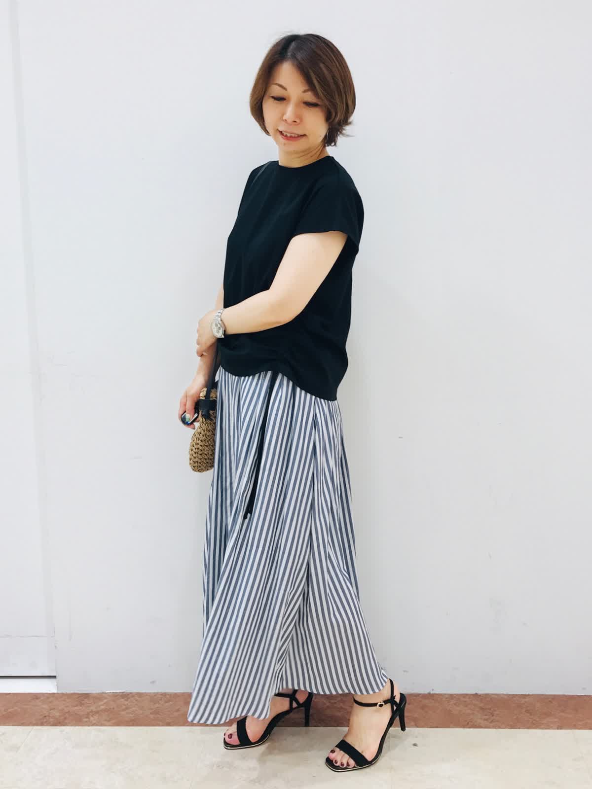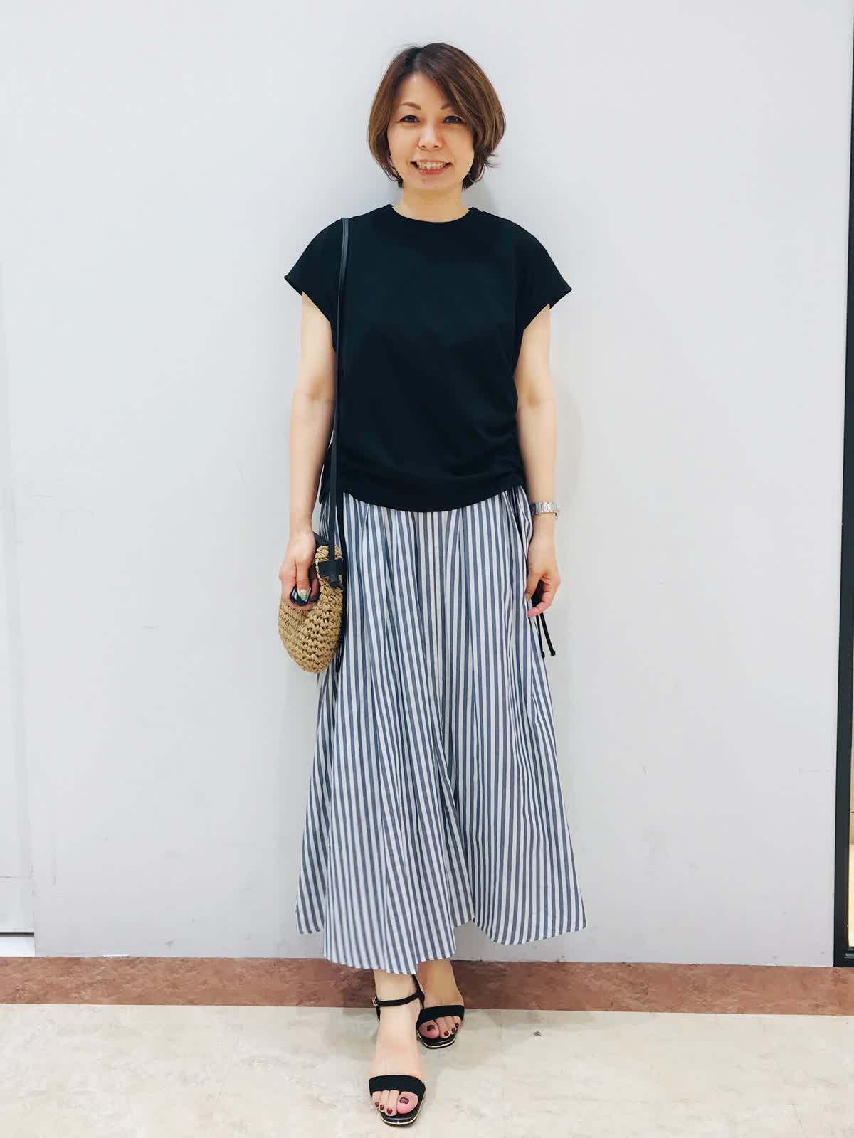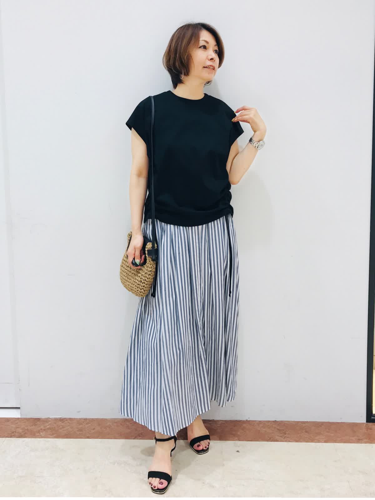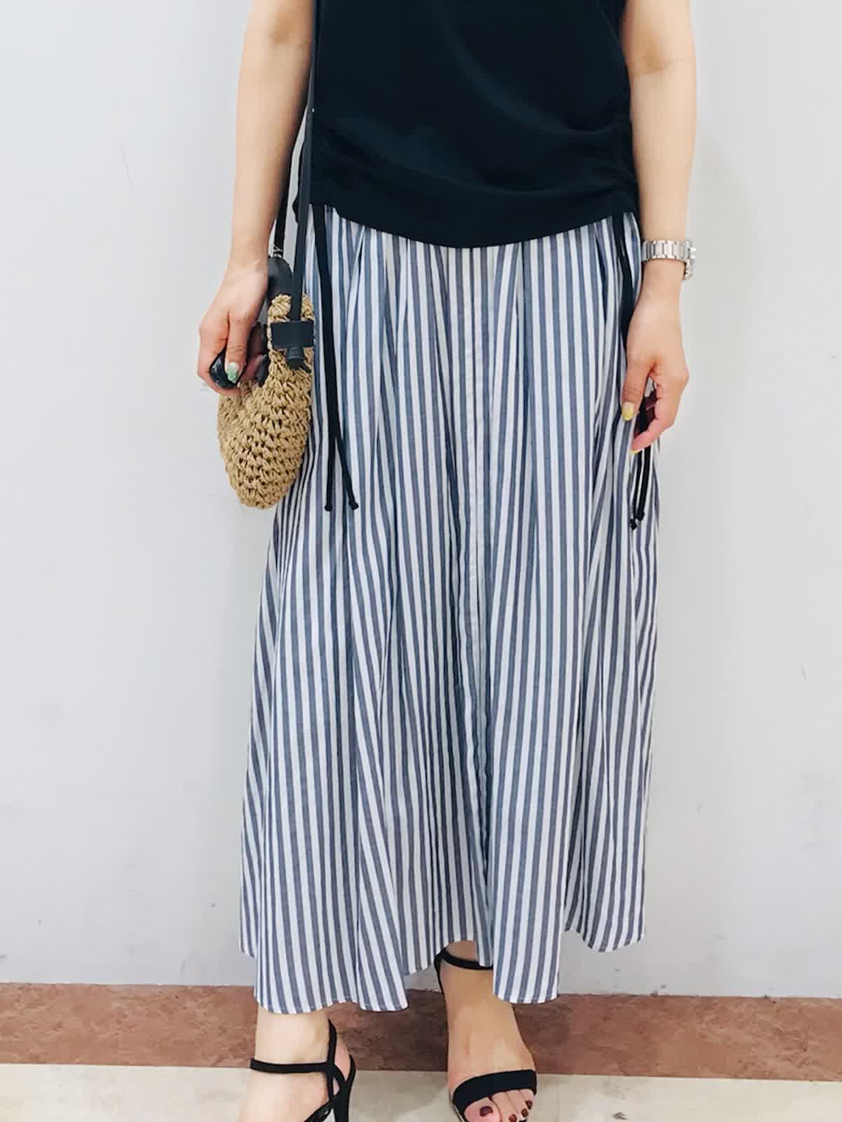 ギャザースカートは、シーズンピッタリな清涼感と軽さ、又、ウエスト総ゴム仕様なので楽に着れるのが嬉しいです。この夏おすすめスタイリングです!