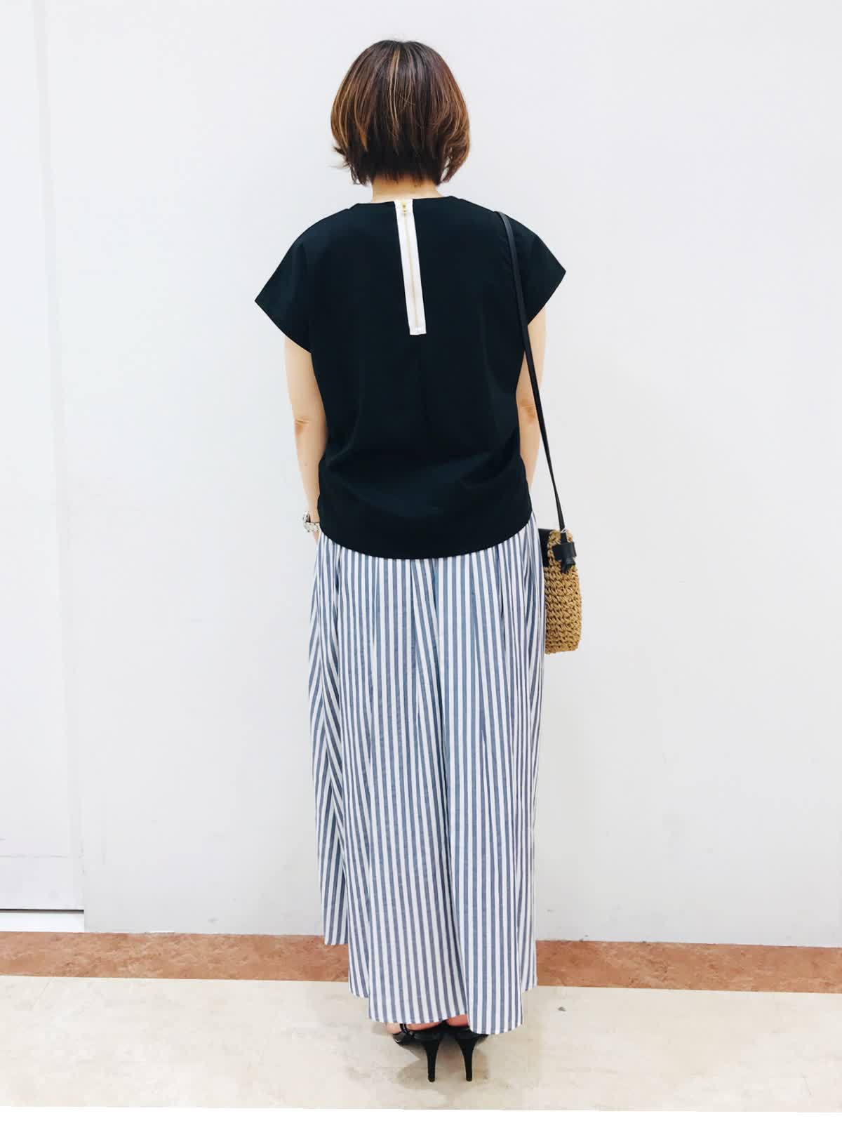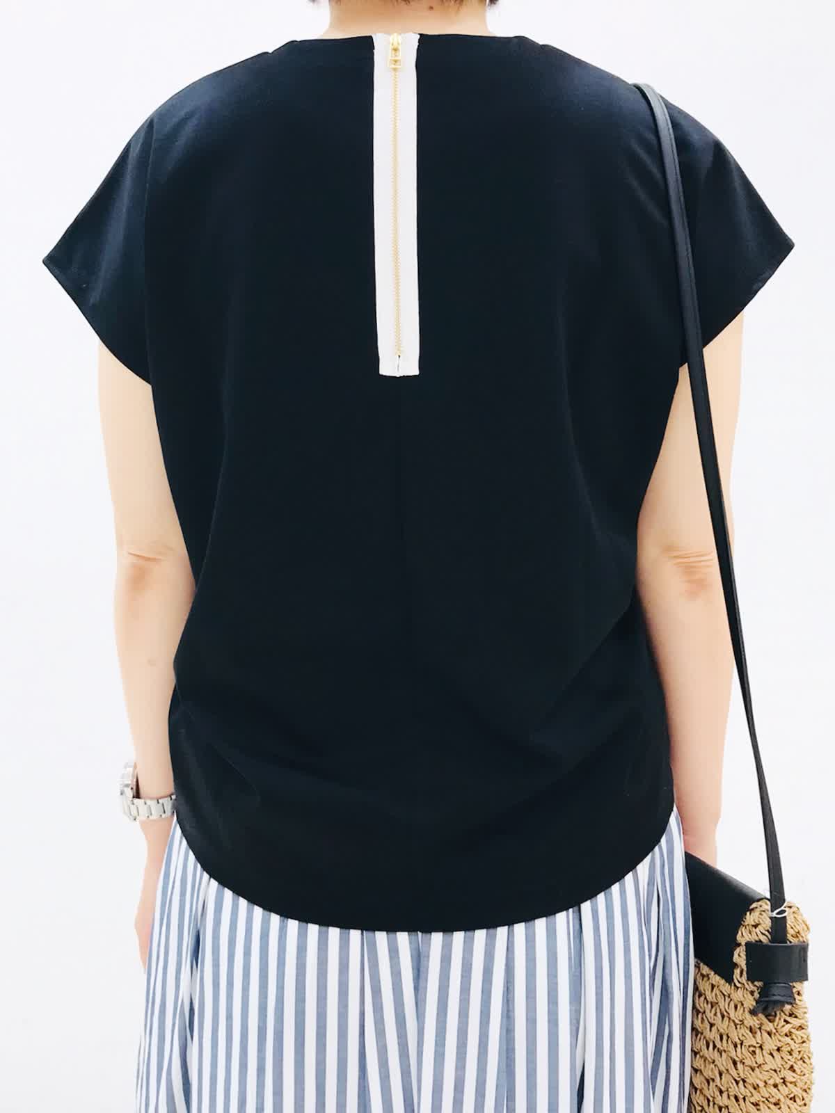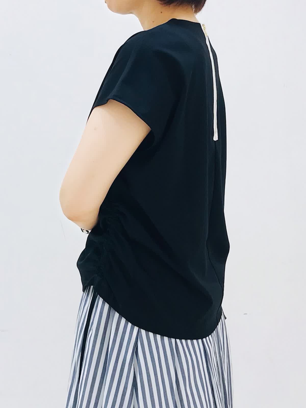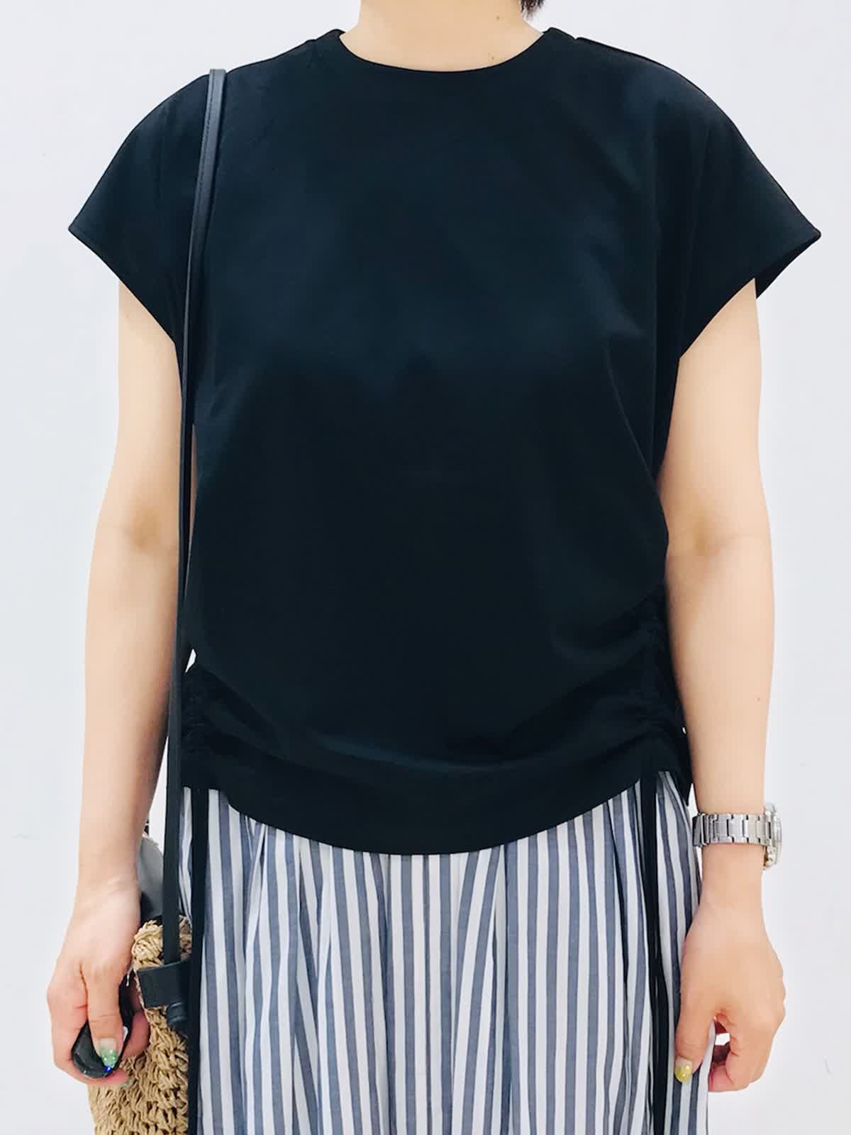 【着用カラー】カットソー:ブラック スカート:ストライプ 大人カジュアル休日お出かけ!《コラボSTORY》ギャザーカットソーは、両サイド調整可能なので、好みのシルエットで着れますよ。おすすめポイントは、背中ジップのモード感あるアクセントと上品な光沢、ストレッチ性の高い素材のカットソーです。