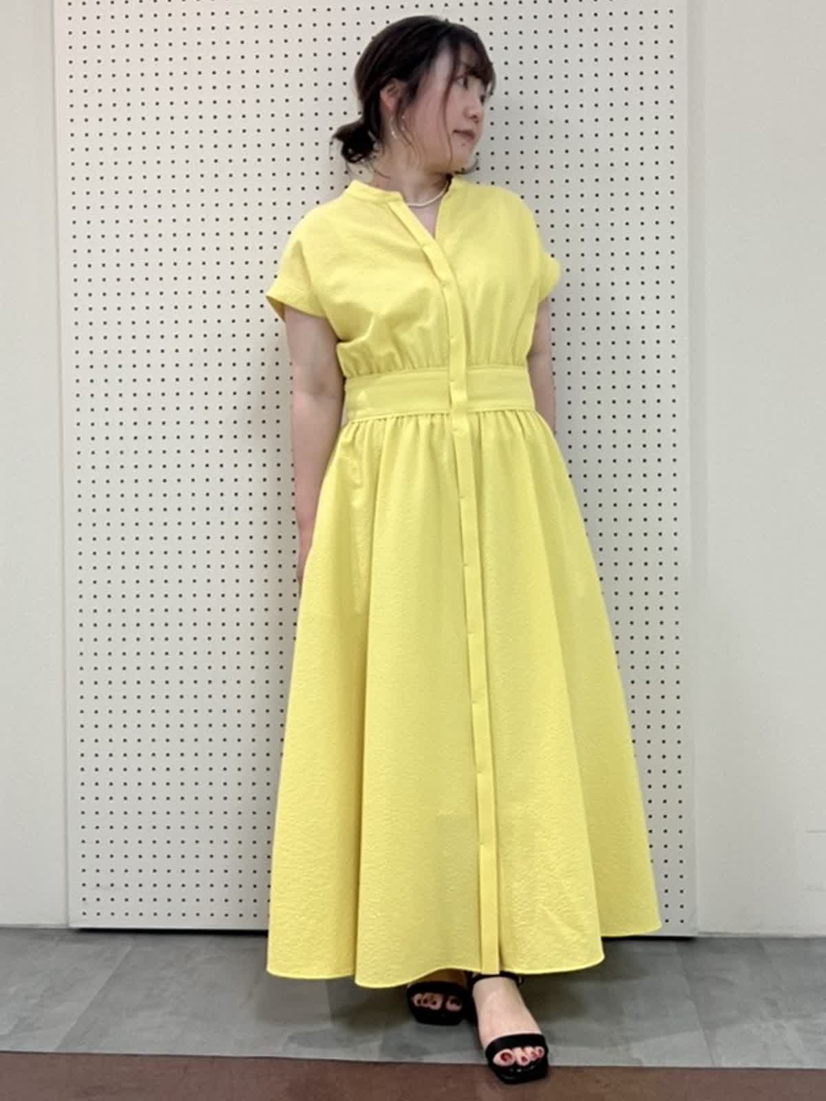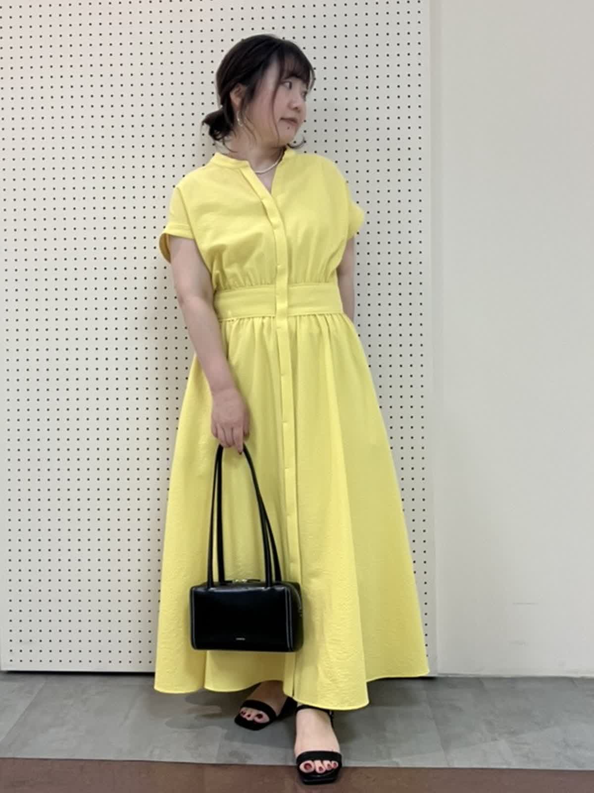 【着用サイズ/カラー】ワンピース:9号/イエロー バッグ:フリー/ブラック 夏のワンピースコーディネート。ワンピースは身体に張り付かない素材でさらっとしていて涼しく、ウエスト後ろがゴムになっていて着心地が良いです。袖もあるので1枚でも着やすいです。