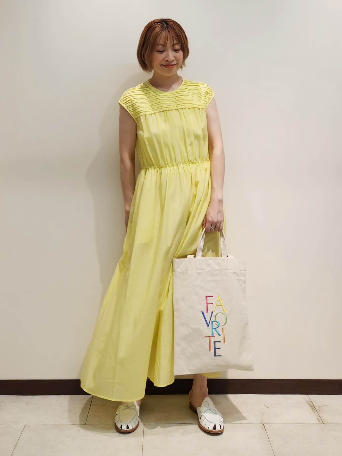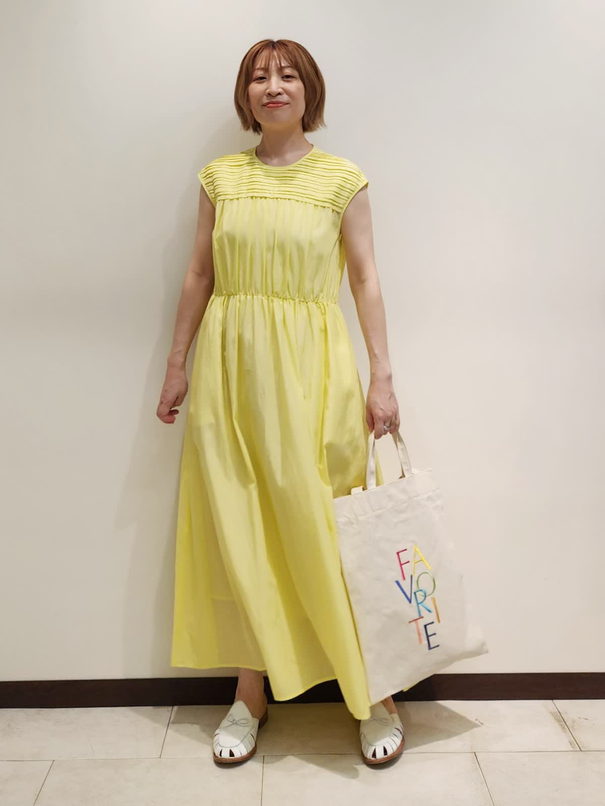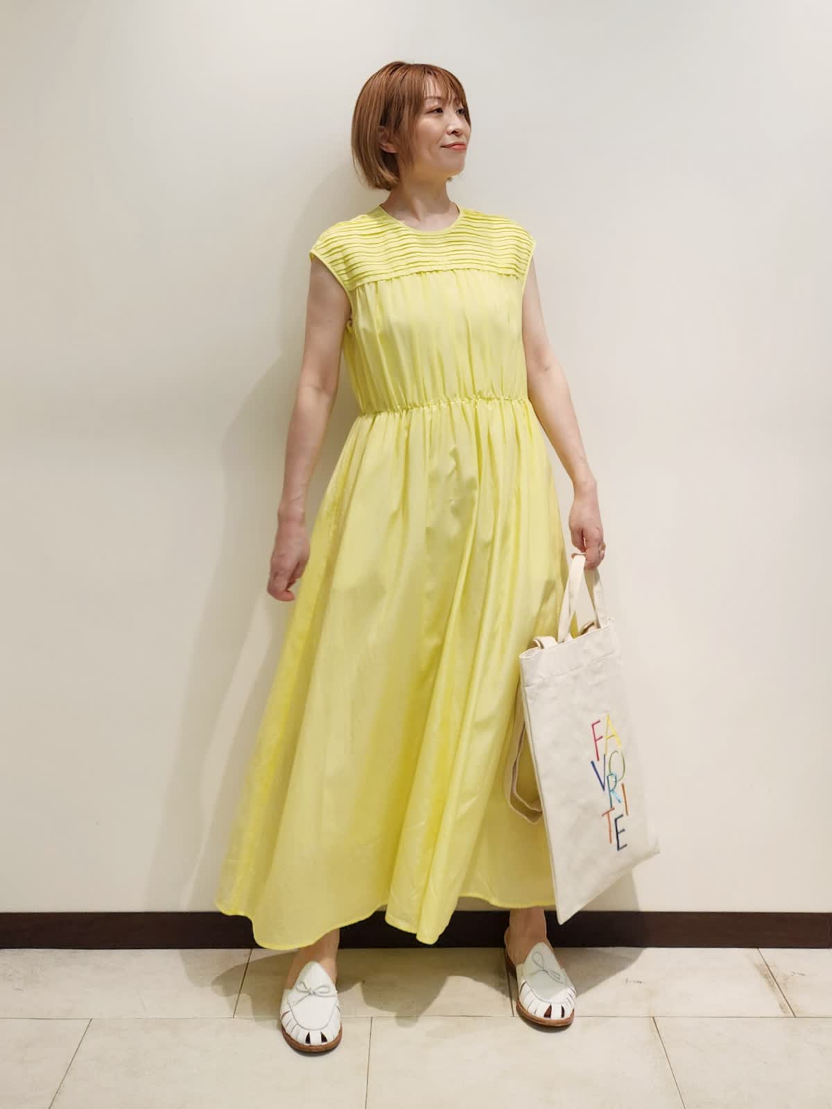 【着用サイズ】ワンピース:9号 【着用カラー】ワンピース:イエロー お出かけが楽しみになるワンピースコーディネート。 フロントのピンタックデザインが繊細で着るだけで仕上がる主役ワンピース。キュプラ×コットンが肌に心地よい一着です。バックはFAVORITEオリジナル《RAINBOW COLLECTION》虹色トートでカラーを楽しんで。