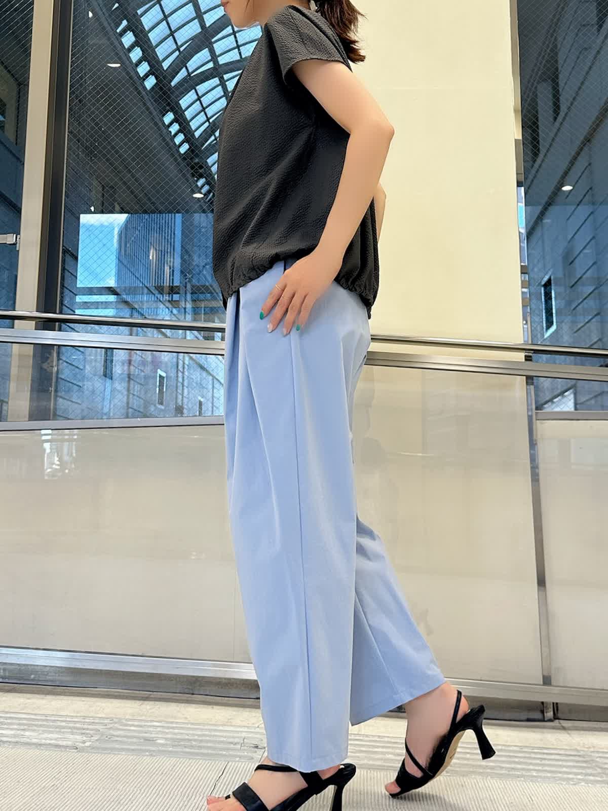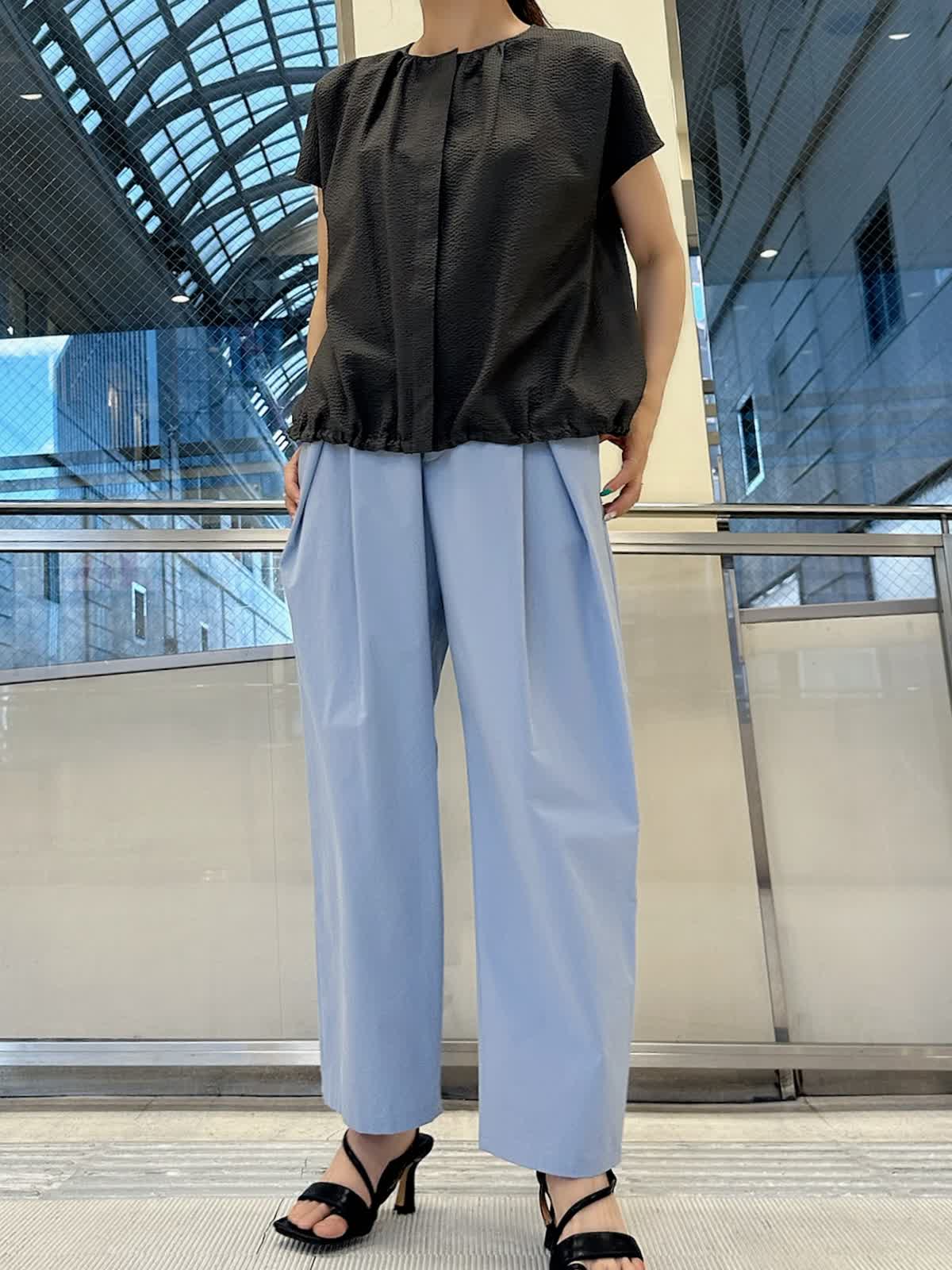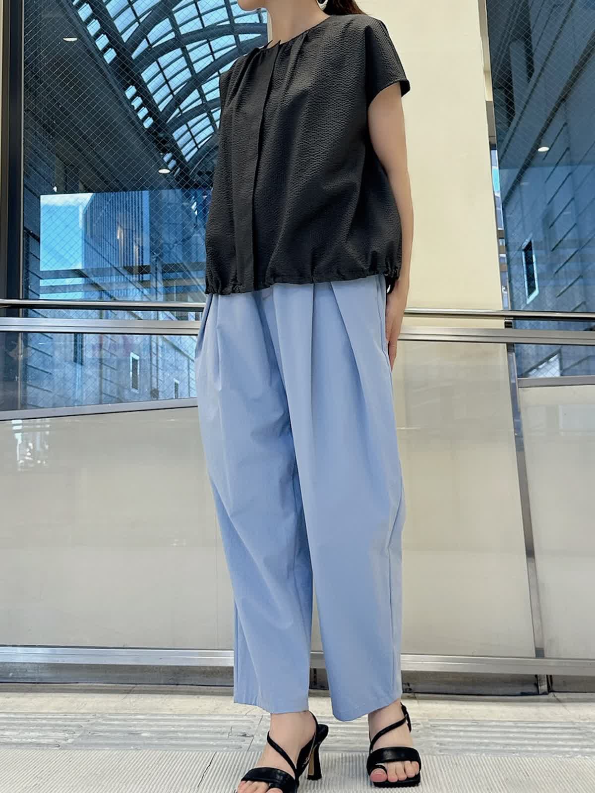 【着用サイズ/カラー】 ブラウス:9号/チャコールグレー パンツ:9号/サックス 暑い夏でも通気性が良く快適に着て頂けるサッカー生地のブラウスは、サックスブルーのパンツと合わせれば見た目から涼し気で爽やかな印象に。チャコールグレーと配色すれば、クールな表情に仕上がります。