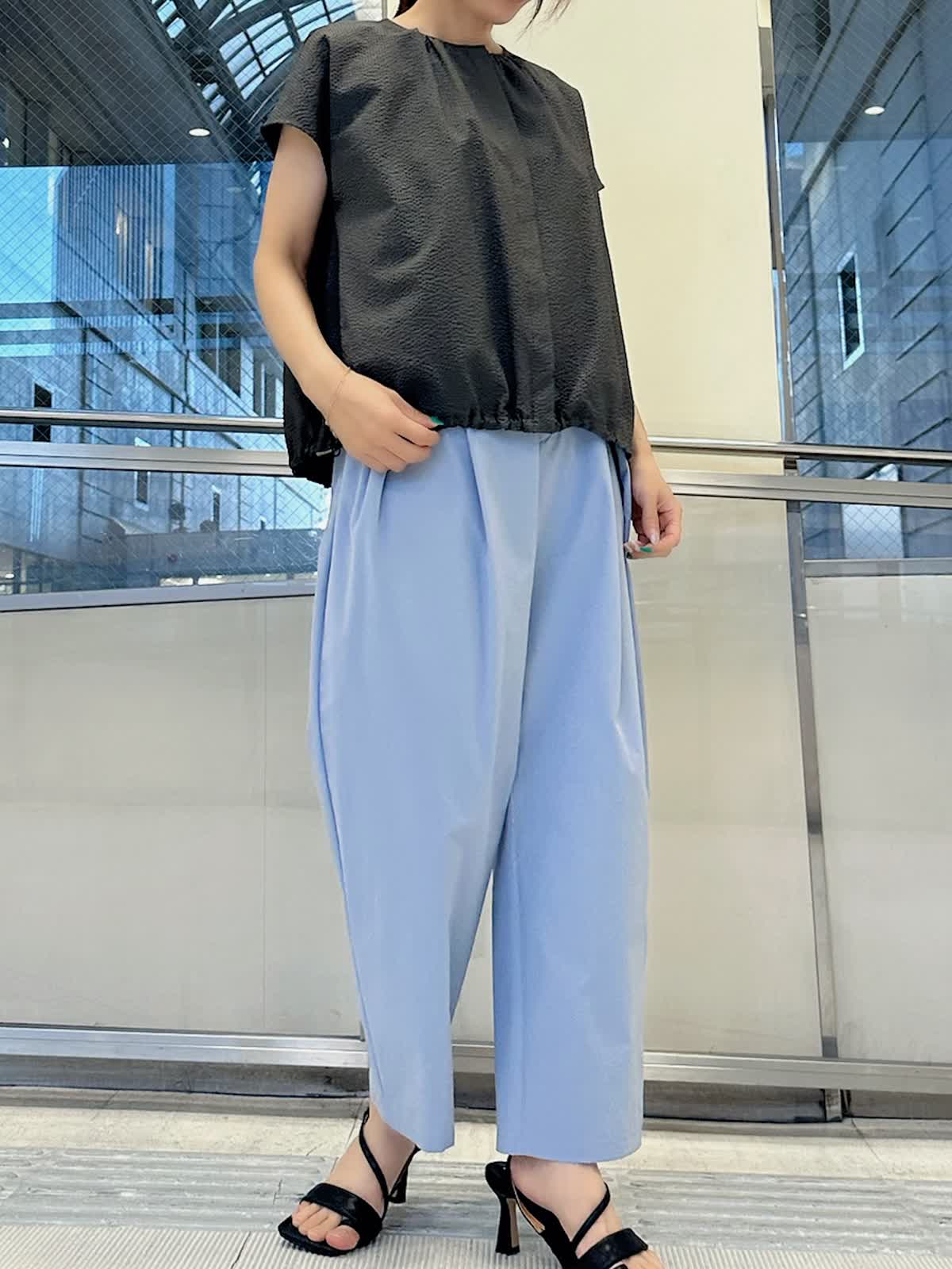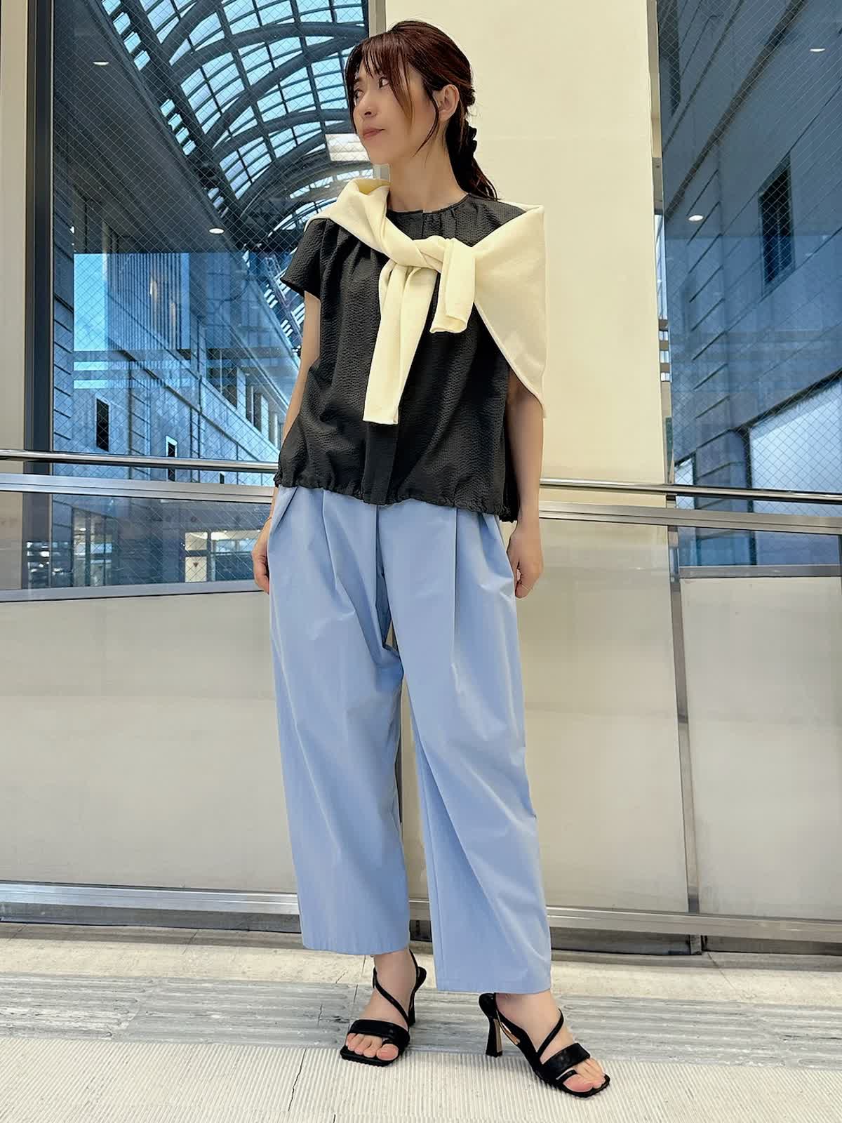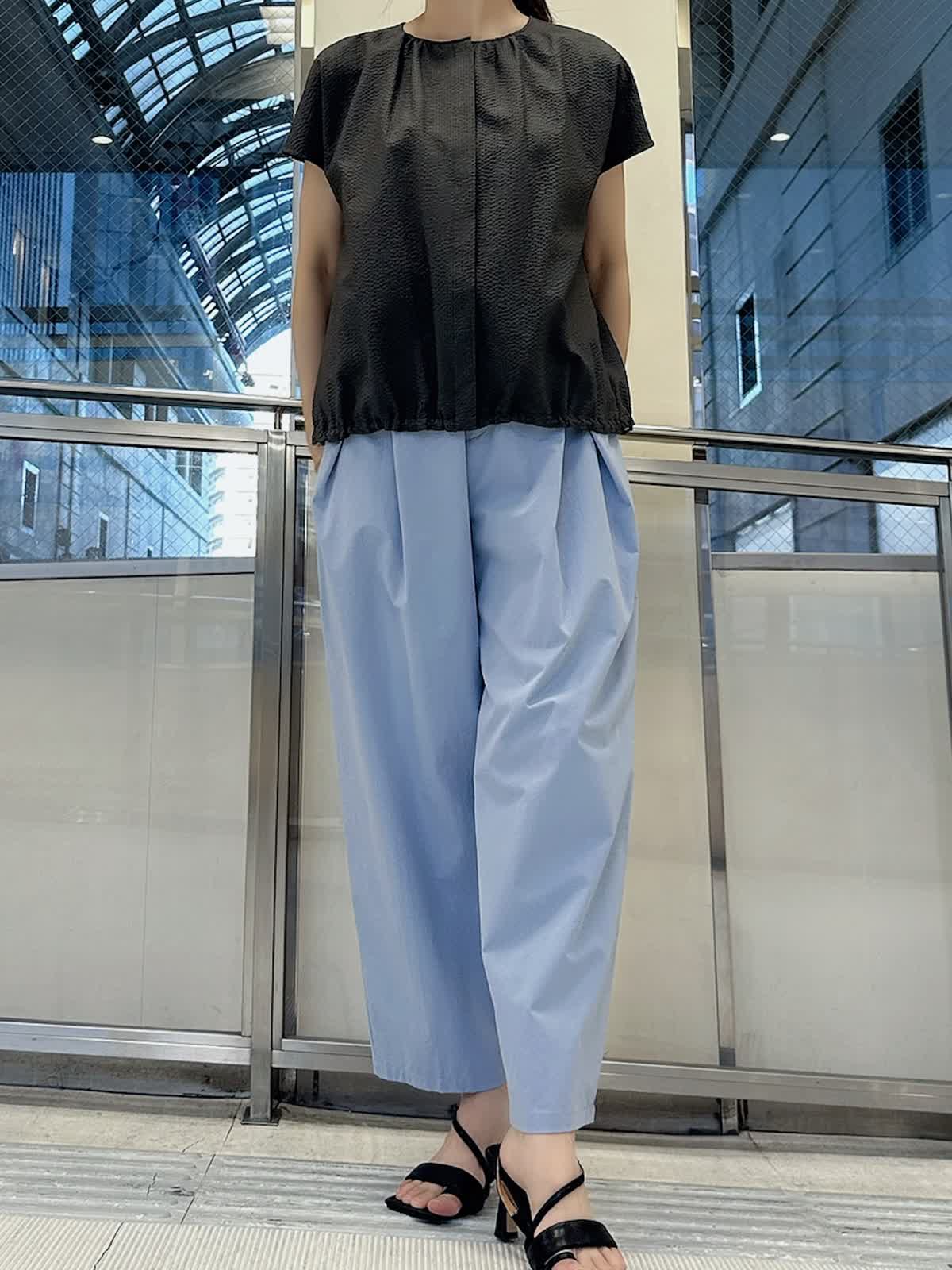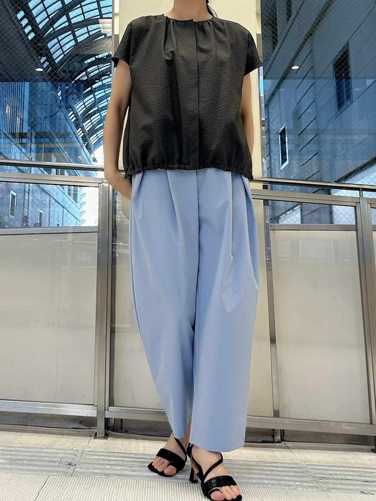【着用サイズ/カラー】 ブラウス:9号/チャコールグレー パンツ:9号/サックス 暑い夏でも通気性が良く快適に着て頂けるサッカー生地のブラウスは、サックスブルーのパンツと合わせれば見た目から涼し気で爽やかな印象に。チャコールグレーと配色すれば、クールな表情に仕上がります。