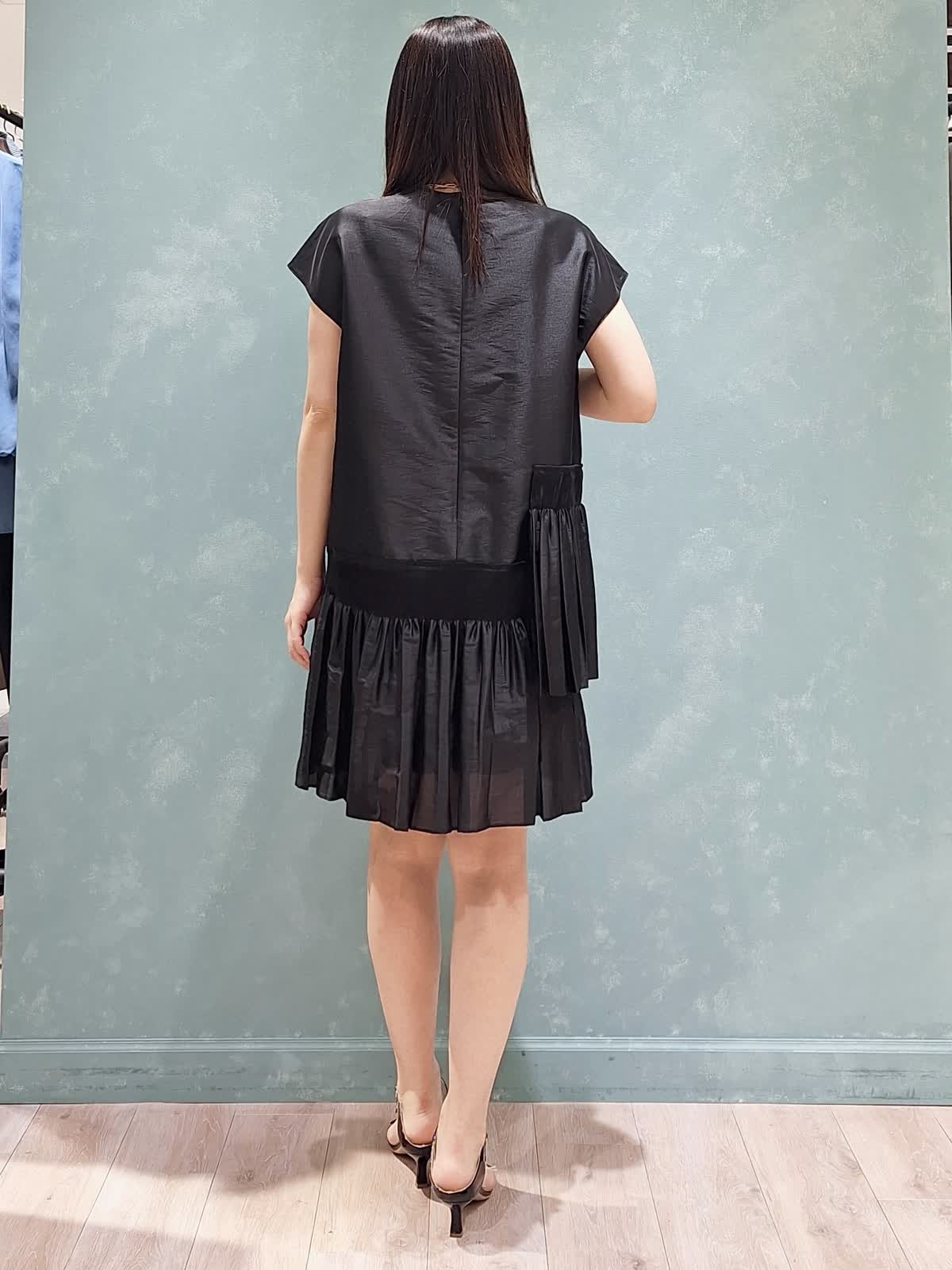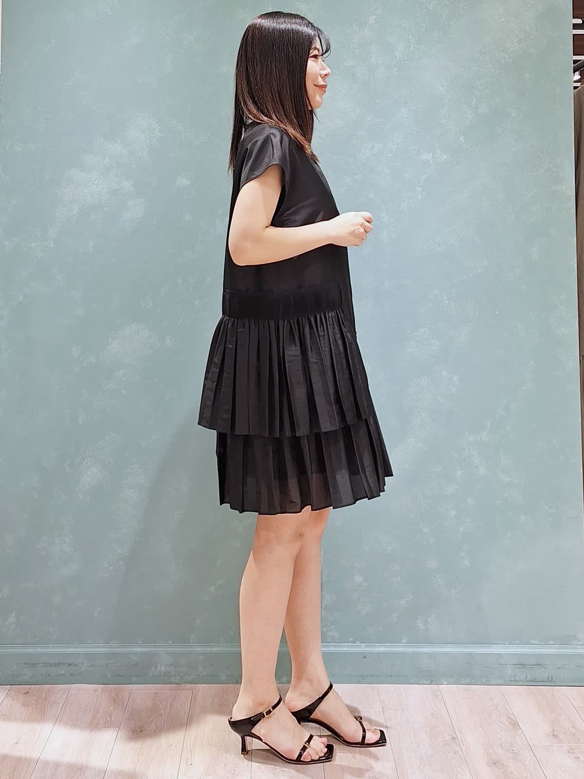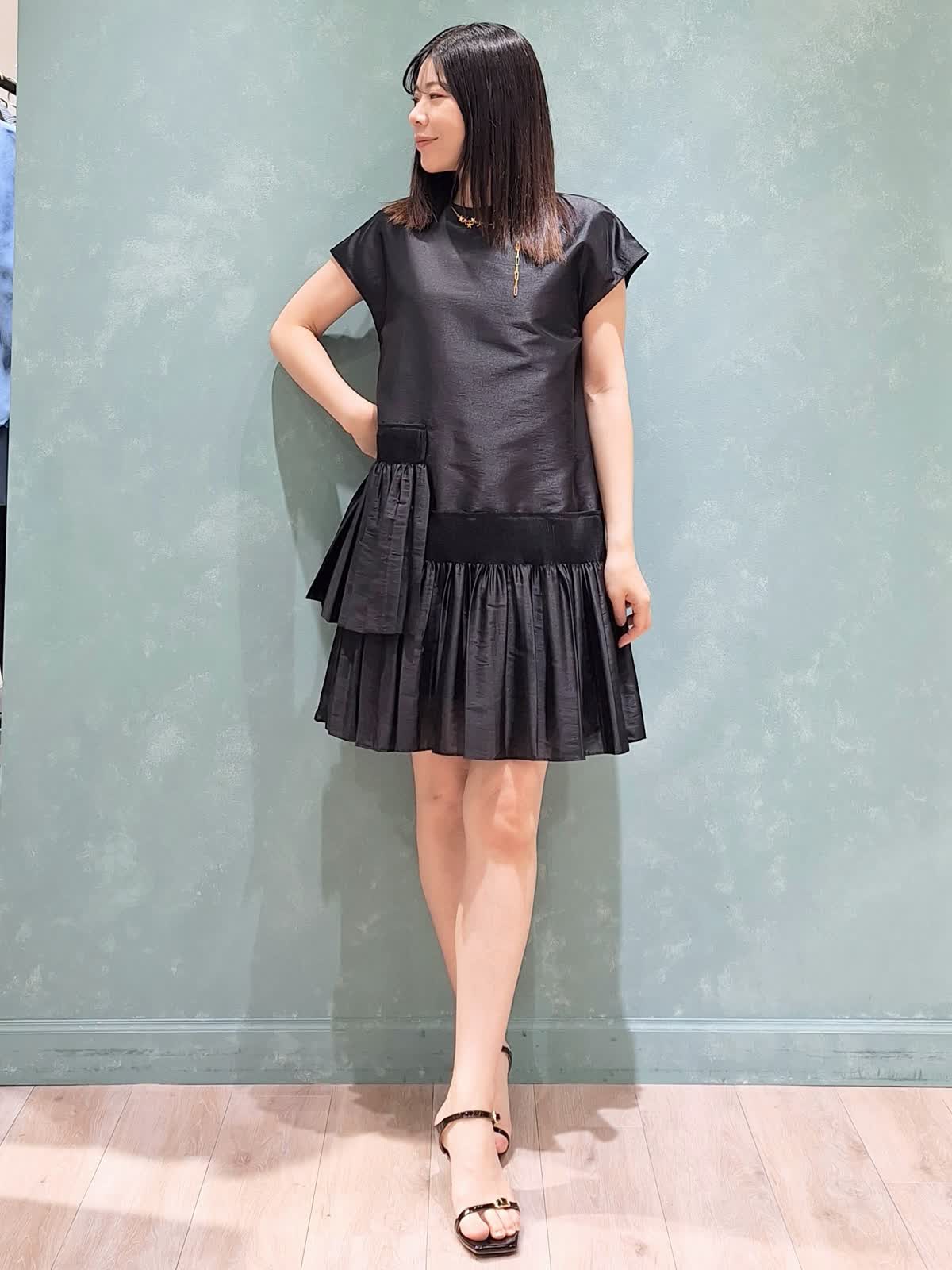 【着用サイズ、カラー】ワンピース7号、ブラック ラヴェイユのミニ丈ワンピース。ハリのある生地感でシルエットが決まります。アシンメトリーなシャーリングプリーツがおしゃれ♪ワンピースで着ても良し、パンツ合わせでチュニックで着ても良し、秋はレザー、ツィードジャケット合わせもお勧め!ロングシーズン活躍するワンピースです。