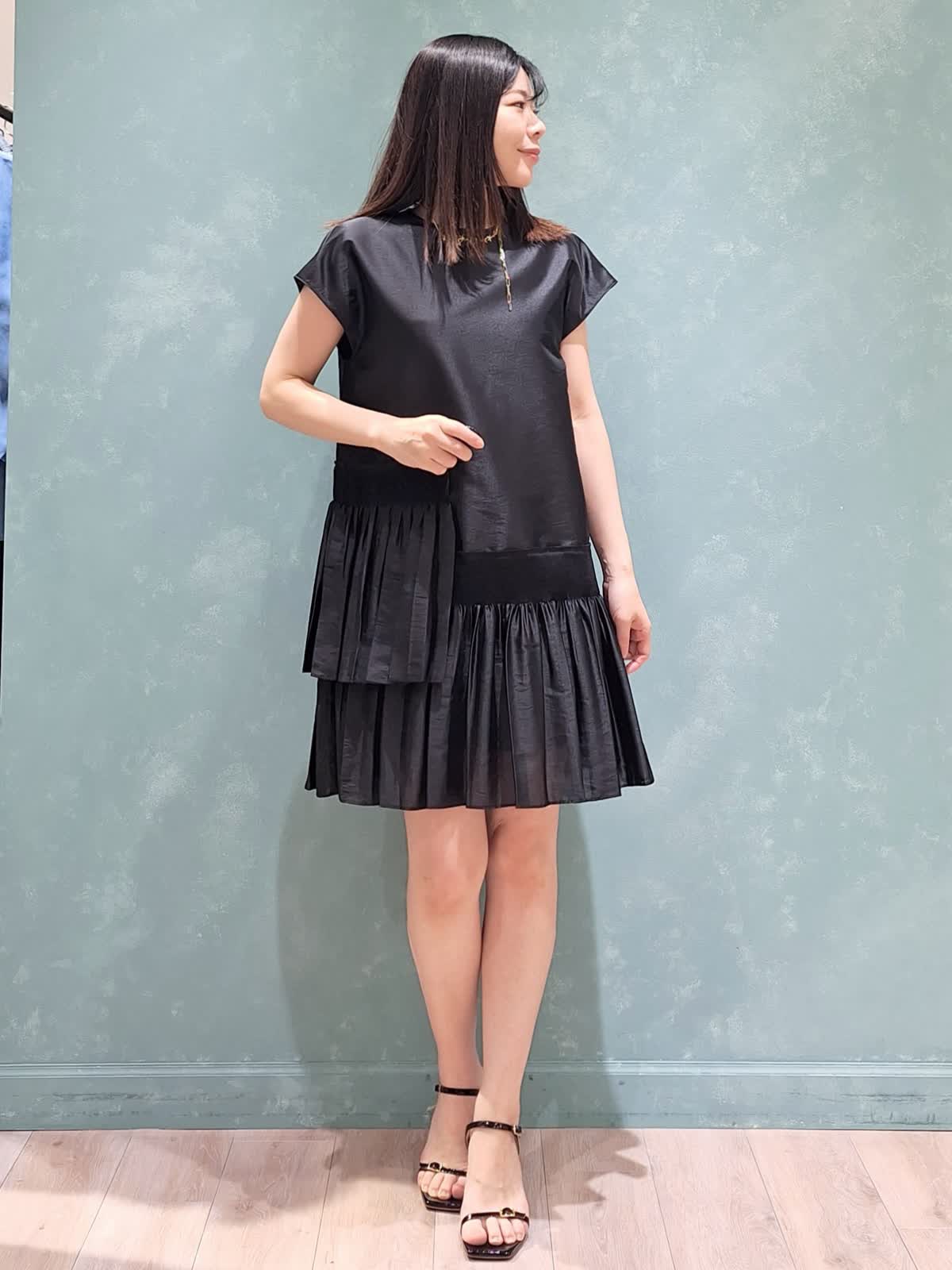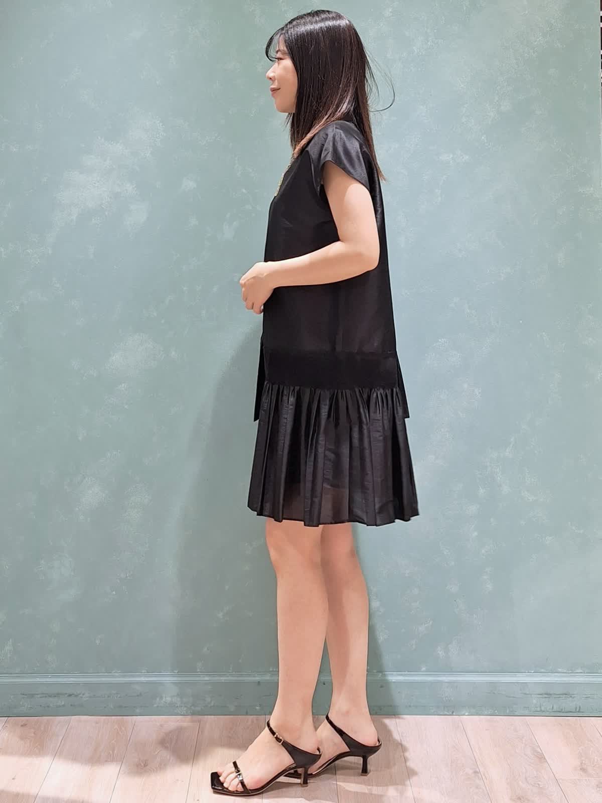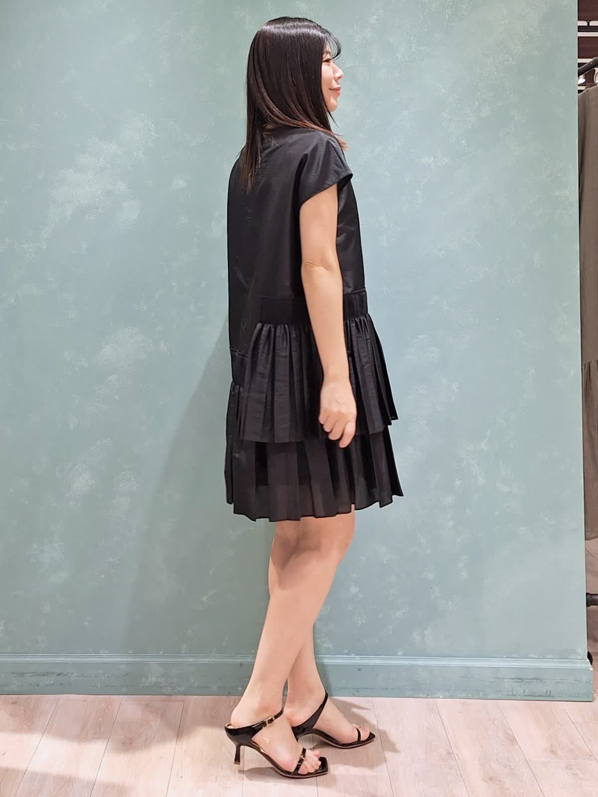 【着用サイズ、カラー】ワンピース7号、ブラック ラヴェイユのミニ丈ワンピース。ハリのある生地感でシルエットが決まります。アシンメトリーなシャーリングプリーツがおしゃれ♪ワンピースで着ても良し、パンツ合わせでチュニックで着ても良し、秋はレザー、ツィードジャケット合わせもお勧め!ロングシーズン活躍するワンピースです。