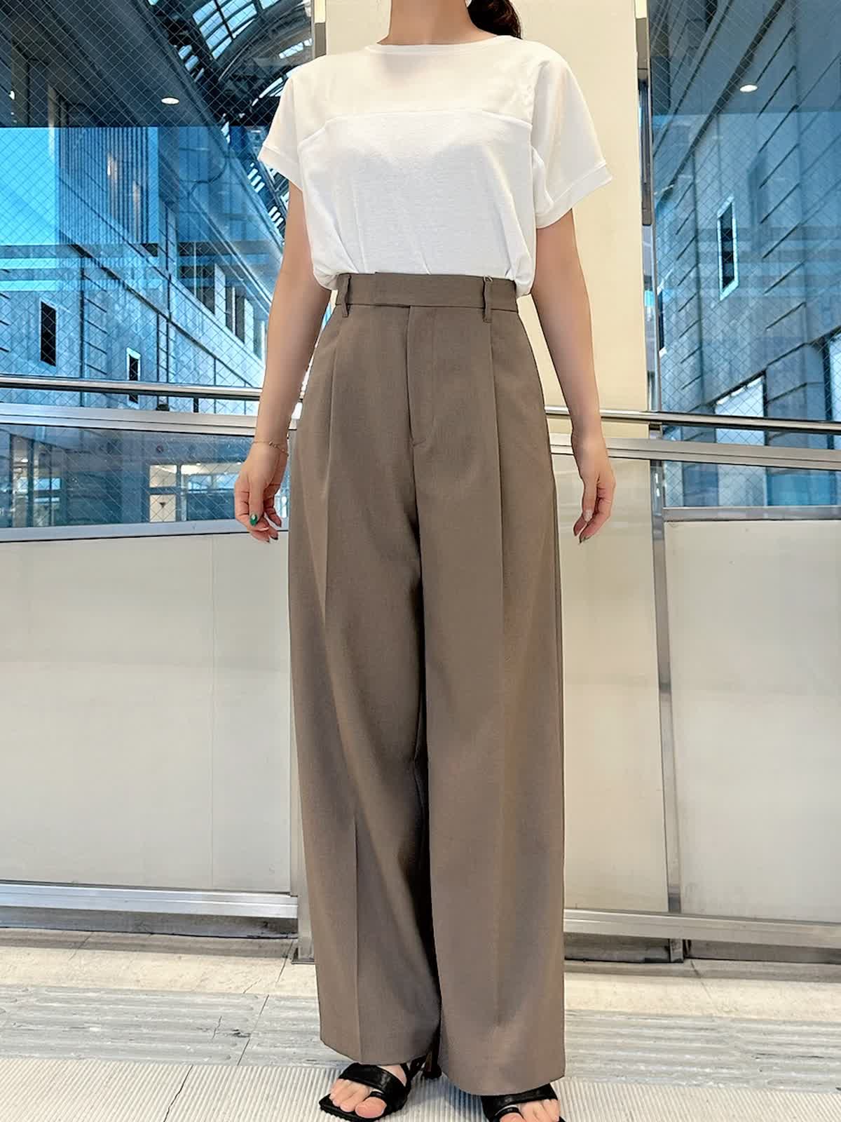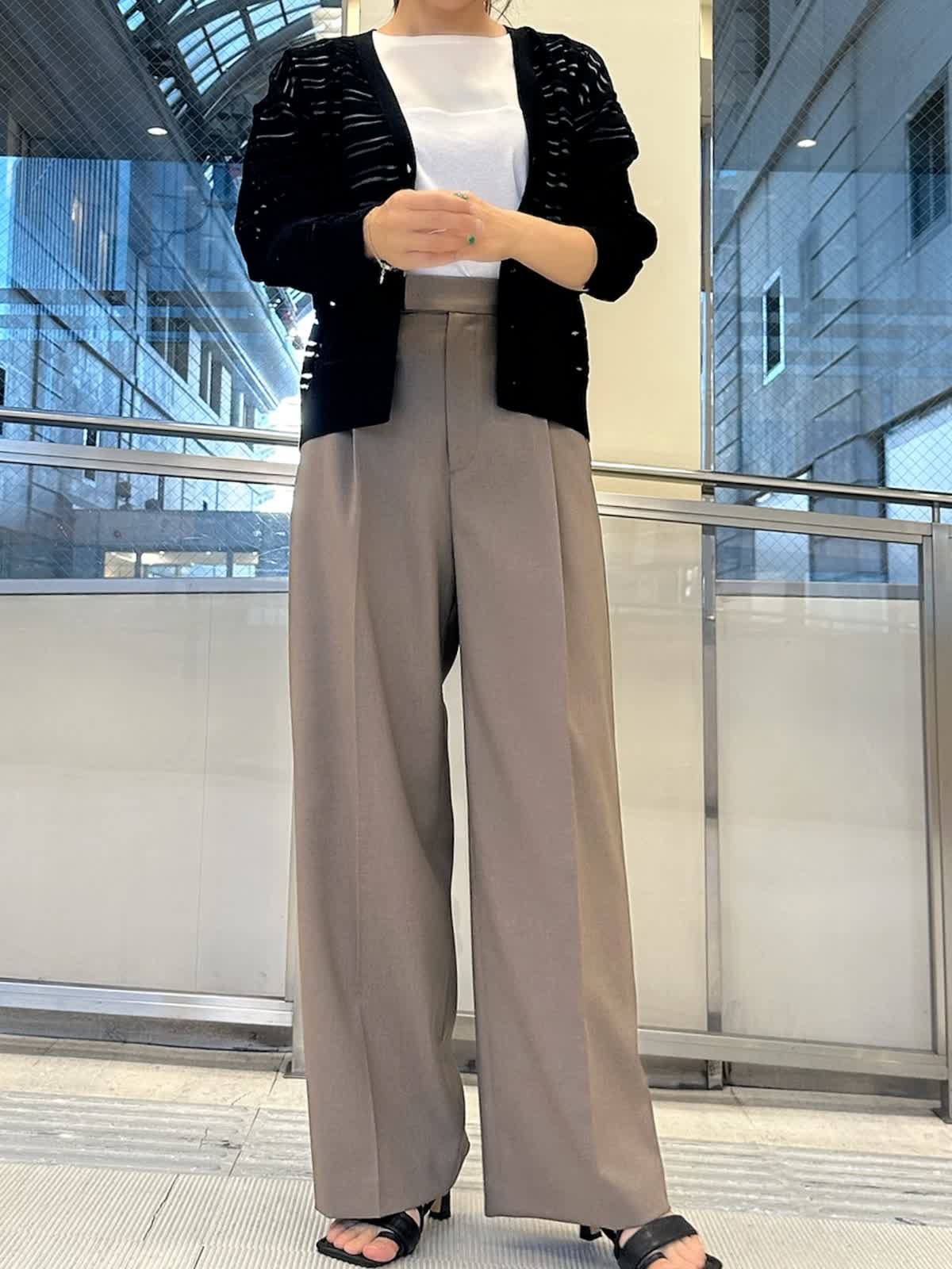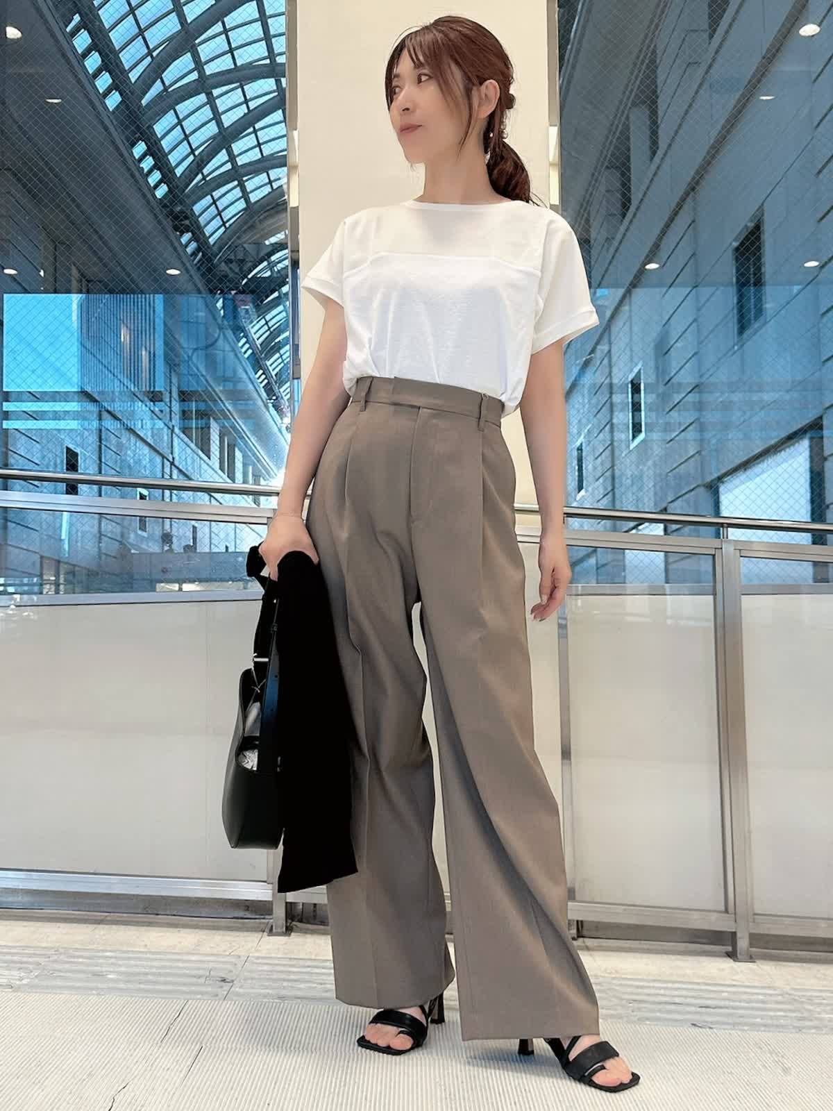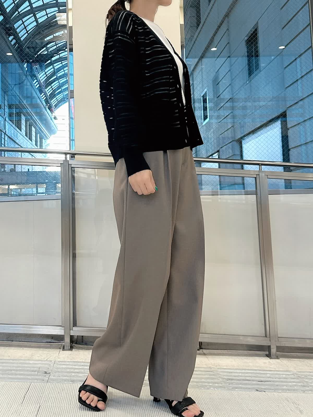 【着用サイズ/カラー】 カットソー:フリー/ホワイト パンツ:9号/モカチャ カーディガン:フリー/ブラック 白Tシャツ&モカチャパンツのきれいめシンプルコーデ。オフィスや通勤にも◎ センタープレスのワイドパンツはスタイルアップも叶い、カジュアルなTシャツスタイルもきれいめに。ウエストの後ろはゴム仕様なので、通勤時や長時間の移動でもストレスフリーなはき心地です。 今から秋まで活躍します。