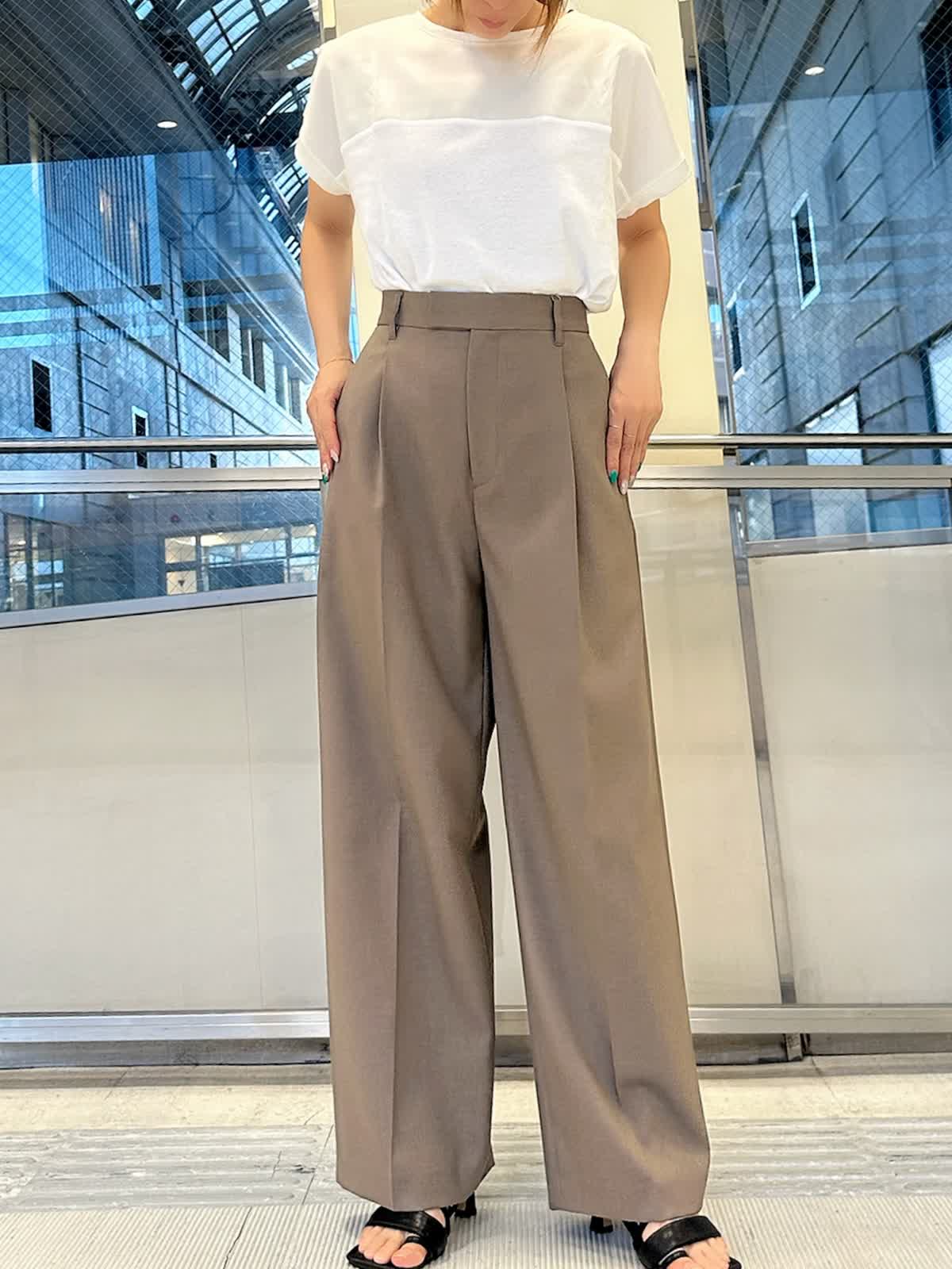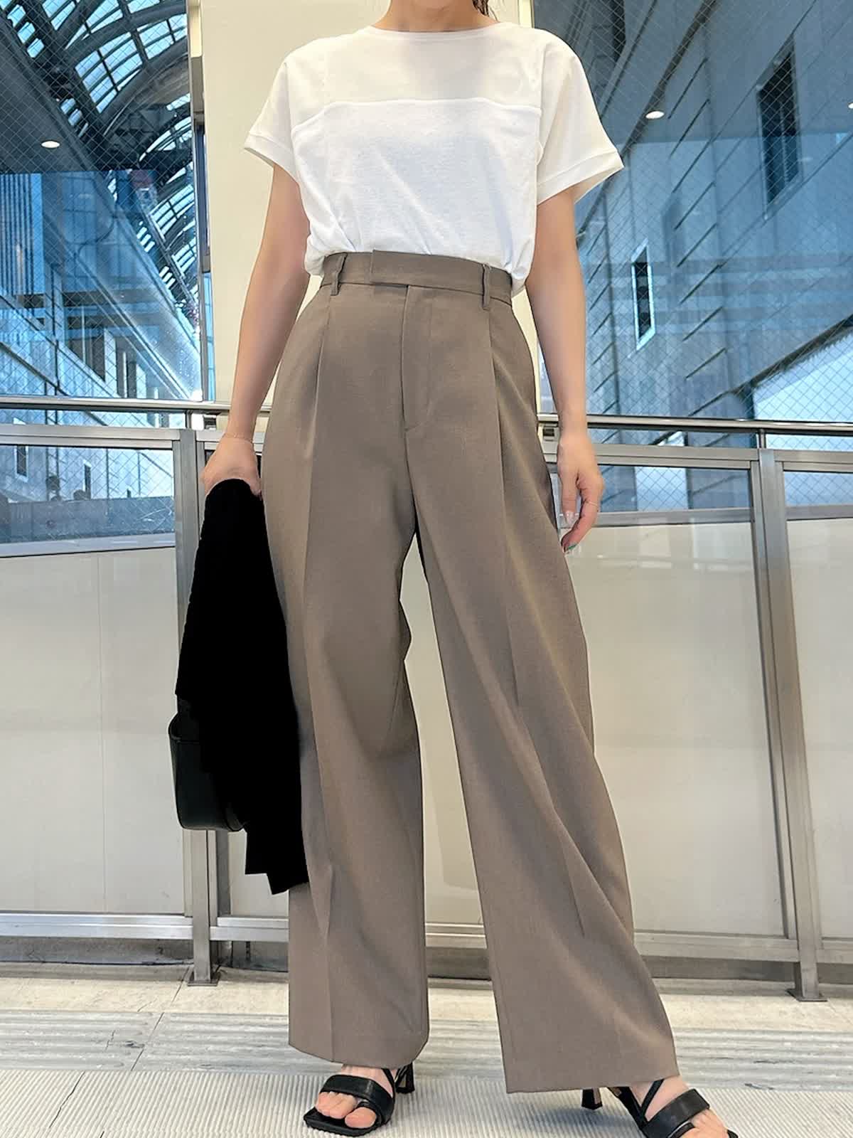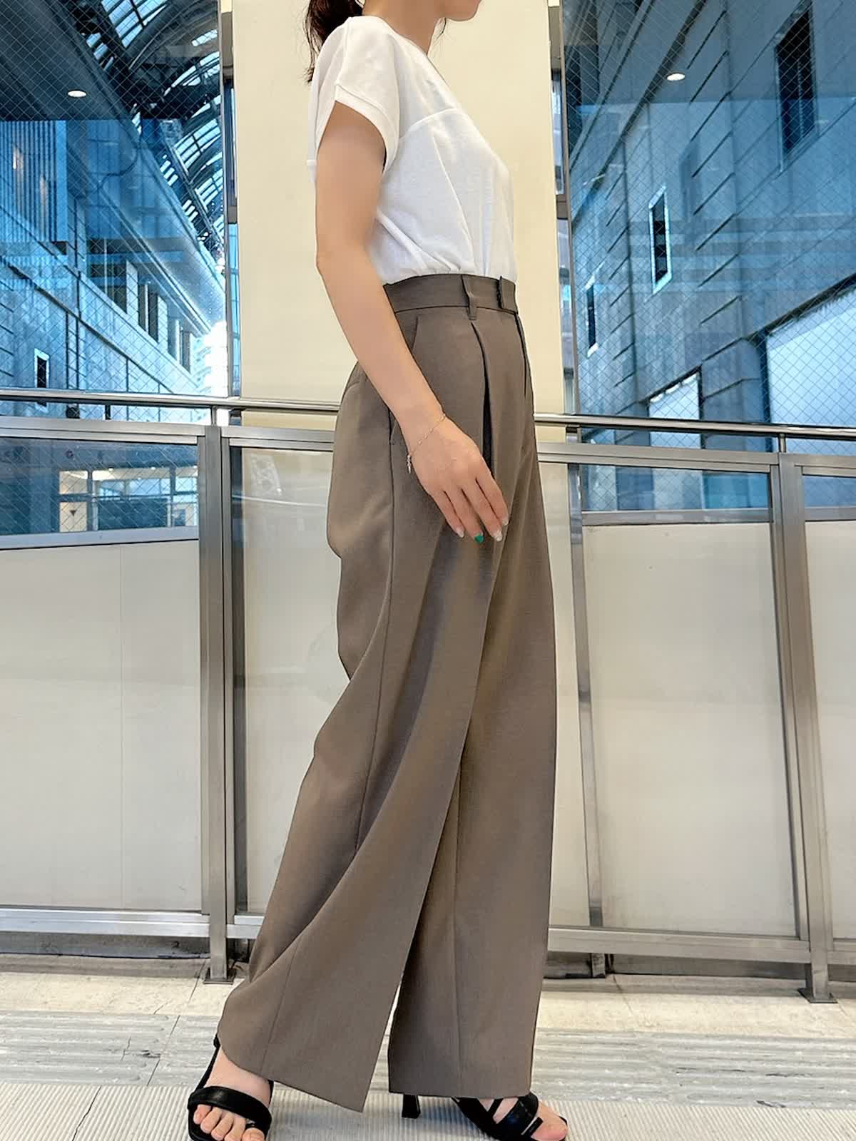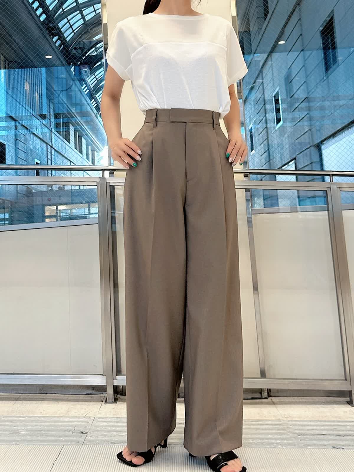 【着用サイズ/カラー】 カットソー:フリー/ホワイト パンツ:9号/モカチャ カーディガン:フリー/ブラック 白Tシャツ&モカチャパンツのきれいめシンプルコーデ。オフィスや通勤にも◎ センタープレスのワイドパンツはスタイルアップも叶い、カジュアルなTシャツスタイルもきれいめに。ウエストの後ろはゴム仕様なので、通勤時や長時間の移動でもストレスフリーなはき心地です。 今から秋まで活躍します。