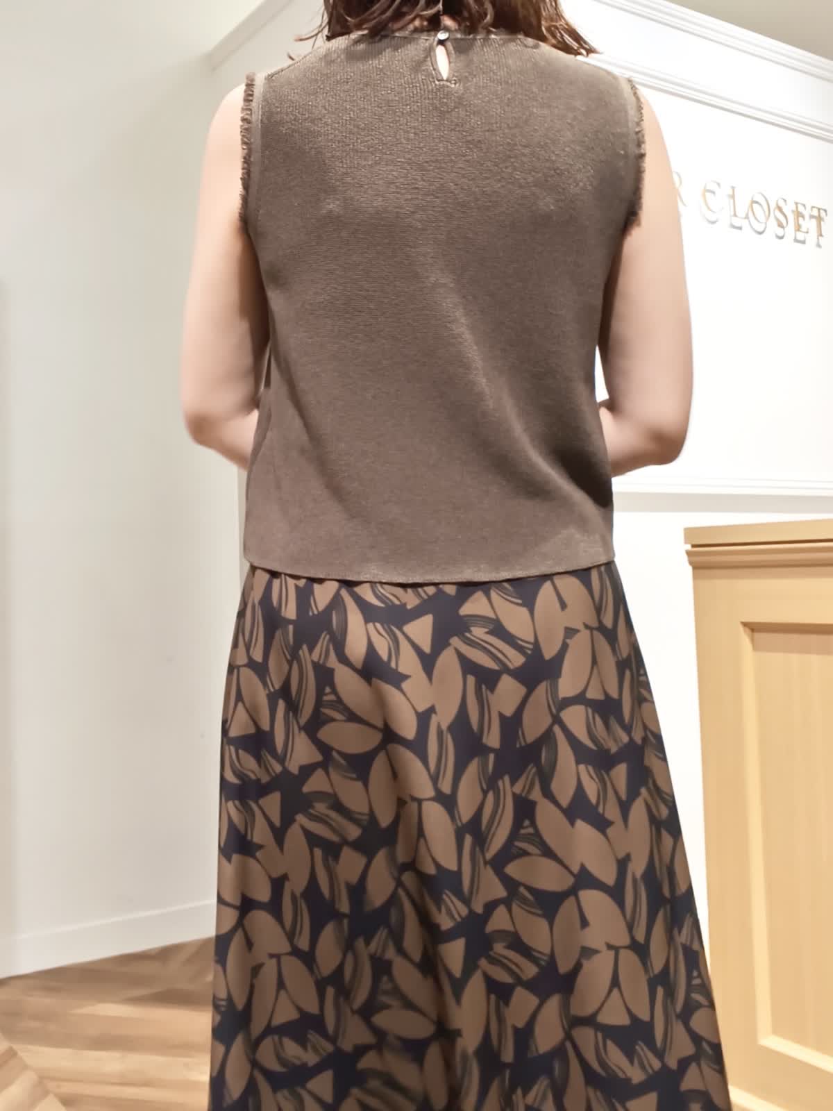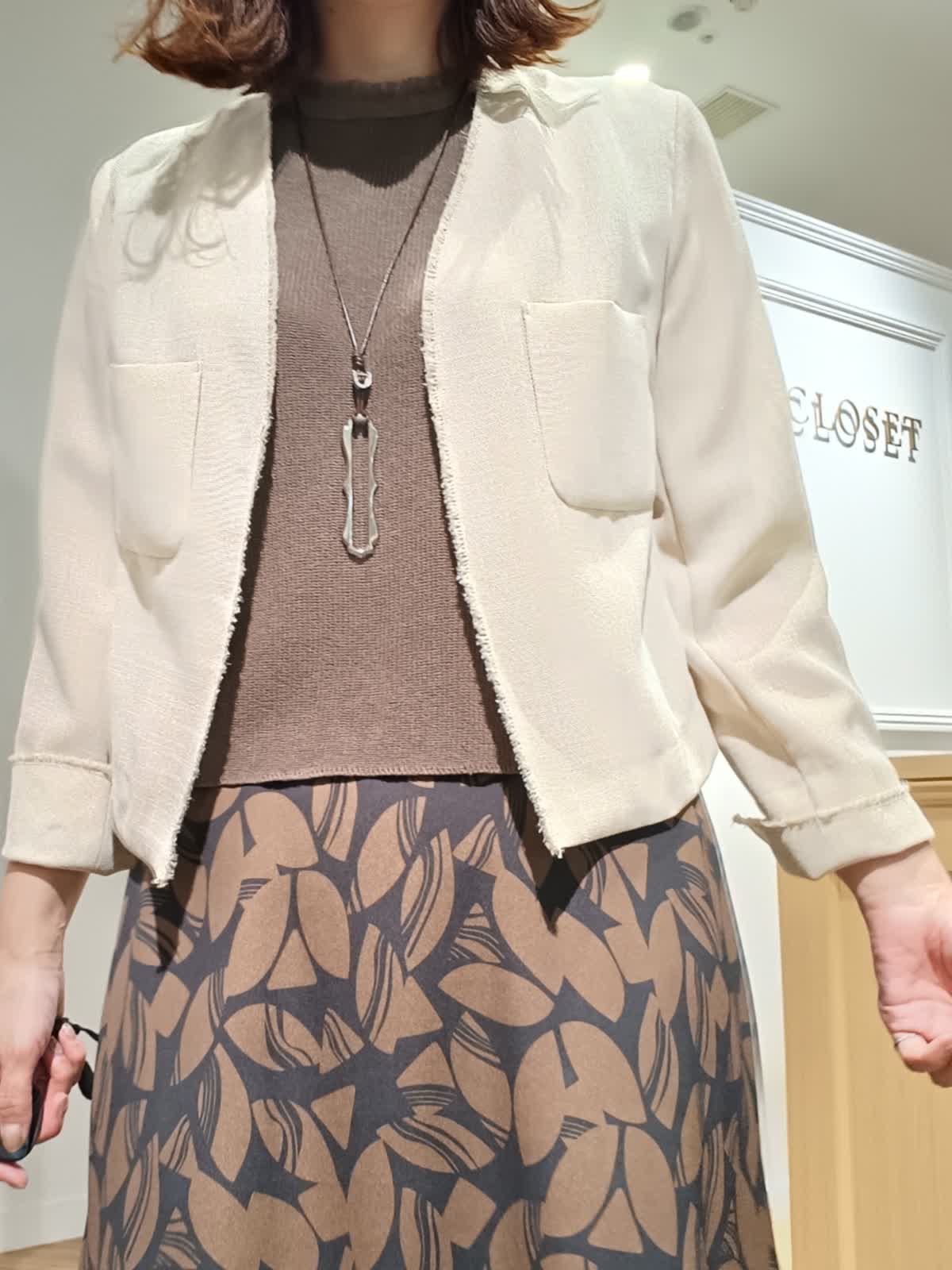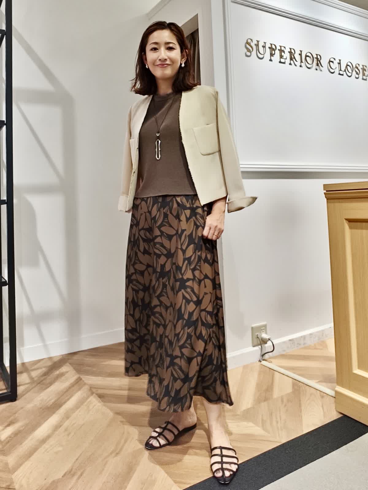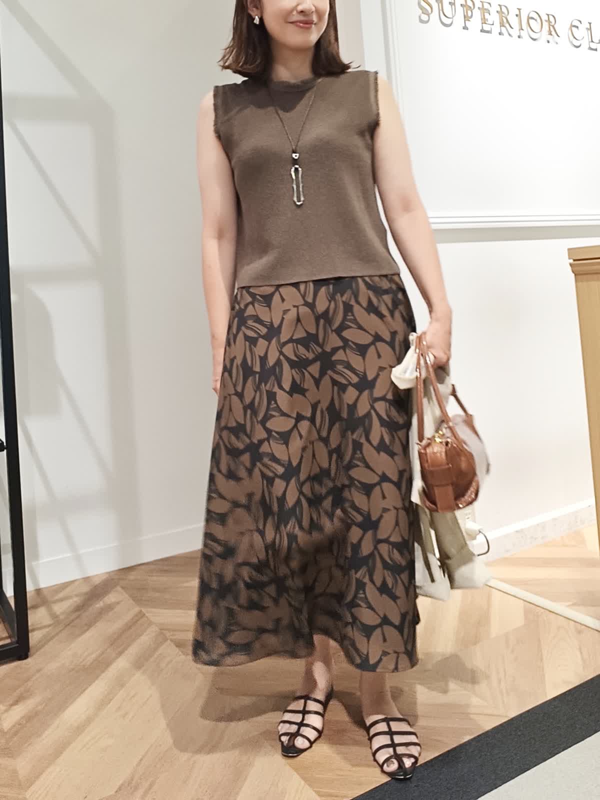 【着用サイズ:カラー】ニット:9号:カーキ スカート:9号:カーキ ジャケット:11号:ベージュ 暑いけど少し晩夏も意識したくなるので、カーキのワントーンコーディネートにしてみました。フリンジデザインのニットはドライタッチな素材感でカジュアルすぎずキレイめすぎずの仕上がりに。幾何学プリントのスカートもシワを気にせずに着られるのでこれから長いシーズン使えます。ウエストもサイドがゴム仕様で楽に着られます。