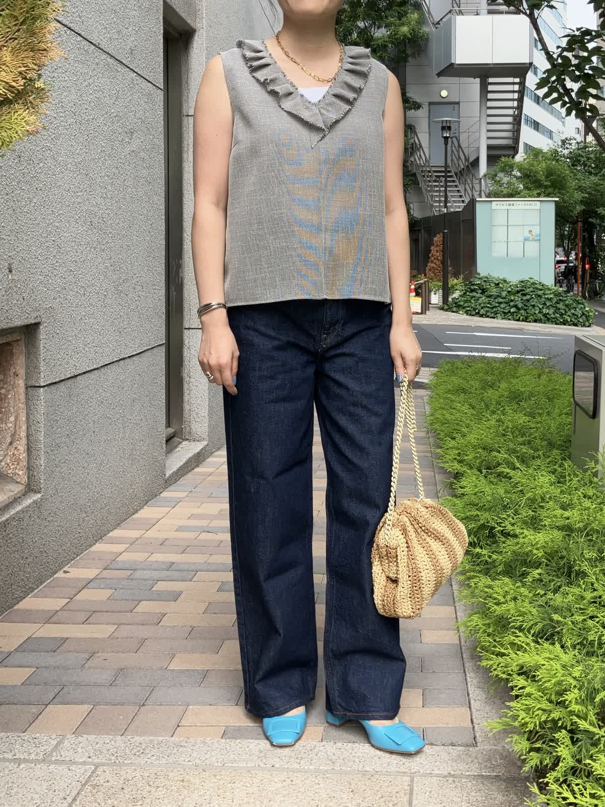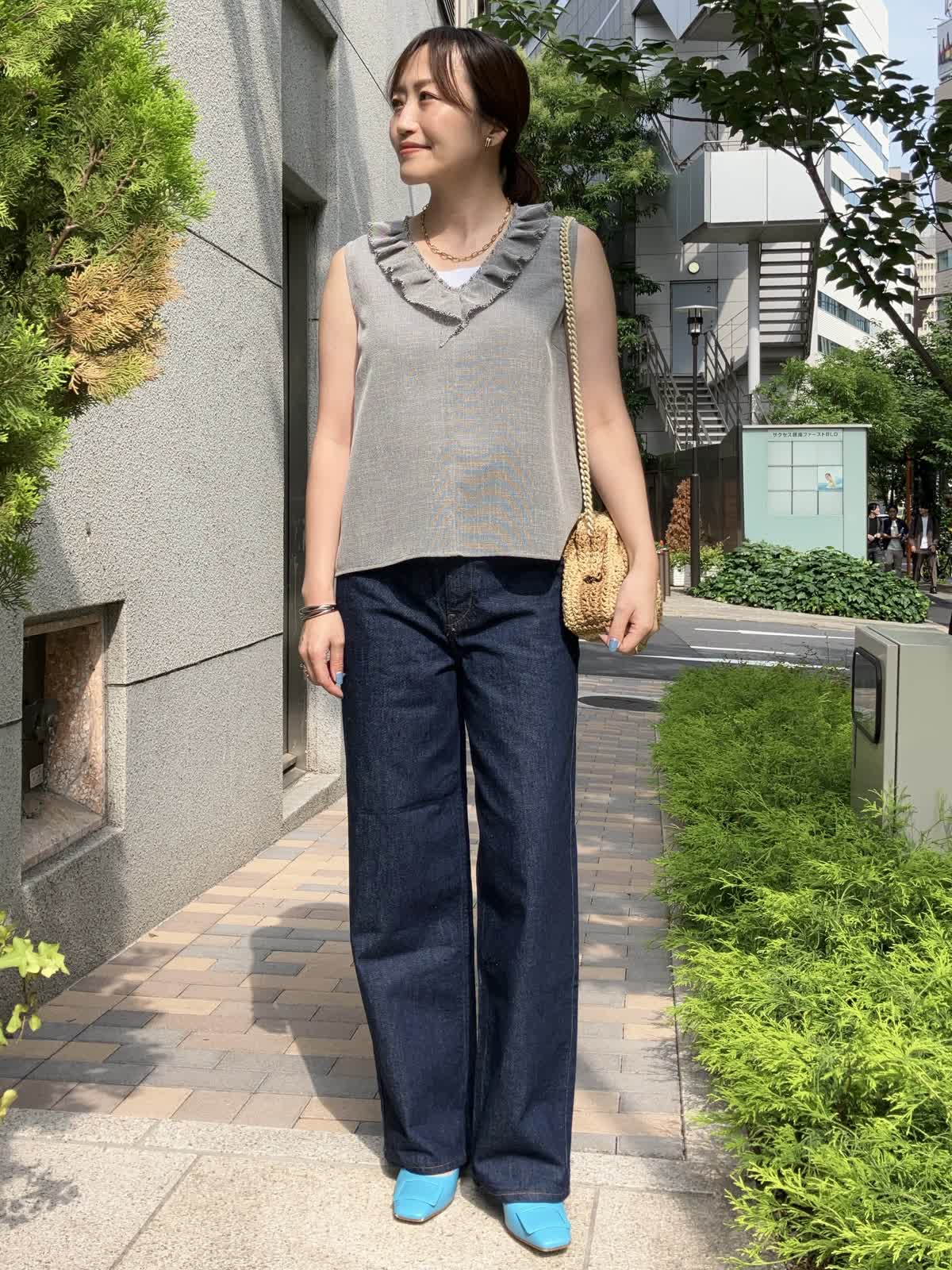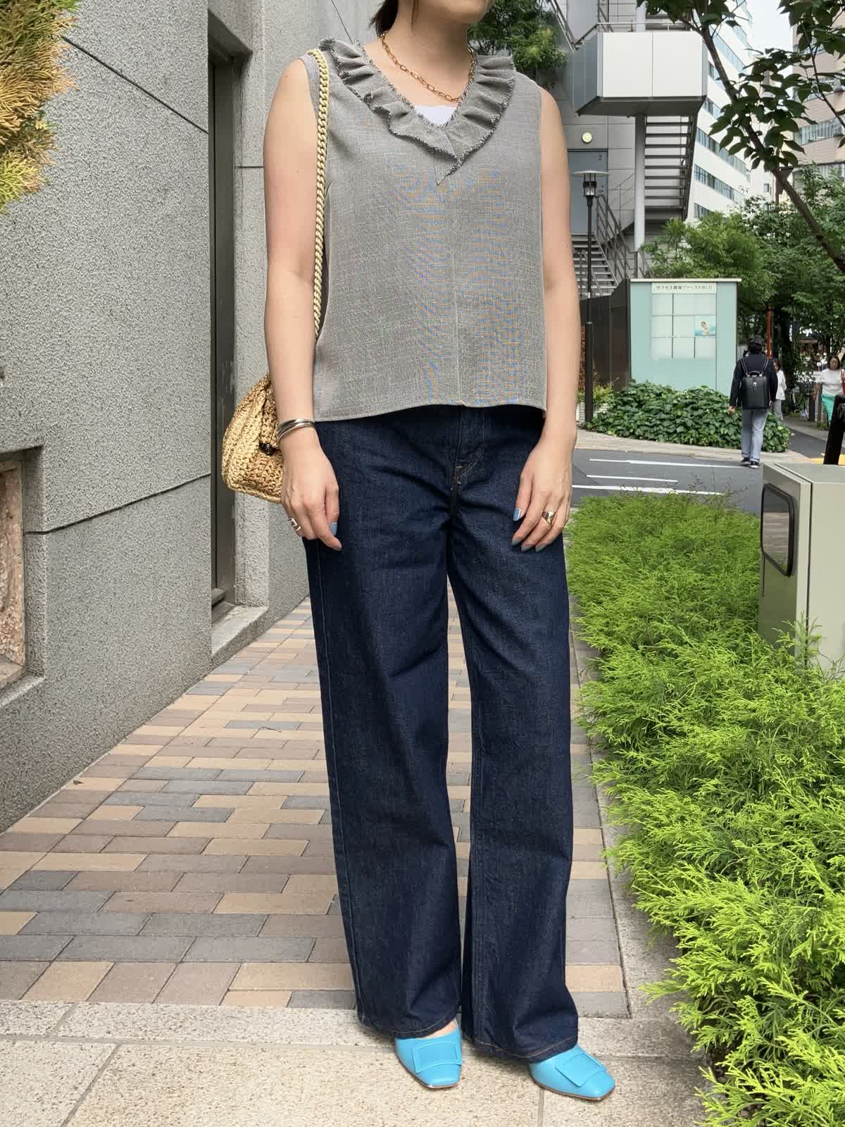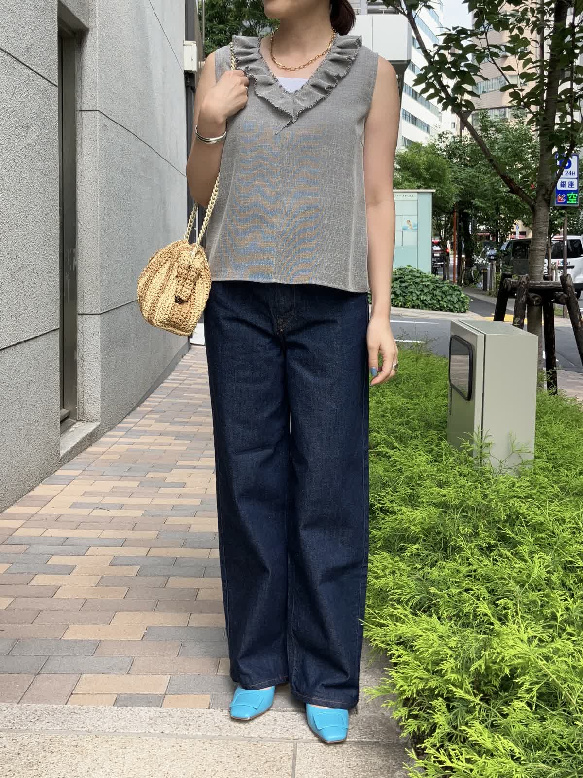 【着用サイズ】全て9号【着用カラー】ブラウス:グレー カットソー:ホワイト パンツ:インディゴ 夏のおでかけの日におすすめのデニムコーデ。フリルブラウスはデニムに合わせることで甘さを抑え、デイリーに着ていただけます。タックアウトしたままでOKなのでコーディネートもラクラク。足元はサンダルやスニーカーにチェンジしても◎
