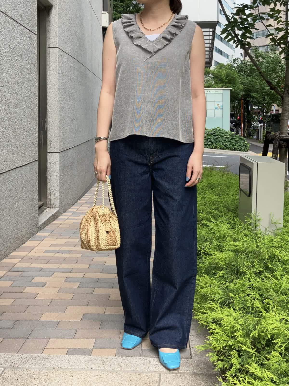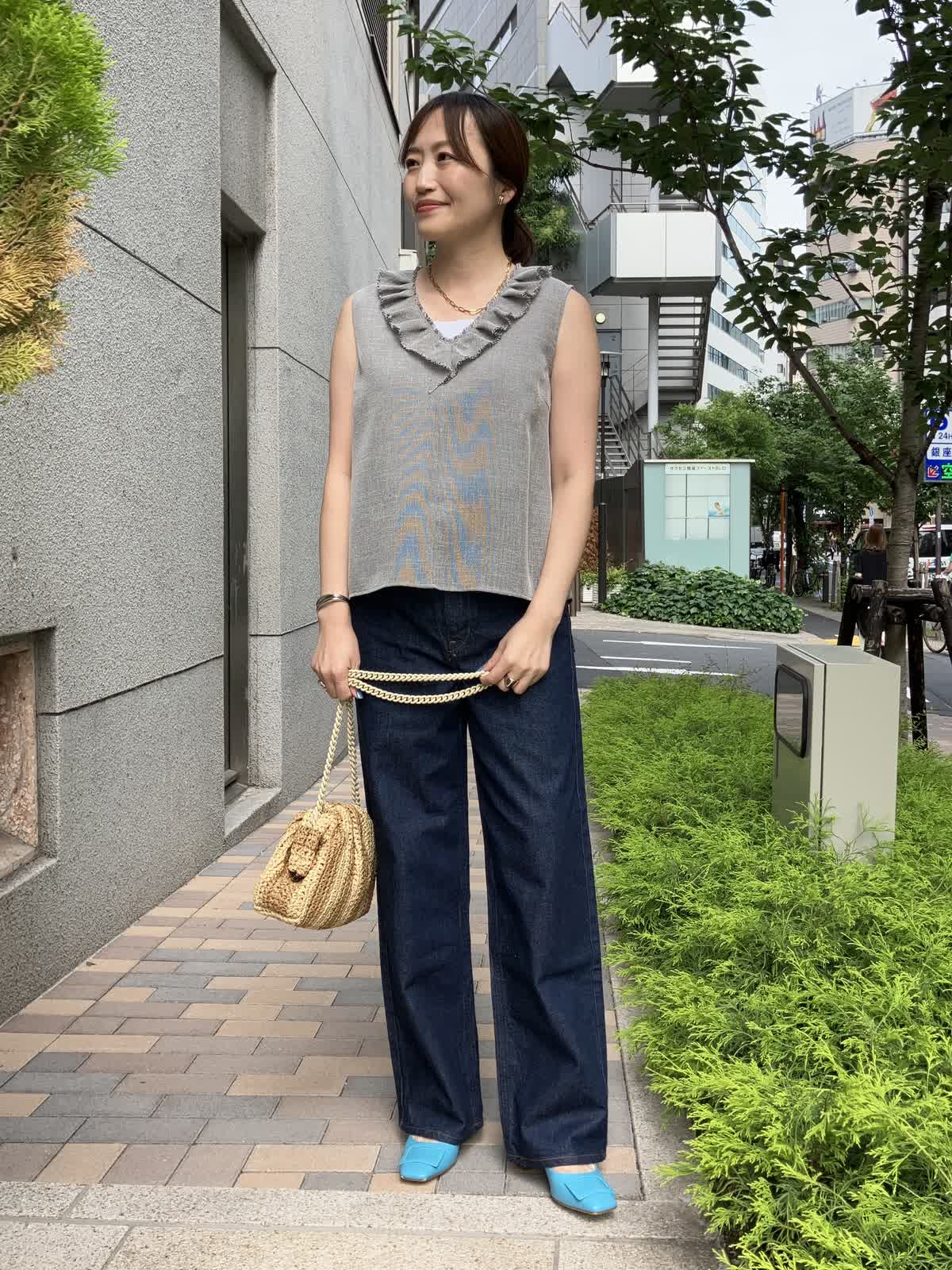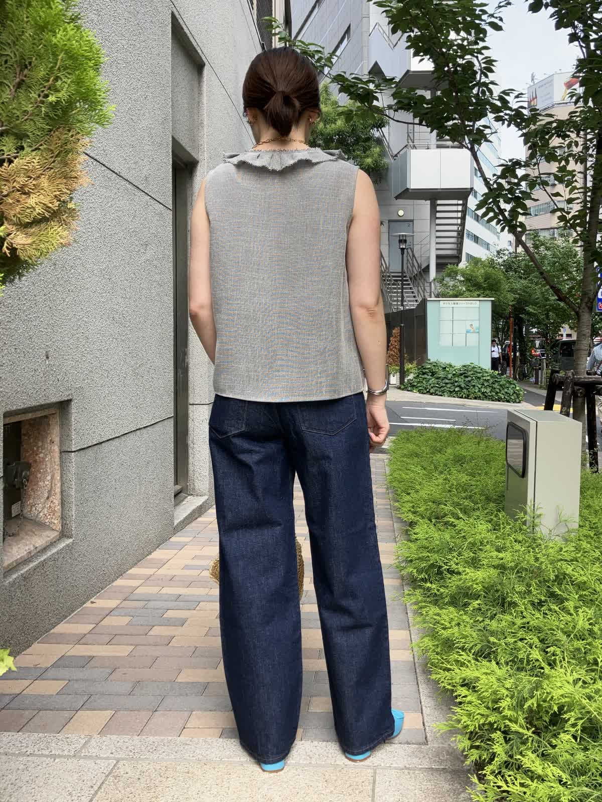【着用サイズ】全て9号【着用カラー】ブラウス:グレー カットソー:ホワイト パンツ:インディゴ 夏のおでかけの日におすすめのデニムコーデ。フリルブラウスはデニムに合わせることで甘さを抑え、デイリーに着ていただけます。タックアウトしたままでOKなのでコーディネートもラクラク。足元はサンダルやスニーカーにチェンジしても◎