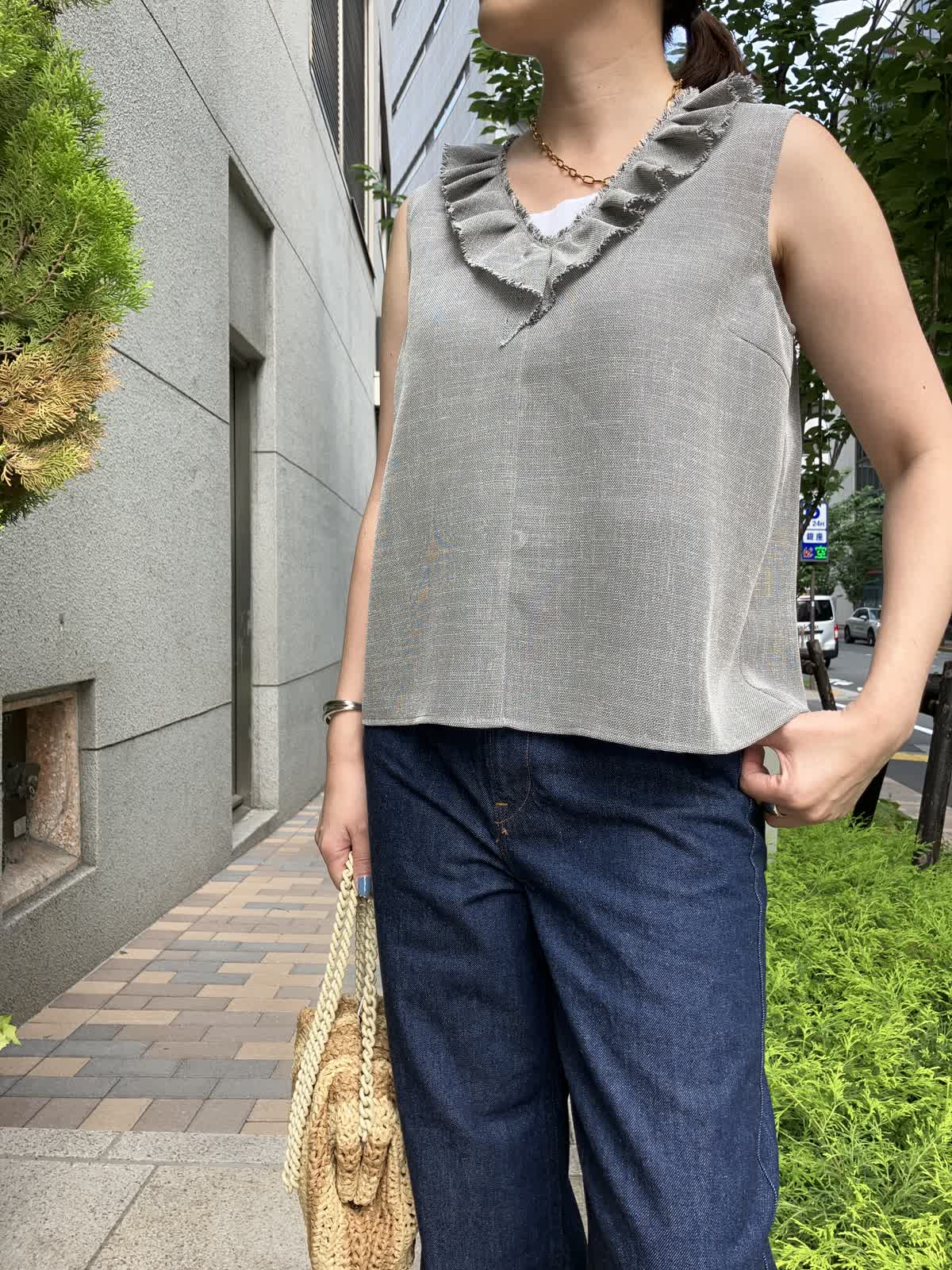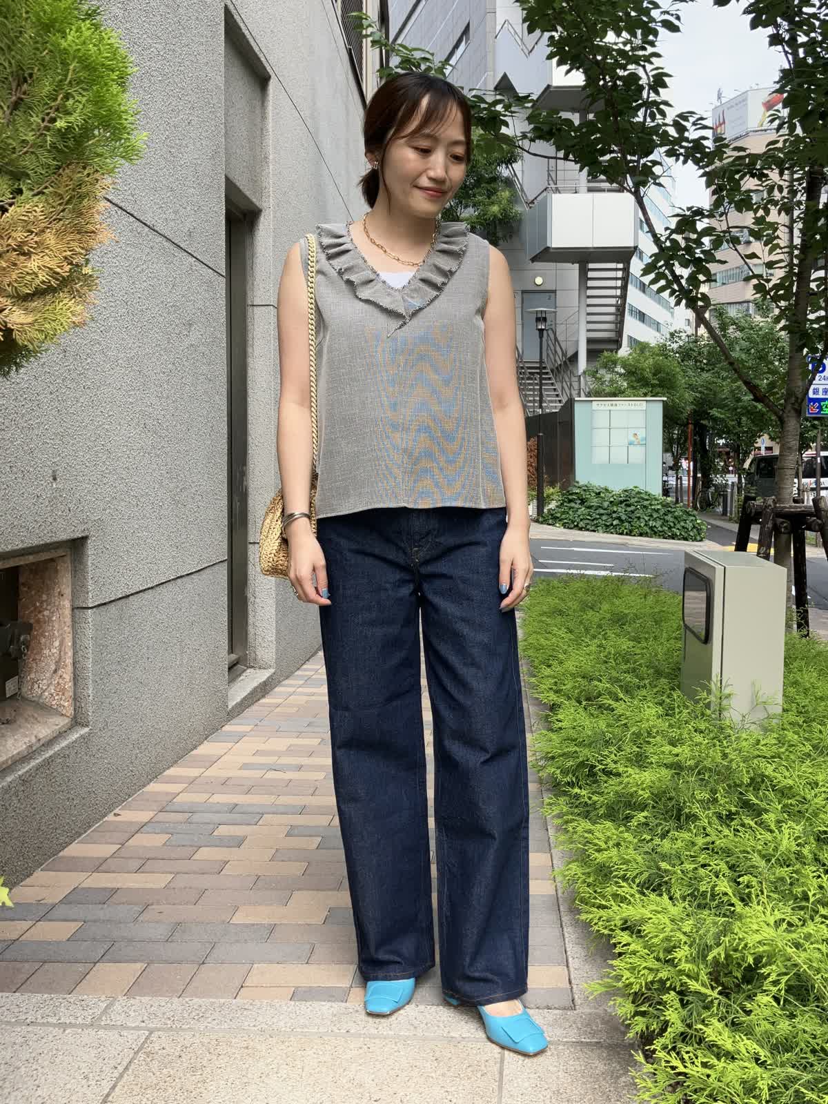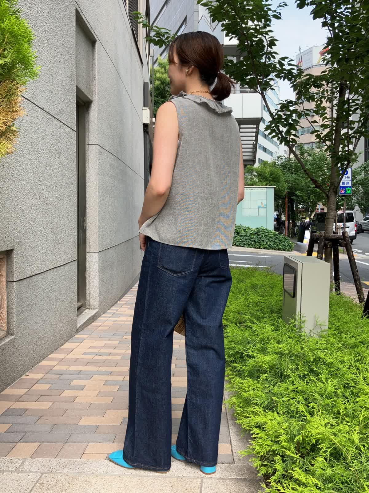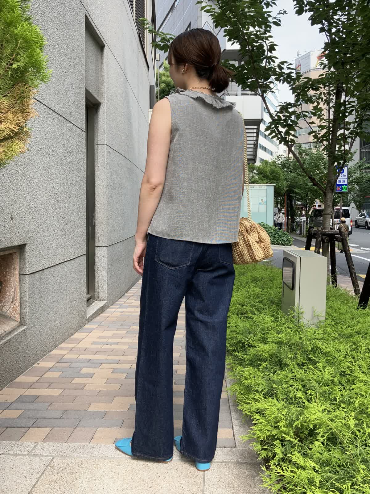 【着用サイズ】全て9号【着用カラー】ブラウス:グレー カットソー:ホワイト パンツ:インディゴ 夏のおでかけの日におすすめのデニムコーデ。フリルブラウスはデニムに合わせることで甘さを抑え、デイリーに着ていただけます。タックアウトしたままでOKなのでコーディネートもラクラク。足元はサンダルやスニーカーにチェンジしても◎
