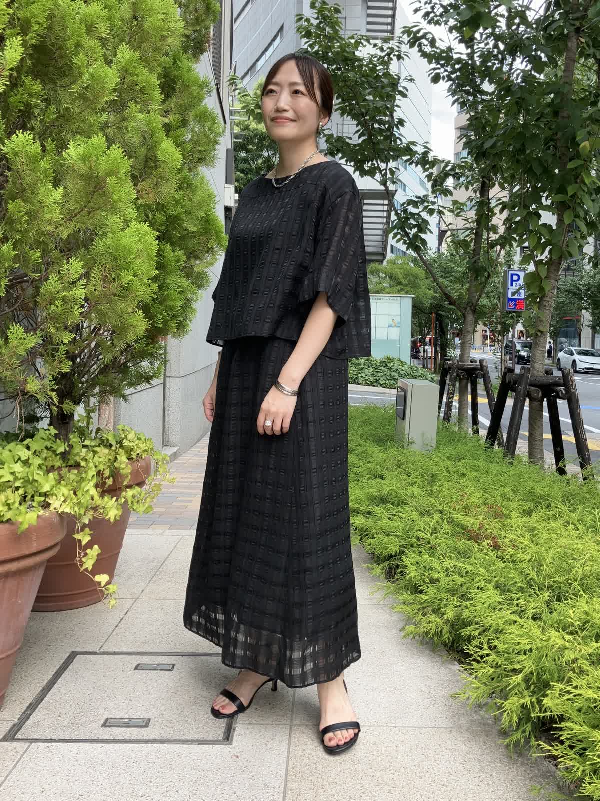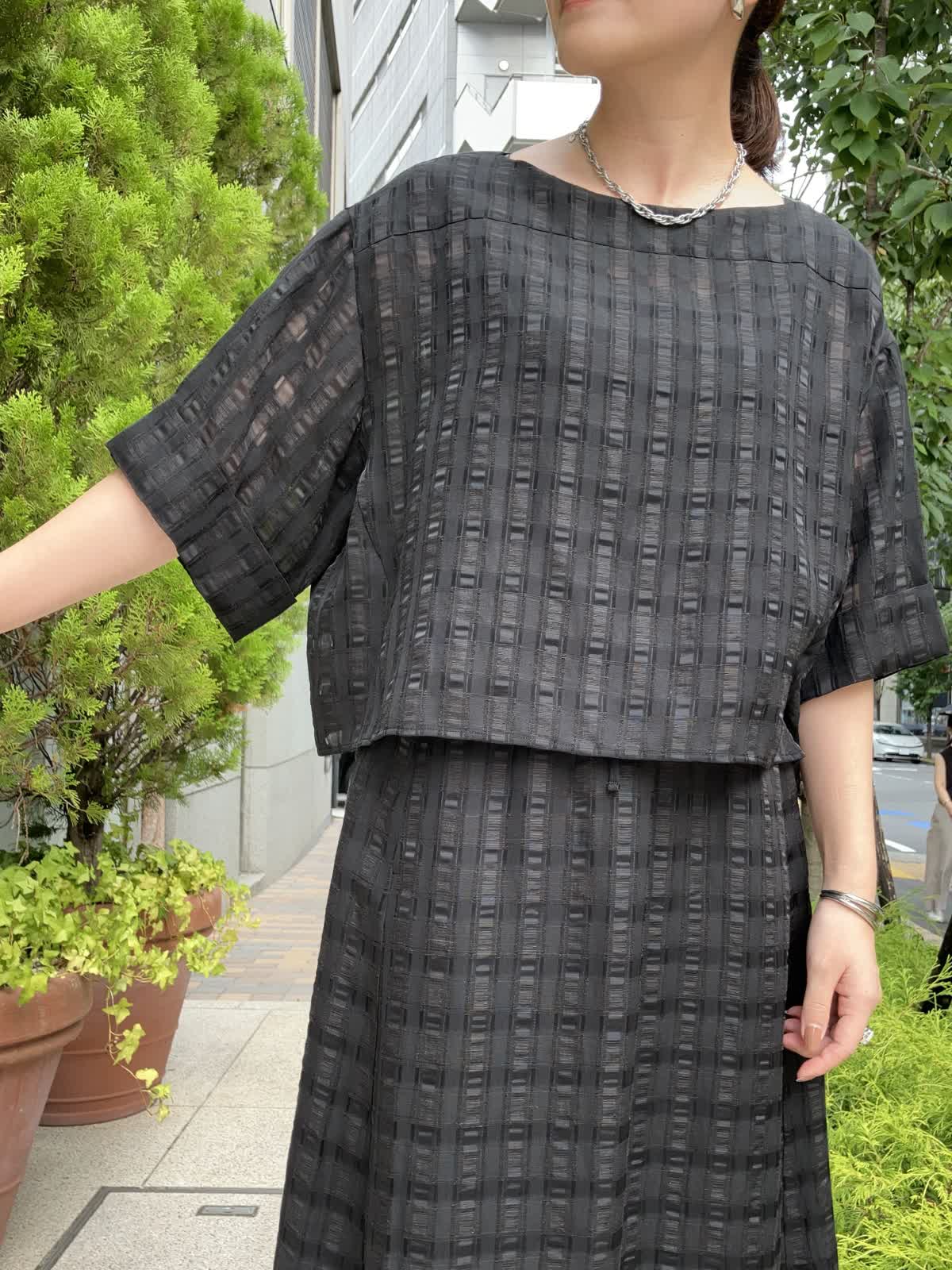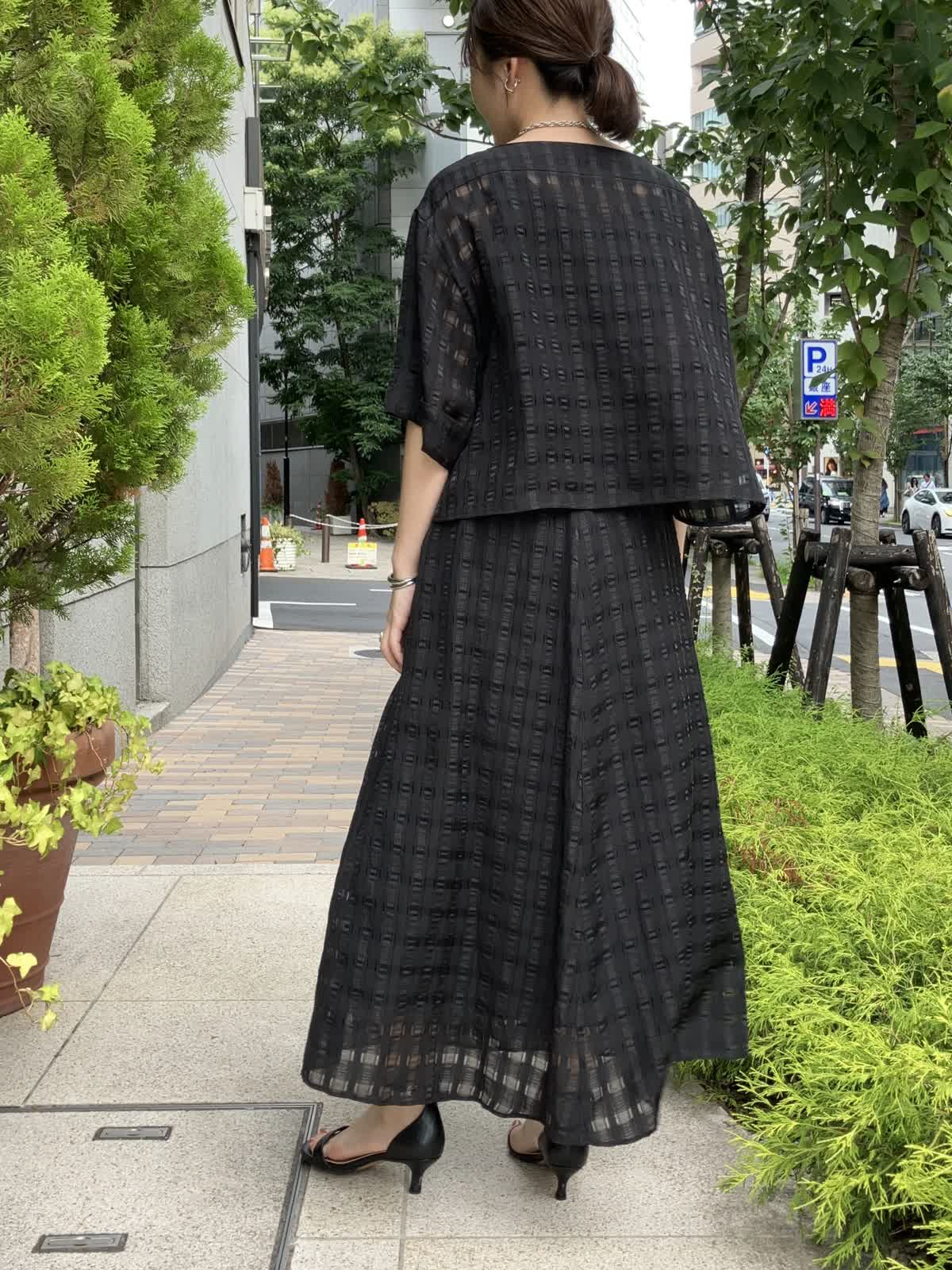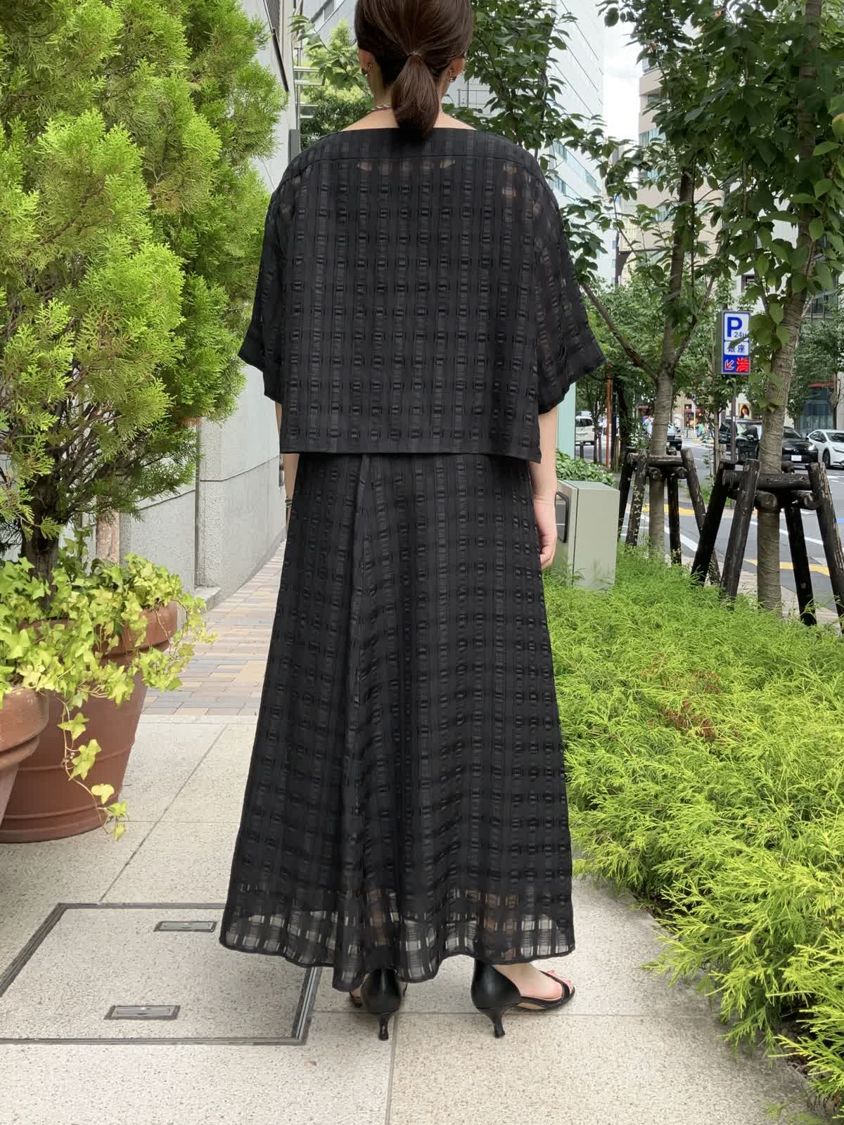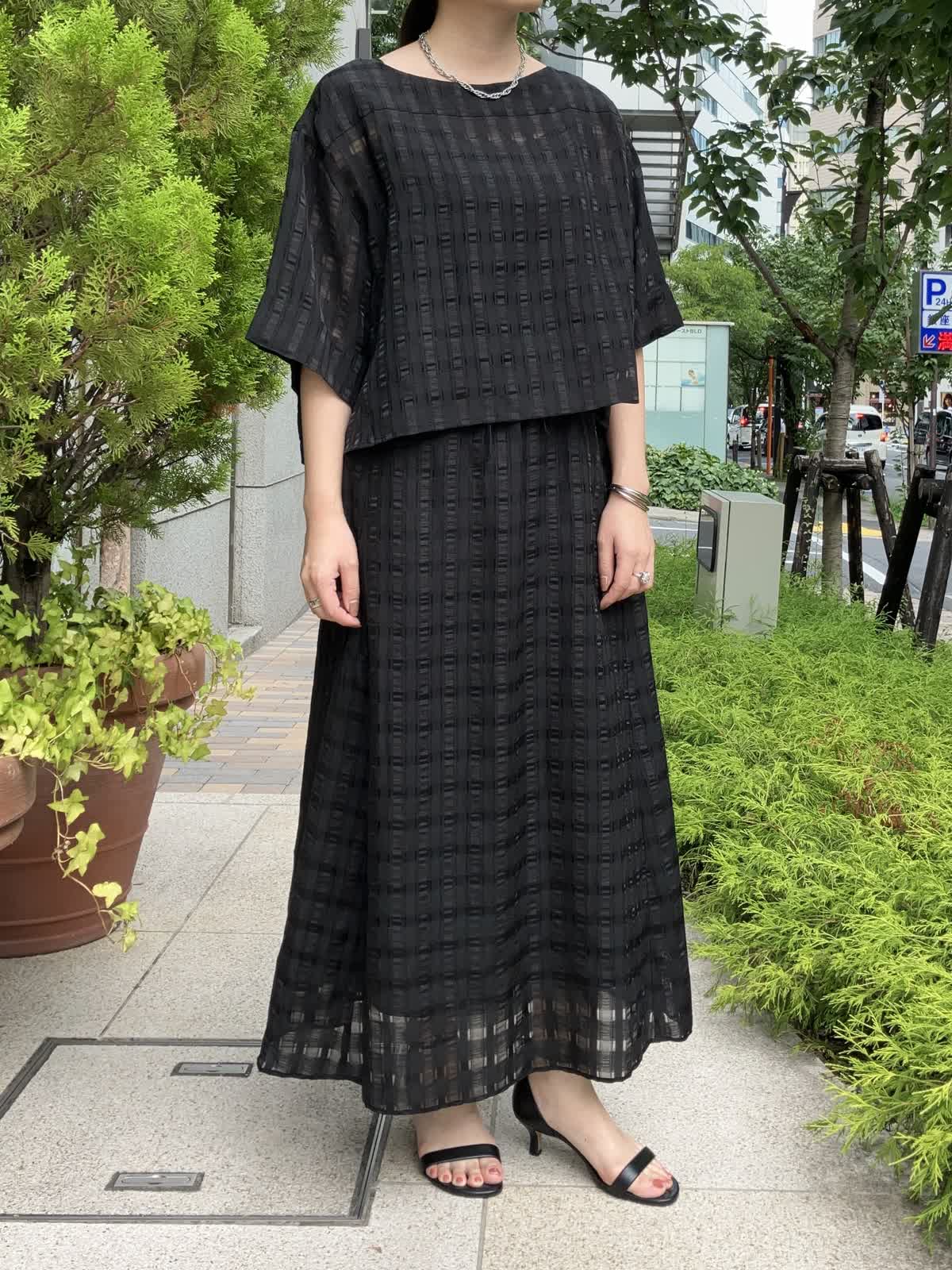 【着用サイズ】全て9号【着用カラー】全てブラック トレンドのシアー素材が魅力のセットアップコーデ。見た目も軽やかで汗染みも気にせずオシャレを楽しめます。チェック柄がアクセントになり、普段使いからお食事シーンまで幅広く着ていただけます。ブラウス、スカート別々に着回し可能な便利なセットアップ。