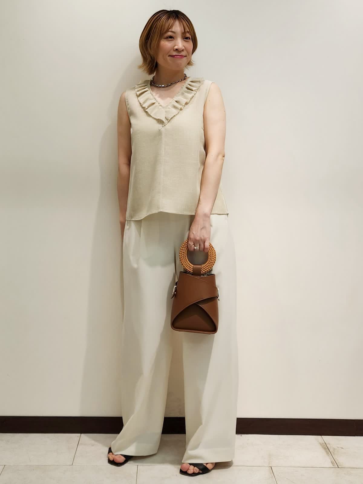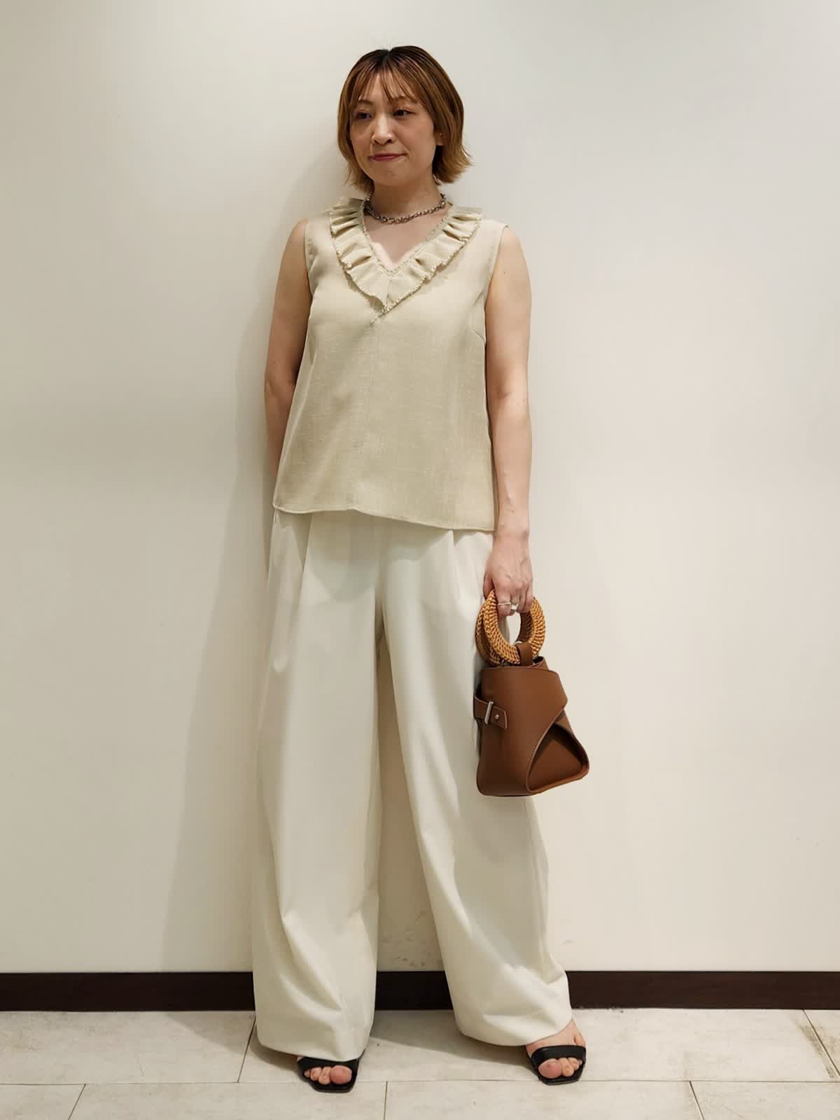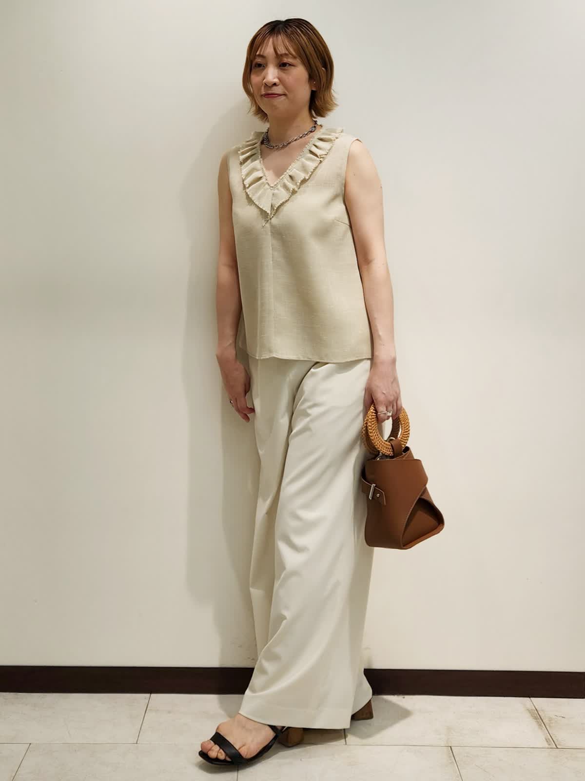 【着用サイズ】すべて9号 【着用カラー】ブラウス:ベージュ パンツ:オフホワイト フリルブラウスで上品おでかけコーディネート。夏の強い味方はフリルブラウスで決まり!!ディテールの細部までこだわったブラウスは軽い着心地もポイント。 ホワイトのパンツで合わせ全体のカラーをまとめました。バックはハンドルが夏らしいL’Avenirのアイテムです!