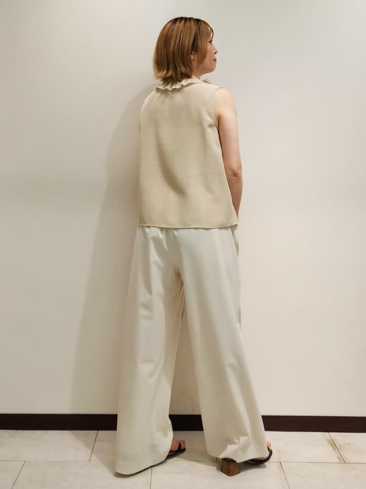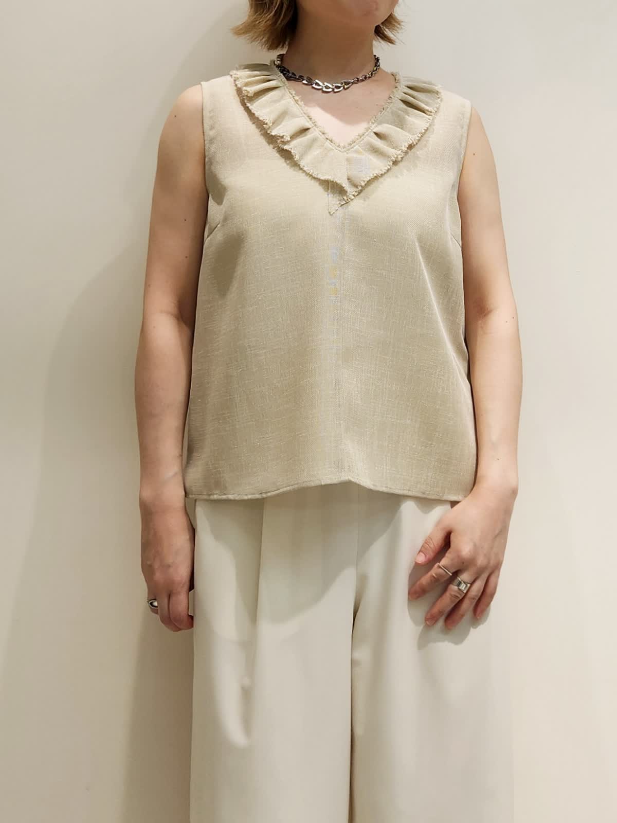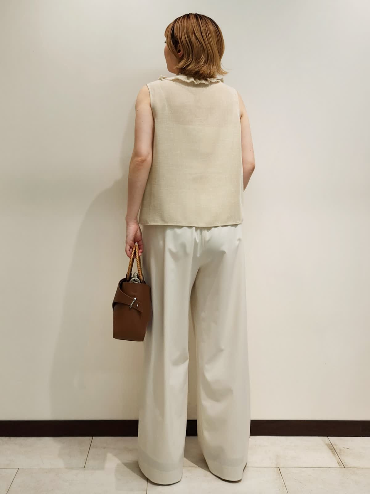【着用サイズ】すべて9号 【着用カラー】ブラウス:ベージュ パンツ:オフホワイト フリルブラウスで上品おでかけコーディネート。夏の強い味方はフリルブラウスで決まり!!ディテールの細部までこだわったブラウスは軽い着心地もポイント。 ホワイトのパンツで合わせ全体のカラーをまとめました。バックはハンドルが夏らしいL’Avenirのアイテムです!