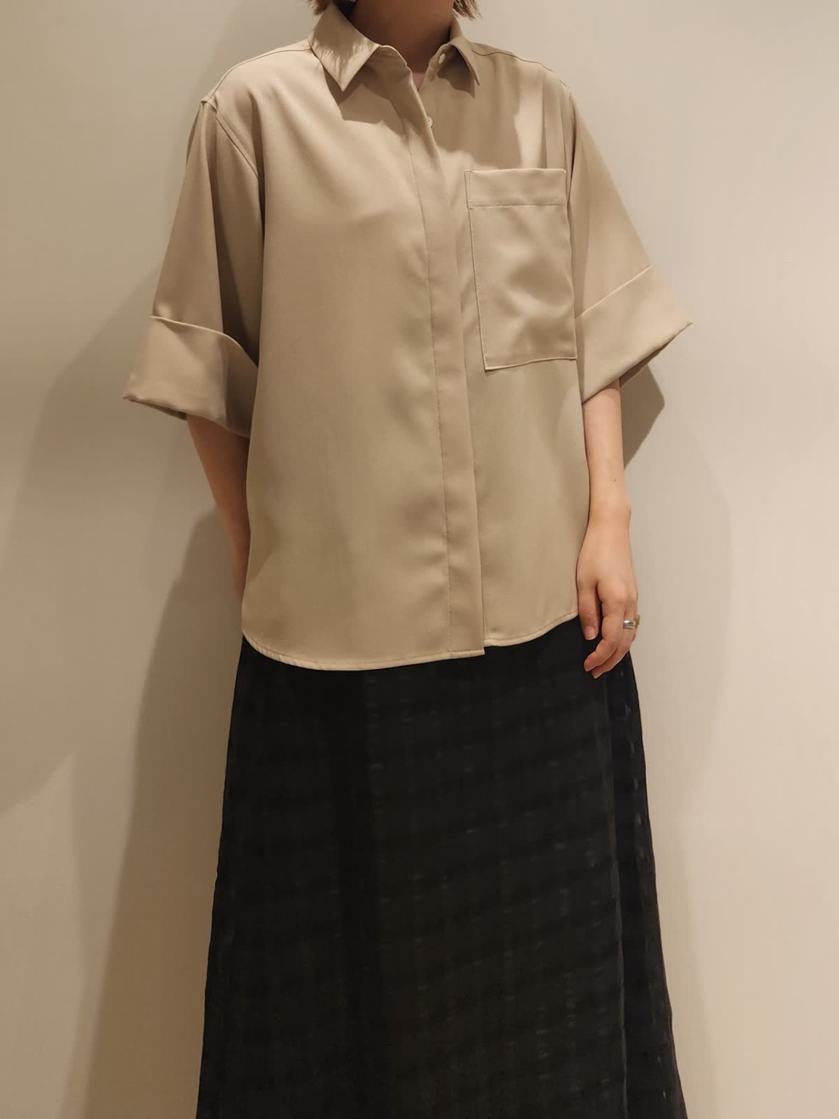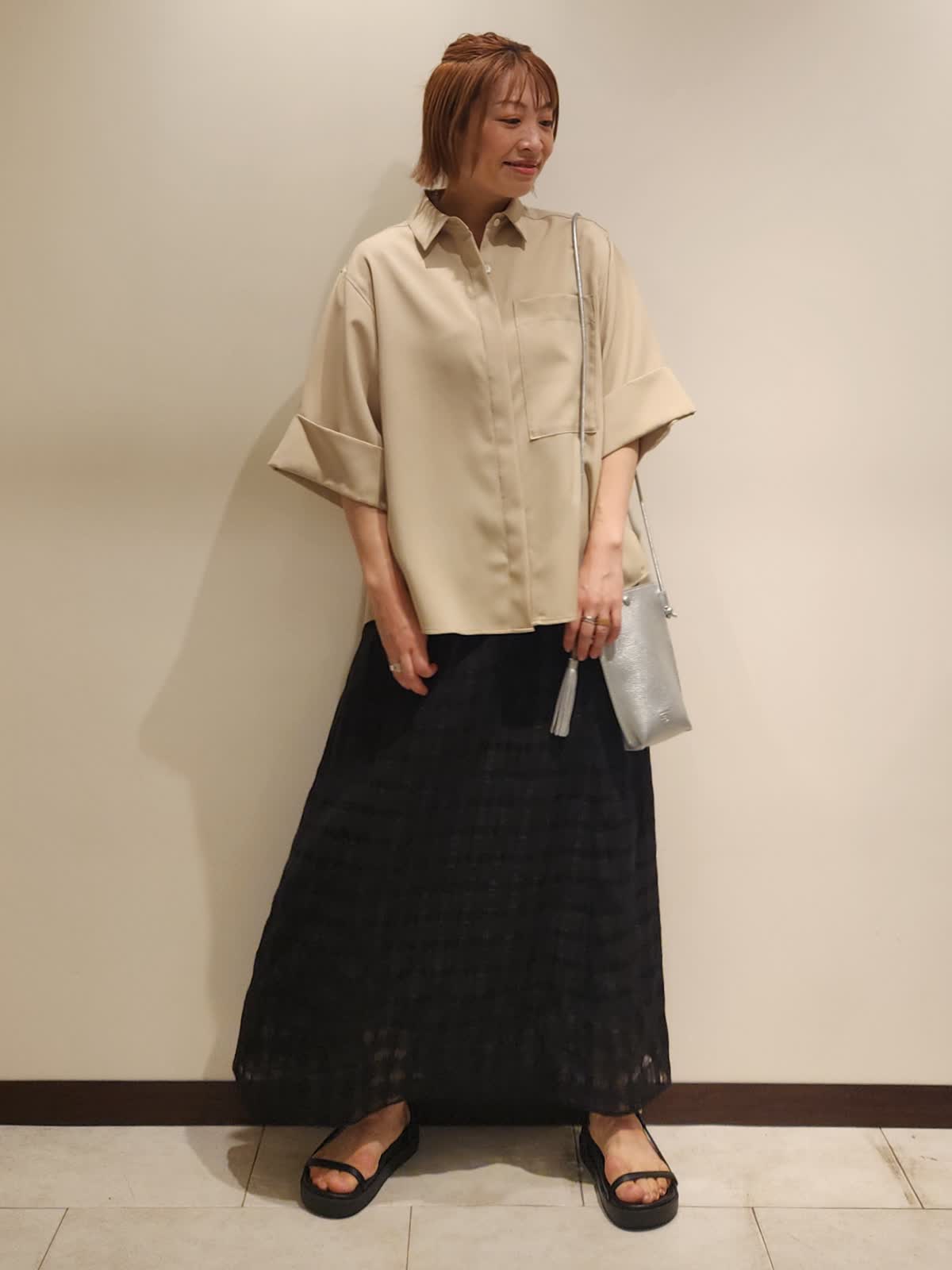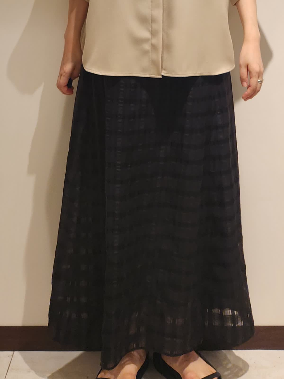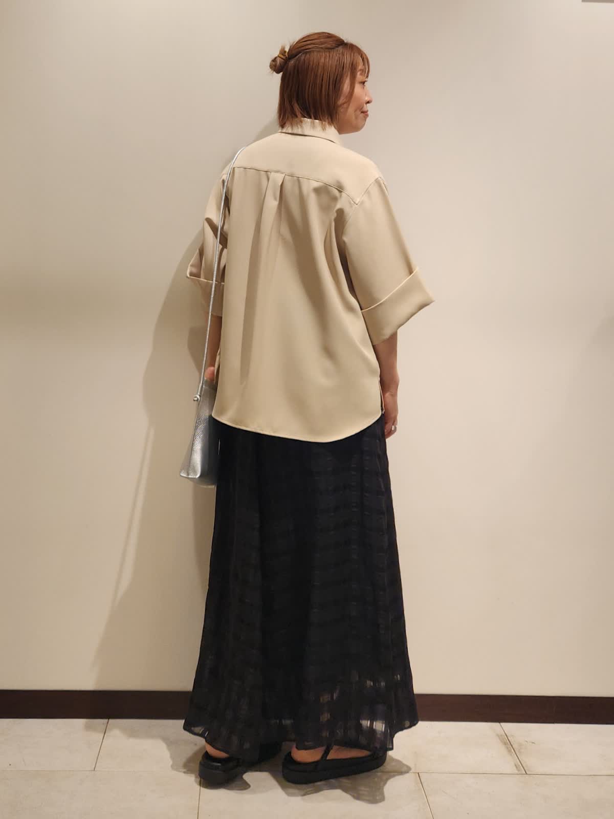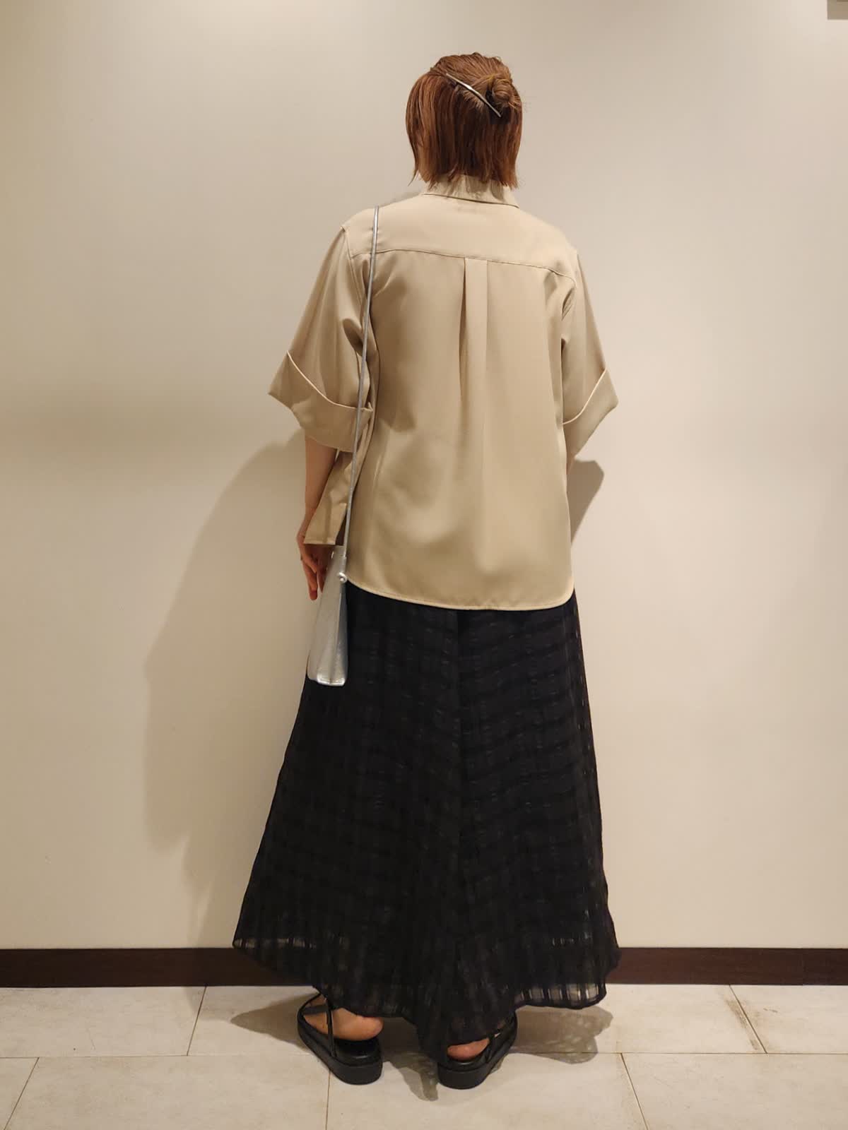 【着用サイズ】すべて9号 【着用カラー】ブラウス:ベージュ スカート:ブラック 三尋木さんブラウスで大人カジュアルコーディネート。 アイテム1つ1つの上品さを活かしながら小物はカジュアルにした事でバランスを取りました。ブラウスの特徴的なカラーをブラックスカートで最大限に魅せました。スカートはさりげなくシアーチェック柄がポイントです!