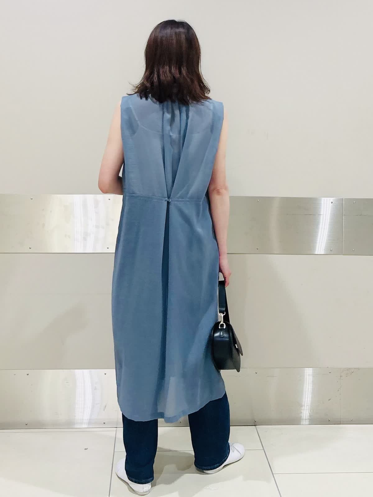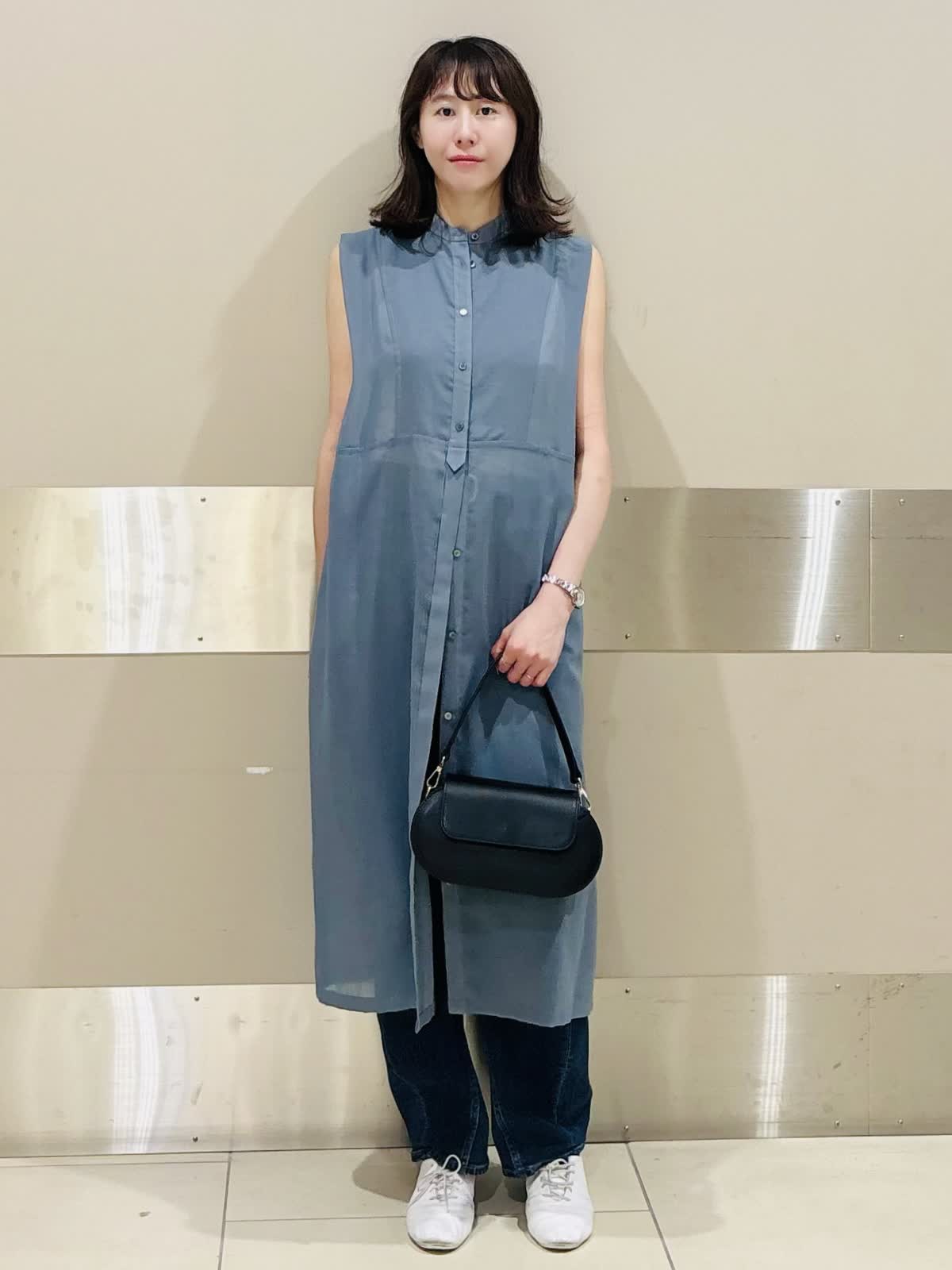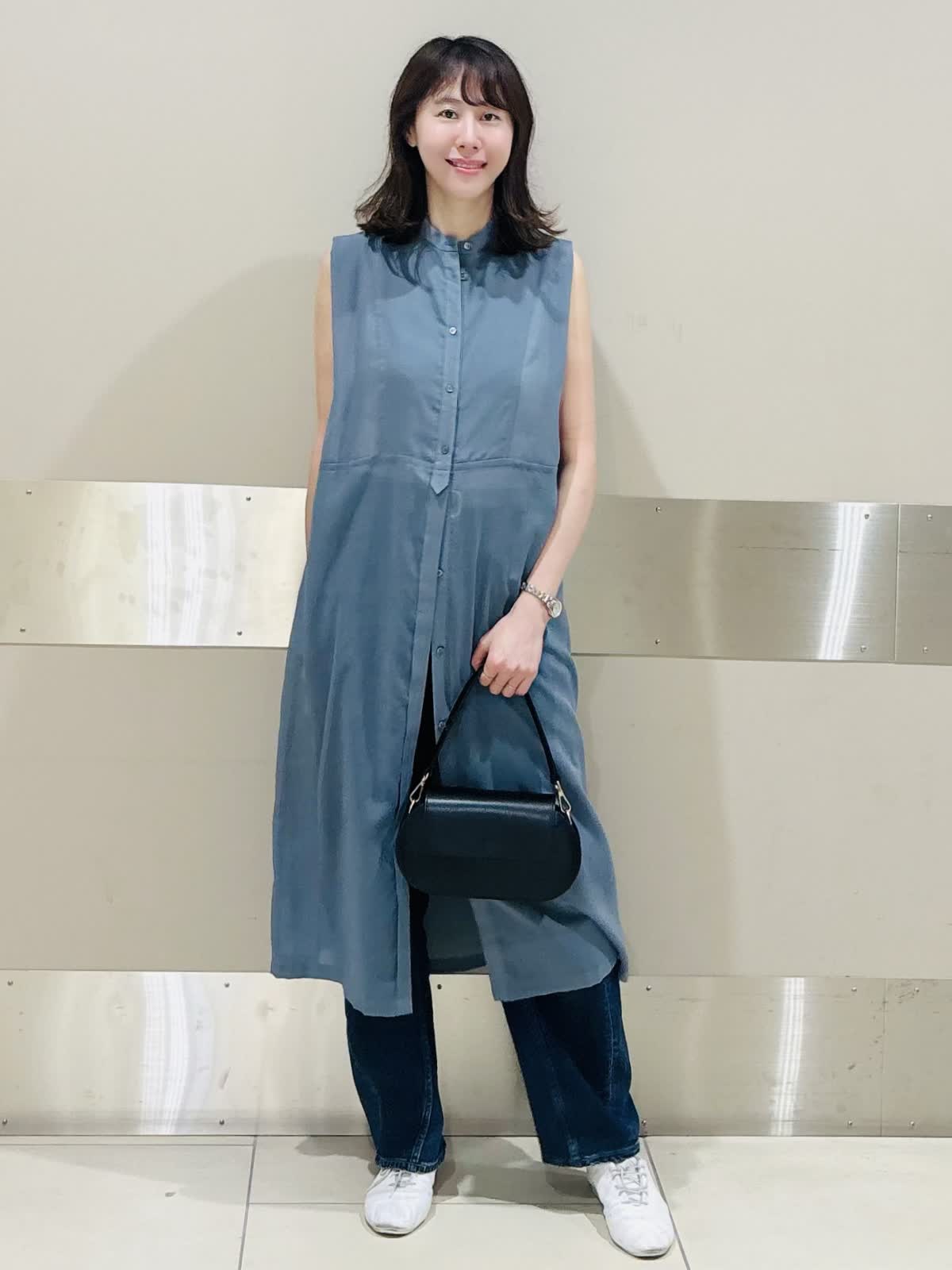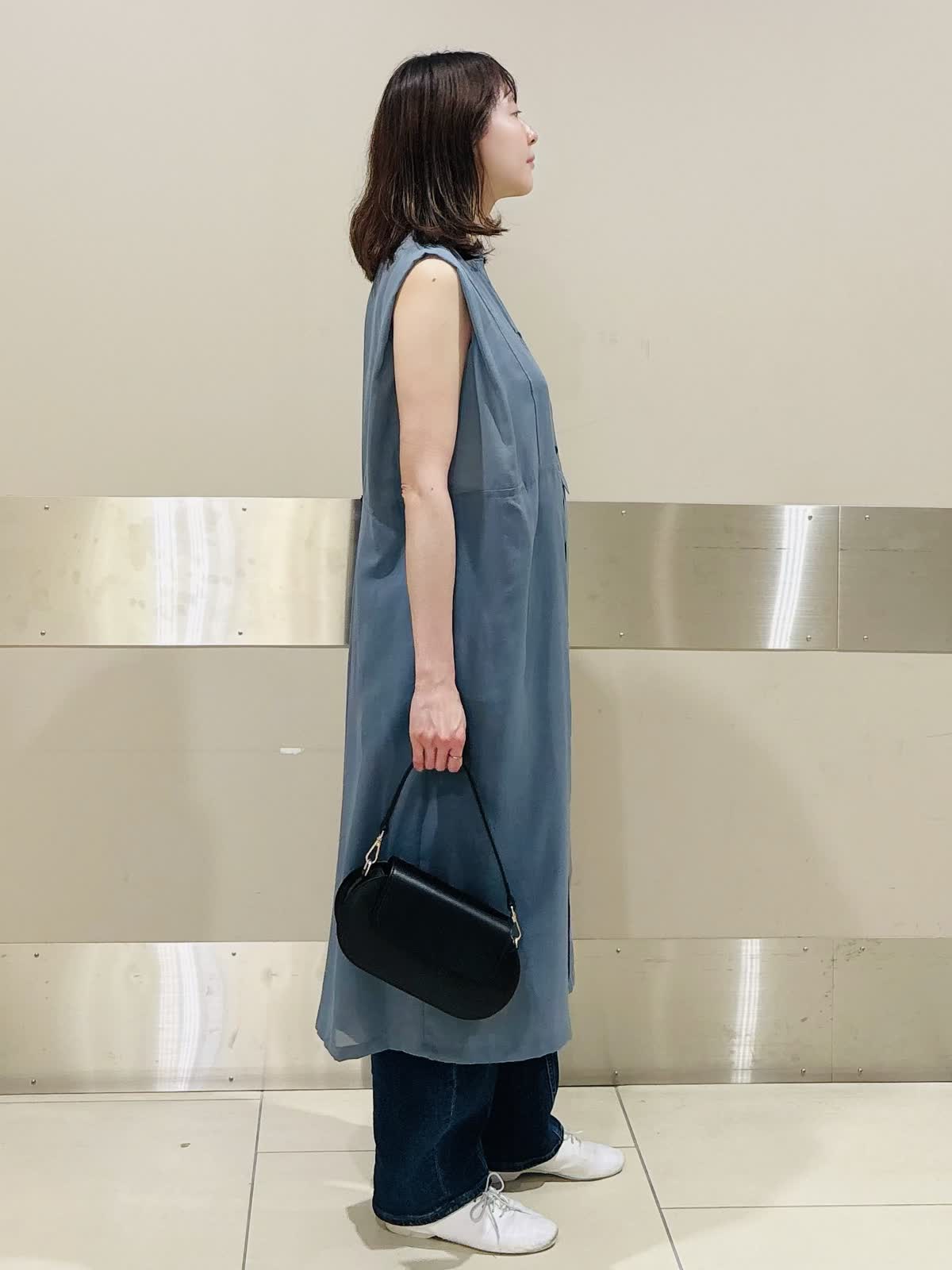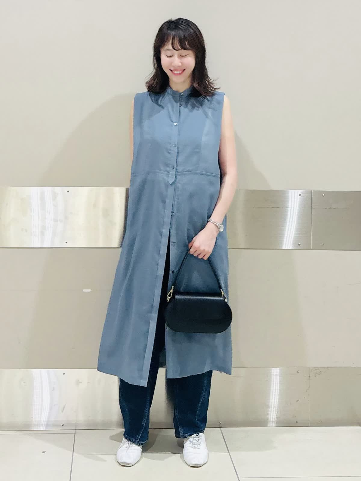 【着用サイズ/カラー】ワンピース:9神戸/ブルーグリーン カットソー:9号/オフホワイト 今季注目のワンピース×デニムレイヤードは、スモーキーブルーで涼しげな印象に。 ノースリーブの軽やかさと、シャツデザインのきちんと感が絶妙にマッチ。 白スニーカーで爽やかさをプラスし、黒バッグで全体を引き締めた夏の大人カジュアルです。