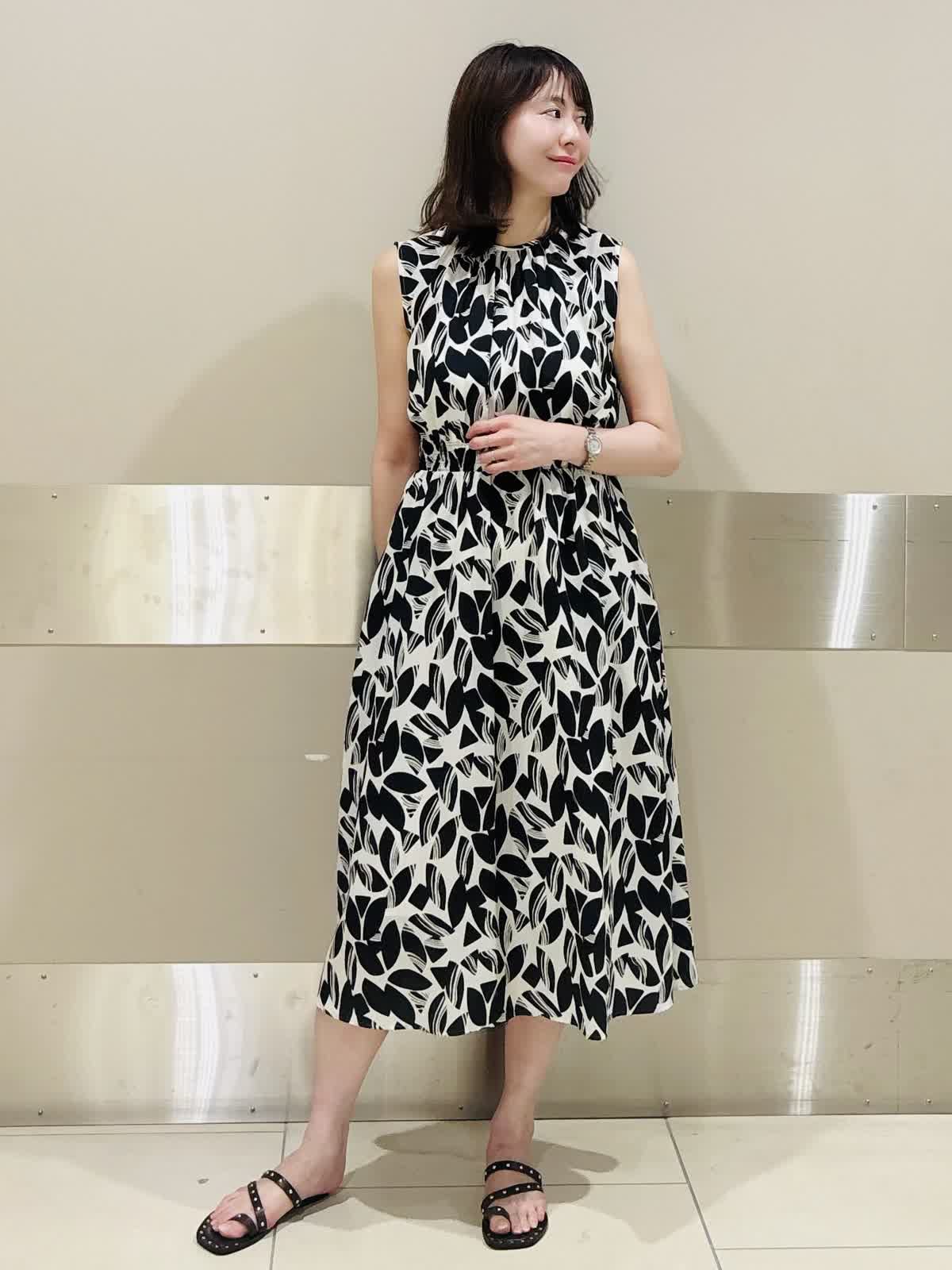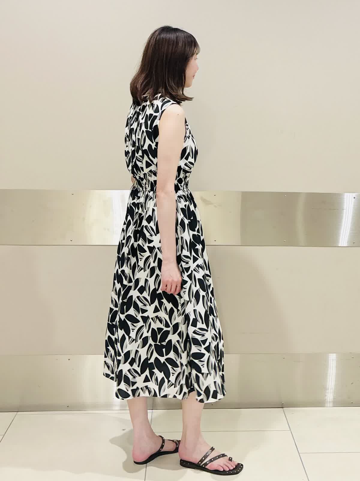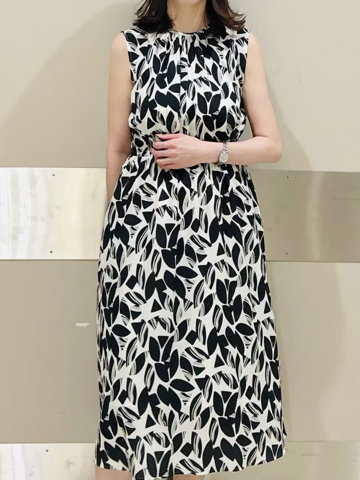 【着用サイズ/カラー】ワンピース:9号/オフホワイト リーフ柄が映えるモノトーンのノースリーブワンピースは、1枚で夏コーデが完成。 シックな配色と軽やかな素材感で、甘さを抑えた雰囲気に。 フラットサンダルでラフに仕上げれば、抜け感たっぷりのリゾートライクなスタイルです。