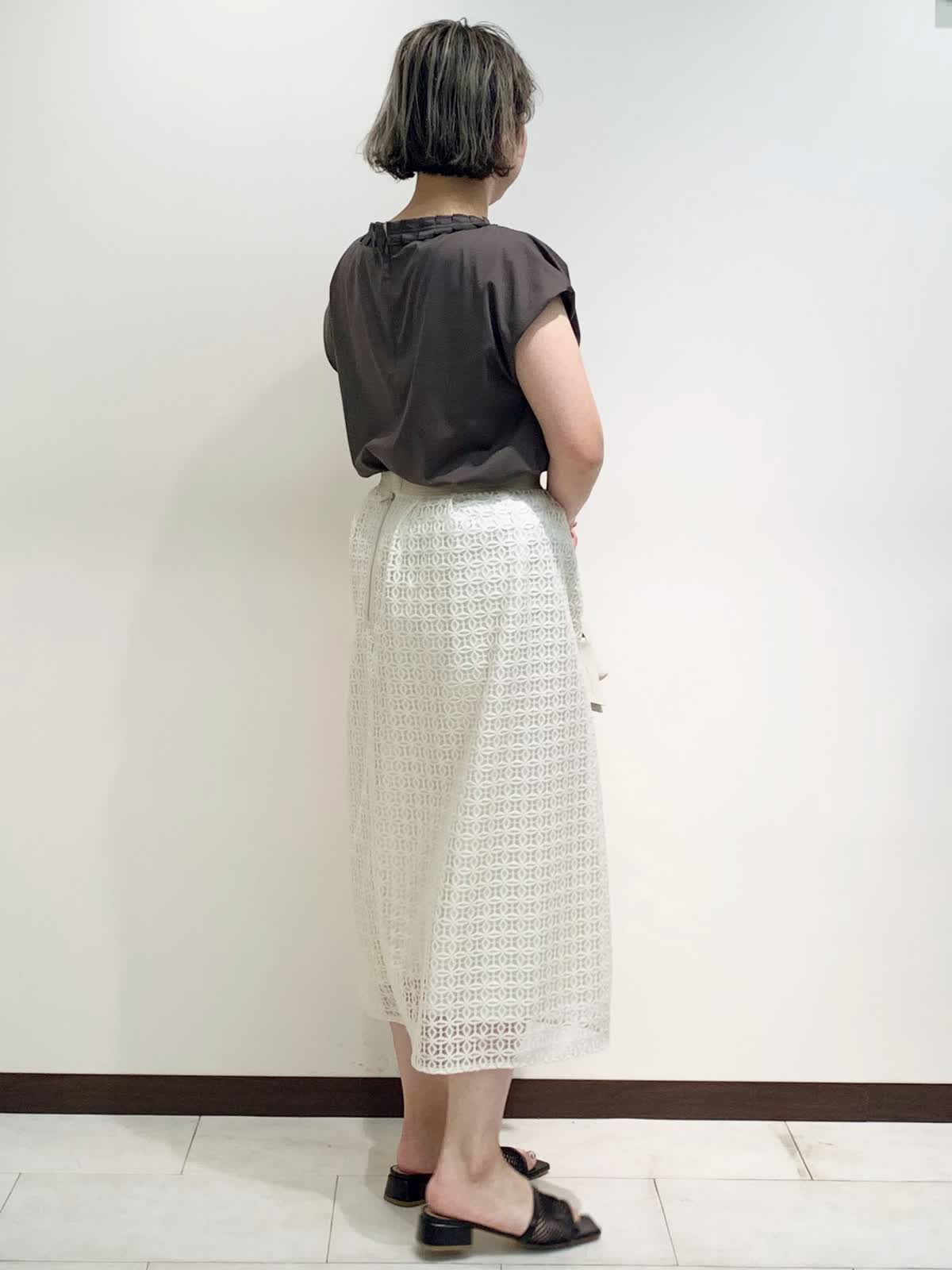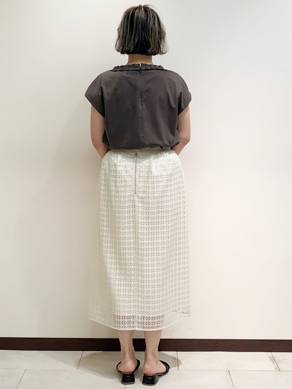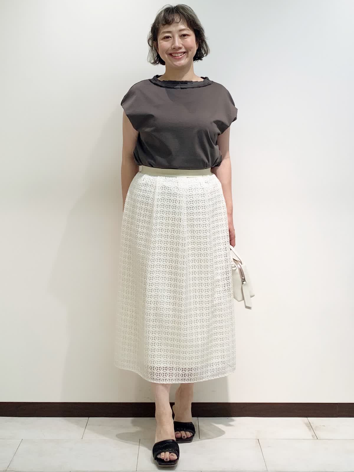 【着用サイズ】トップス:11号 スカート:9号 【着用カラー】トップス:モカチャ スカート:オフホワイト バッグ:オフホワイト 光沢のあるトップスは綿素材で吸湿性が高いため、暑い季節も快適に着られるカットソーです。軽やかなレーススカートと合わせた柔らかいコーディネート。