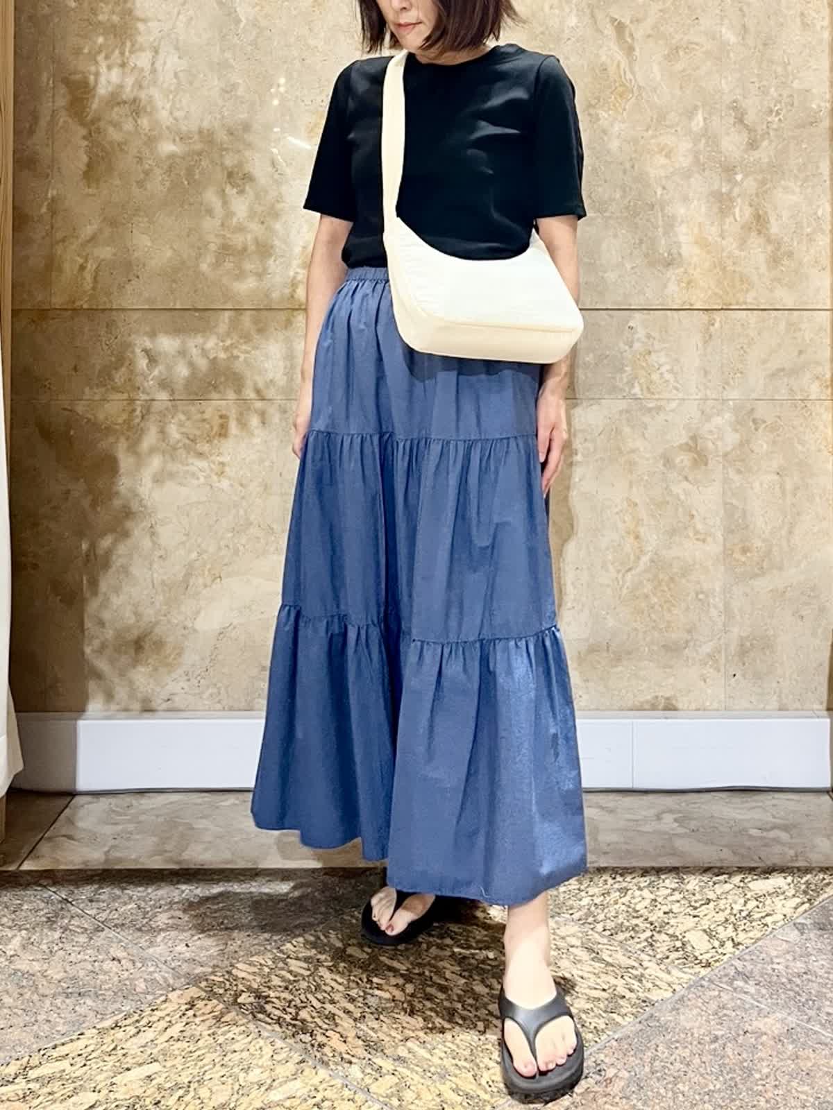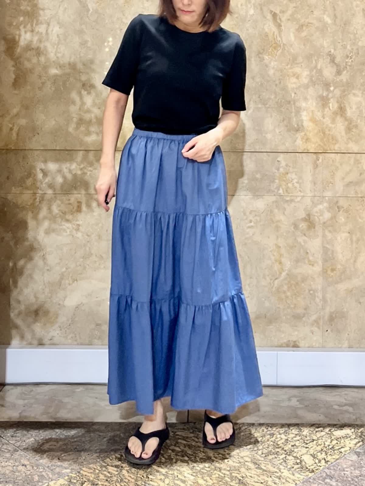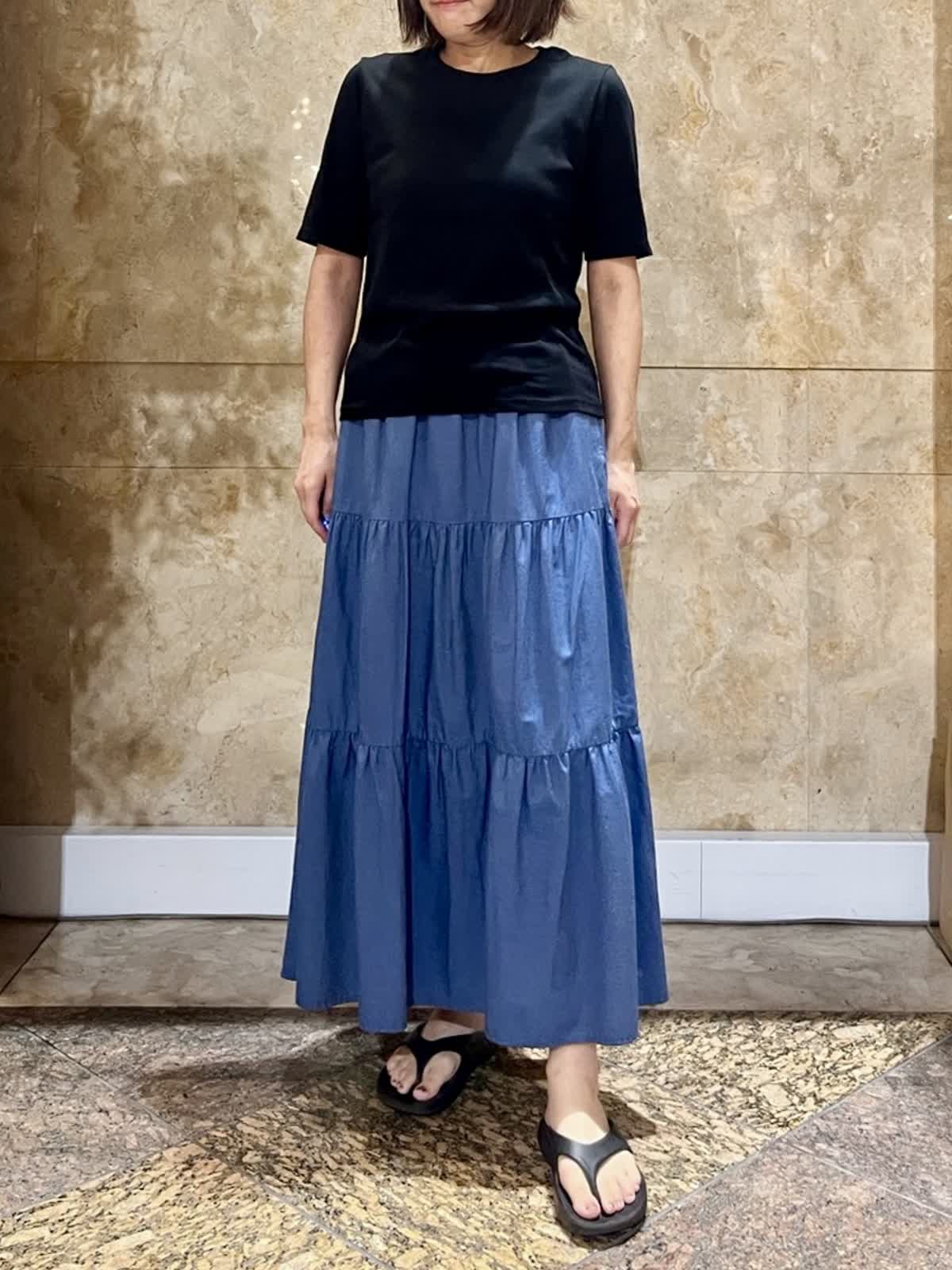 【着用サイズ/カラー】 Tシャツ:11号/ブラック スカート:フリーサイズ/サックス デニムシャツ:フリーサイズ/サックス シンプルなTシャツ×ティアードデニムのカジュアルお出かけスタイル。半袖は長めなので二の腕がしっかり隠れる安心袖。スビンシリーズは形が沢山あるので型違い、色違いで持っておくと便利です◎